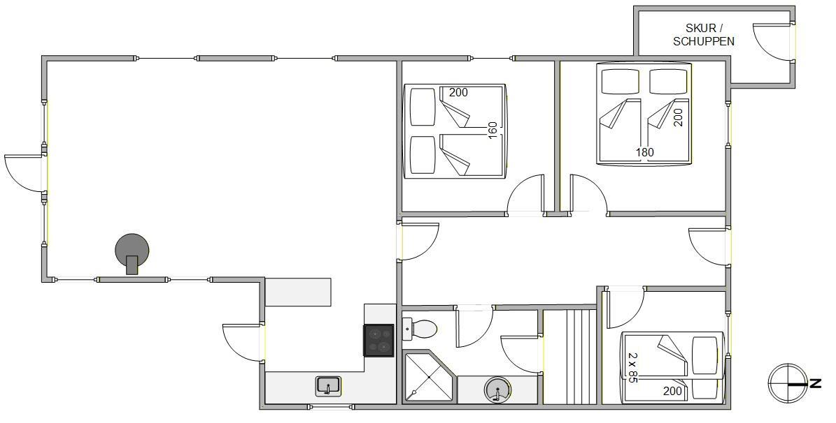 Sommerhusets hjerte er det åbne køkken- og spisestueområde, som automatisk bliver mødestedet i løbet af ferien. Her vil der helt sikkert blive tilbragt mange skønne feriestunder med fælles madlavning, filmhygge og sene aftener på sofaen. Alt i mens kan I nyde varmen og ildens dansen i brændeovnen. Sommerhuset har desuden en energibesparende varmepumpe, som I med fordel kan benytte jer af til at holde en behagelig temperatur.