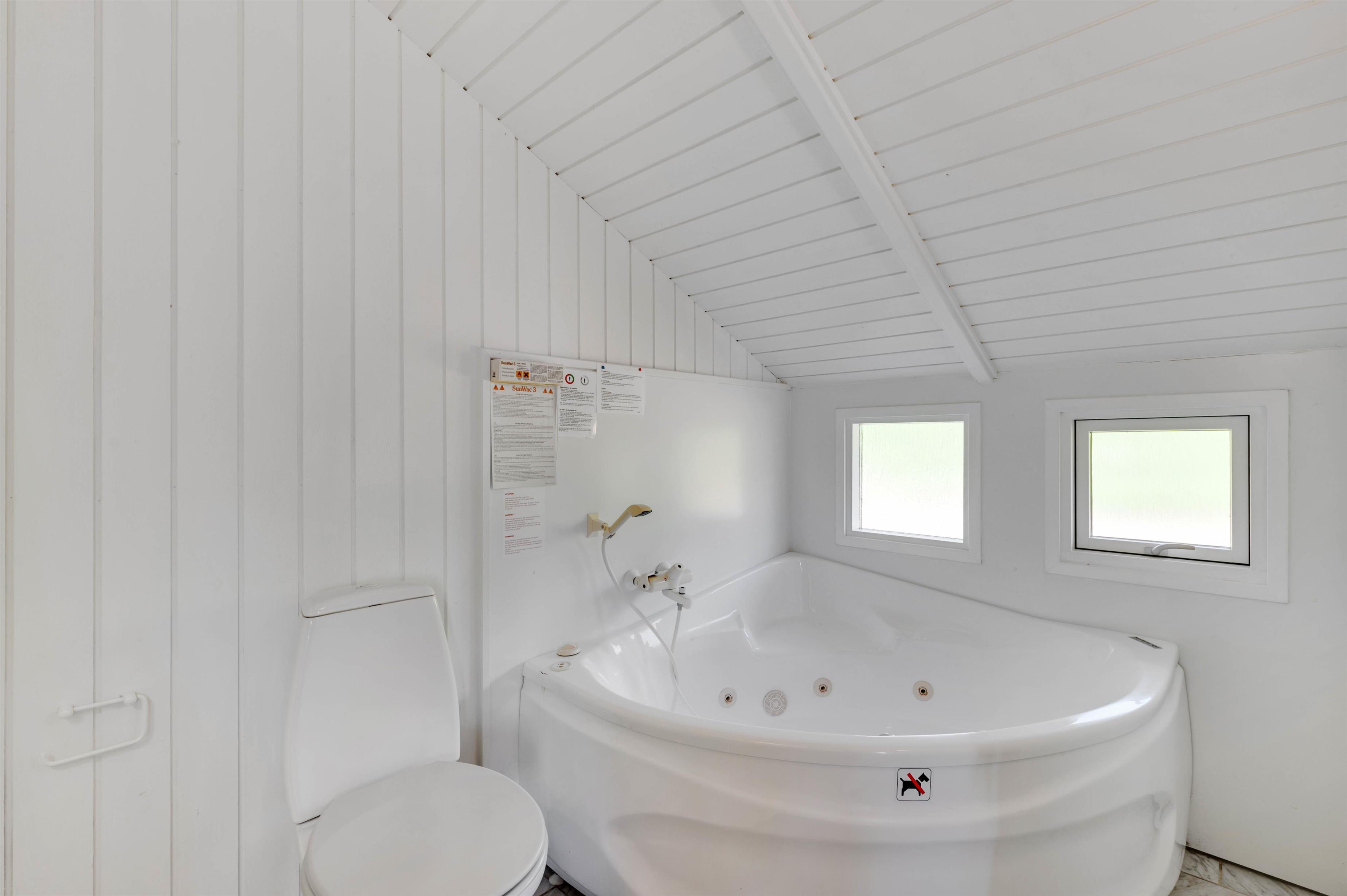 Der er et godt badeværelse med gulvvarme samt et gæstetoilet. Med både sauna og hjørnespa kan I holde jeres helt egen wellnessferie - dejligt især på kølige efterårsdage, når man godt forblæst vender hjem fra en lang gåtur med hunden på stranden. Med både vaskemaskine og tørretumbler i sommerhuset, er der ingen fare for at løbe tør for rene håndklæder.