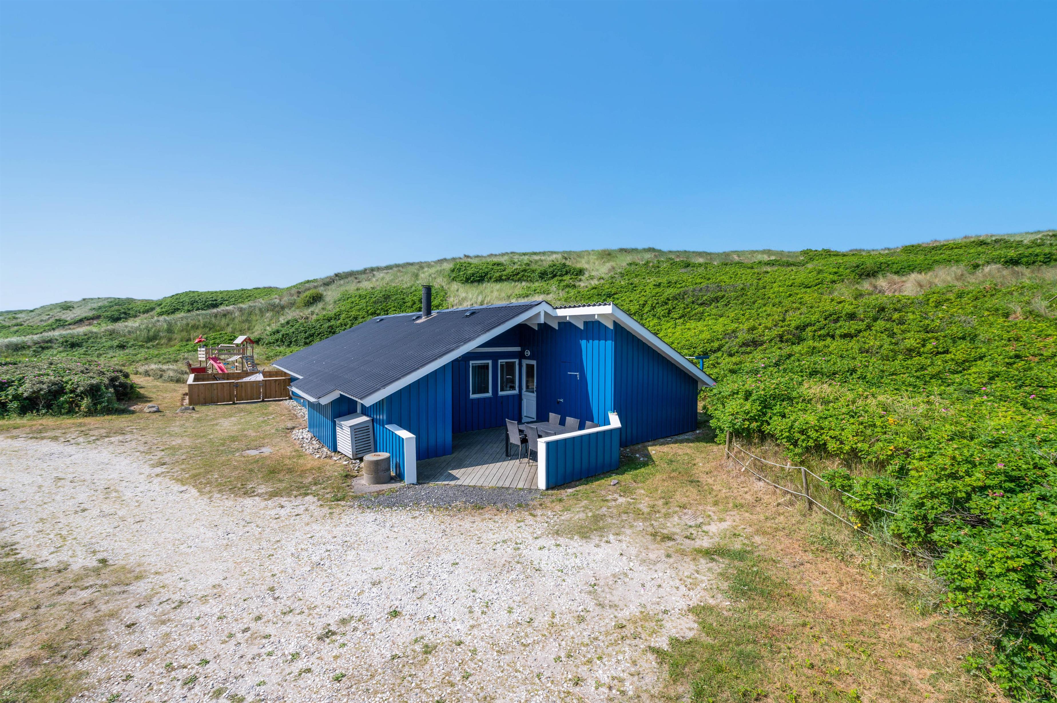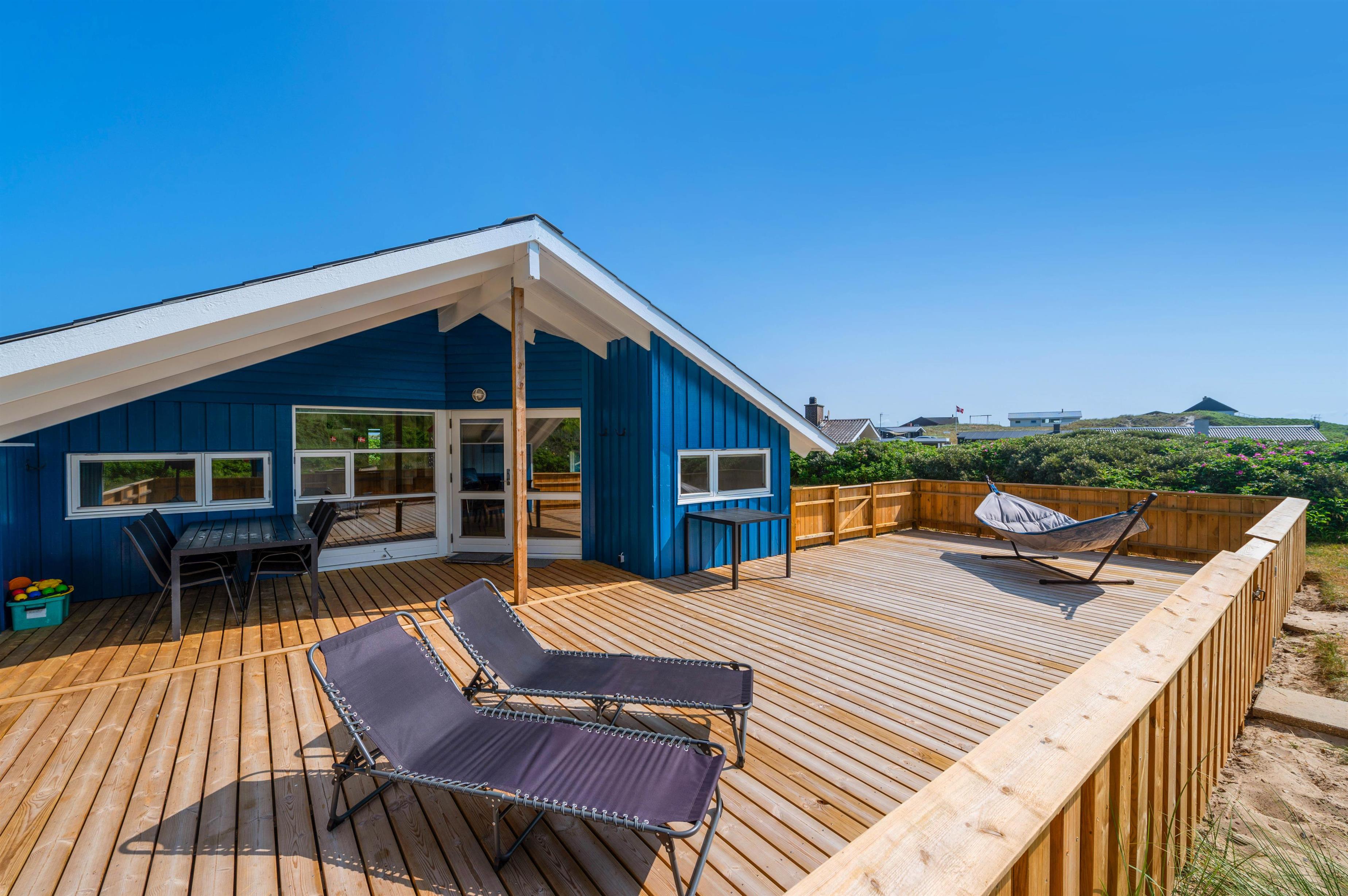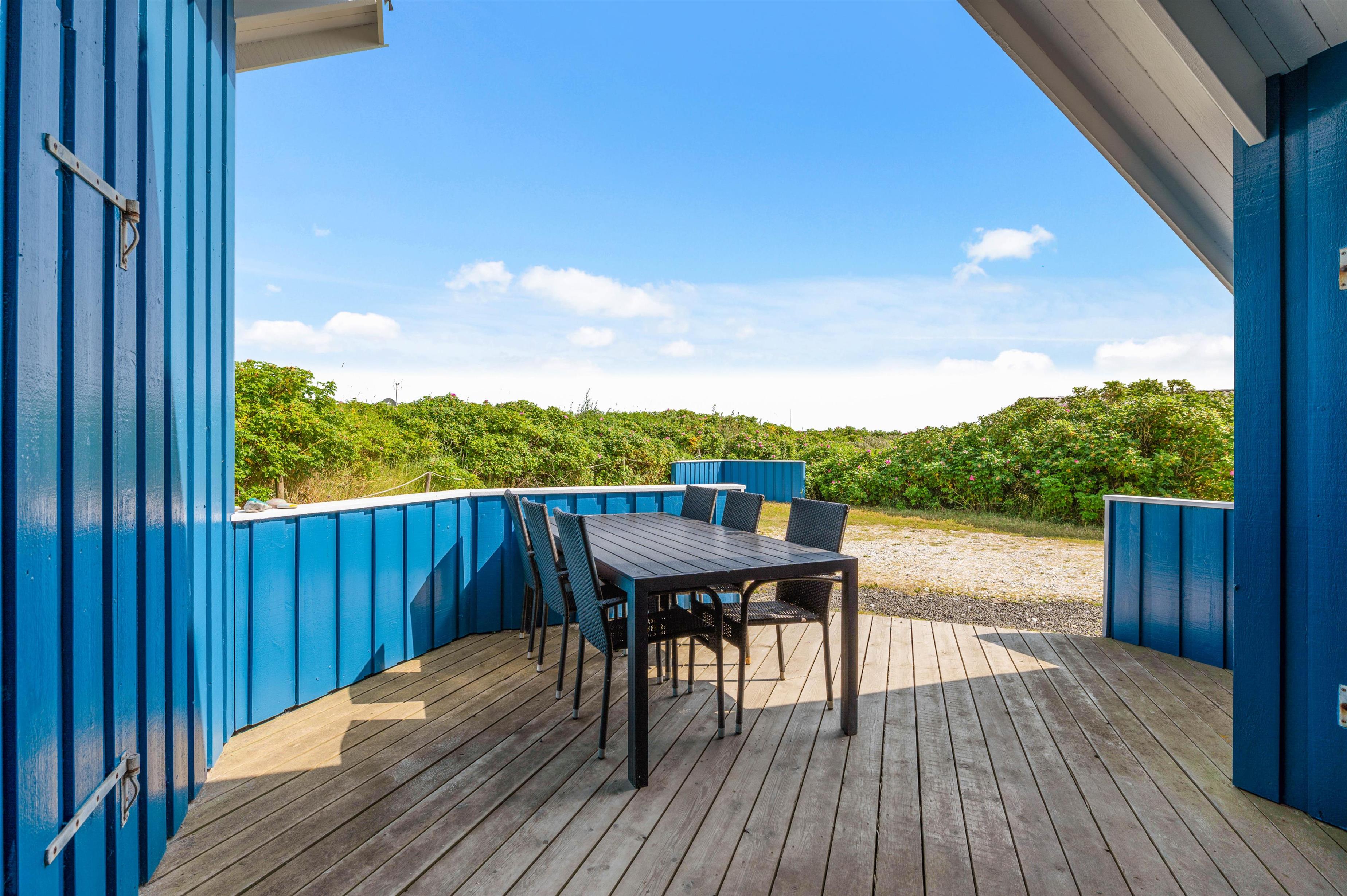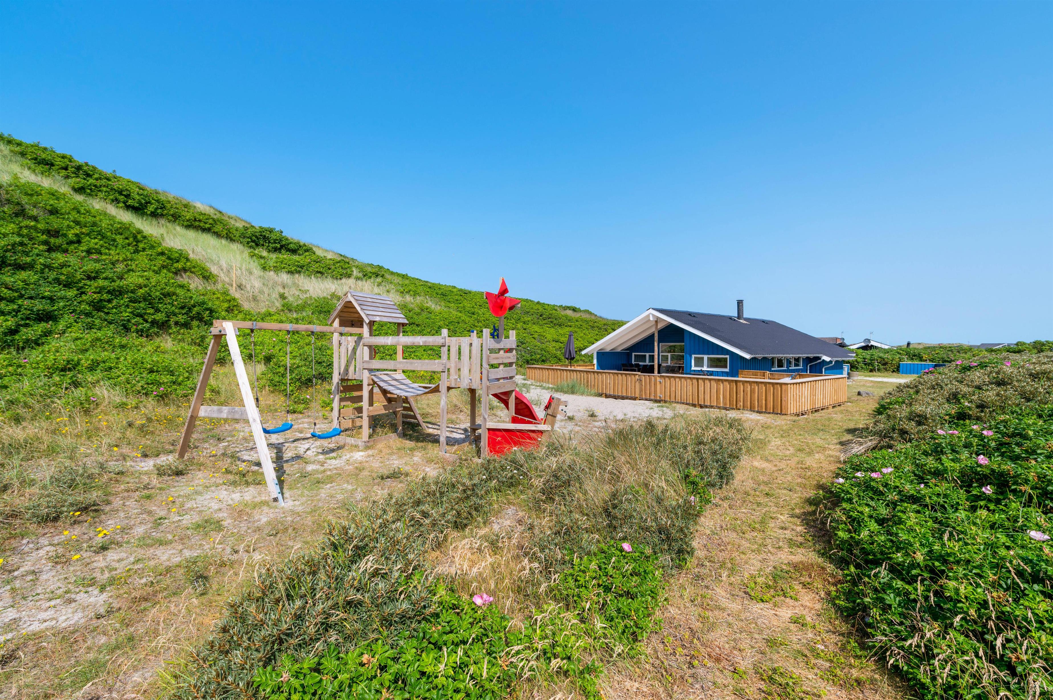 Rauhesvej 76 har en skøn og helt lukket sydvendt terrasse. Den er desuden delvist overdækket og delvist afskærmet. Fra terrassen er der en smuk udsigt til klitlandskabet, som fuldendes af den friske duft fra Vesterhavet. Her er der mulighed for hyggelige grillaftener, ligesom terrassen og gyngerne ved sommerhuset er ideel for familier med små børn og hund.
