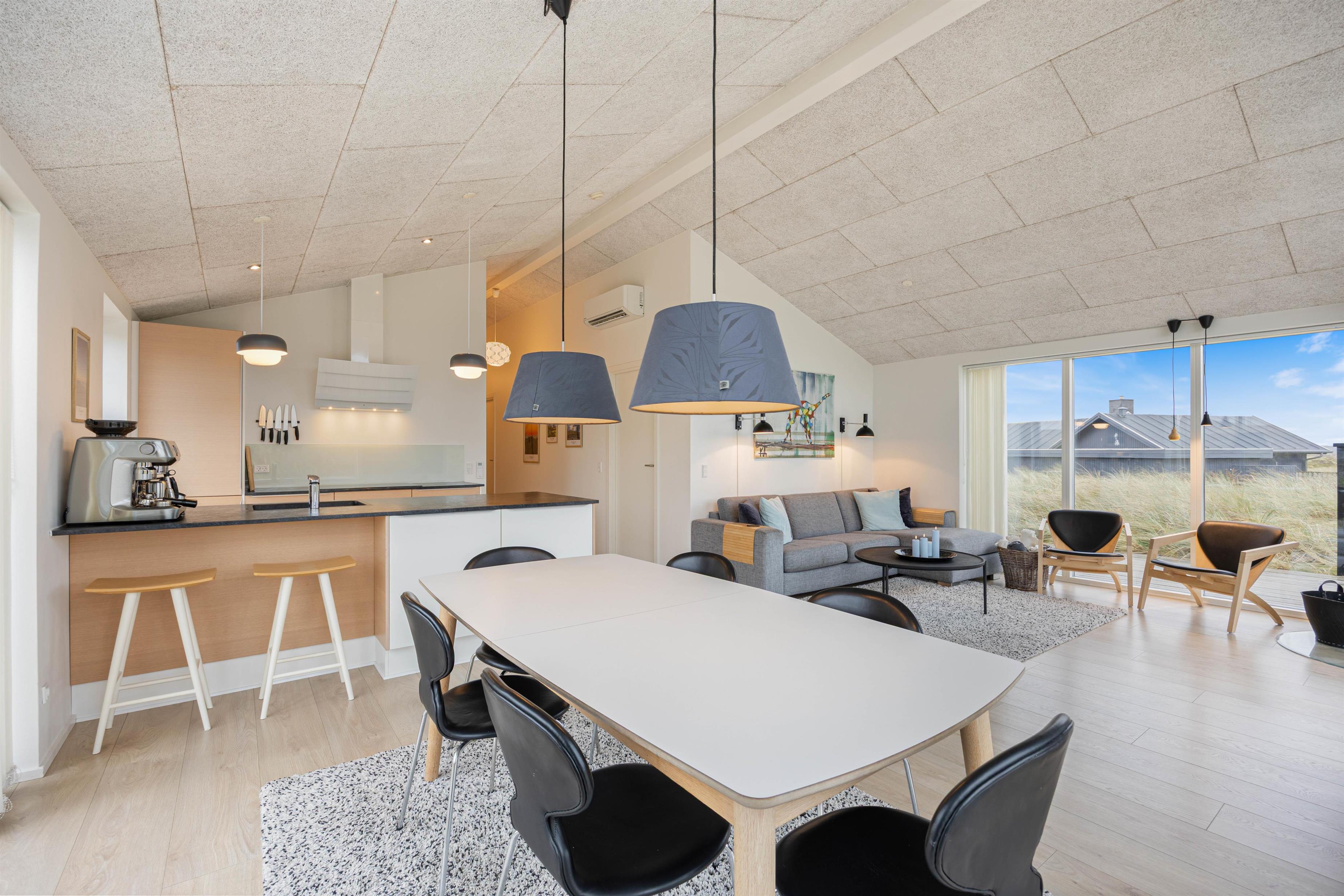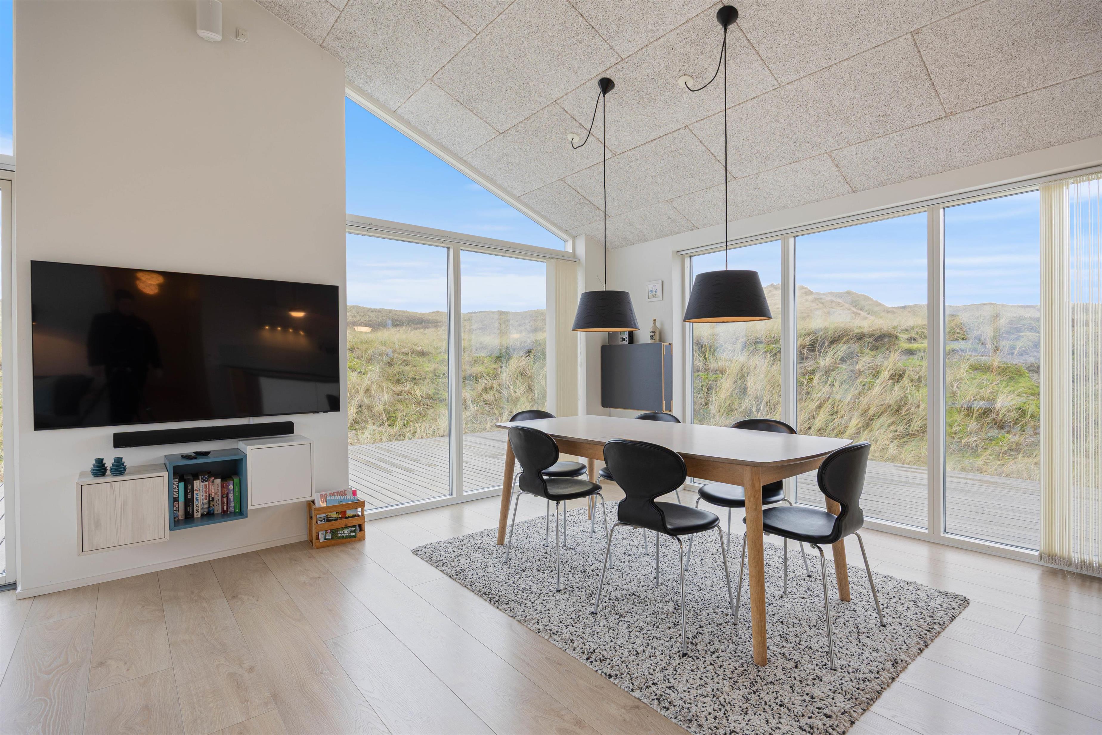 Når du bor i første klitrække, som i dette sommerhus, bliver du nærmest ét med naturen. De bølgende marehalmsklædte klitter og det fredede hedeareal mod syd er ren helse for sjælen. Og du har næsten altid mulighed for at opholde dig på terrassen, idet den strækker sig hele vejen rundt om feriehuset. Fra terrassen er både duften og lyden af Vesterhavet en vanedannende oplevelse – ikke mærkeligt, at mange vender tilbage hertil år efter år.