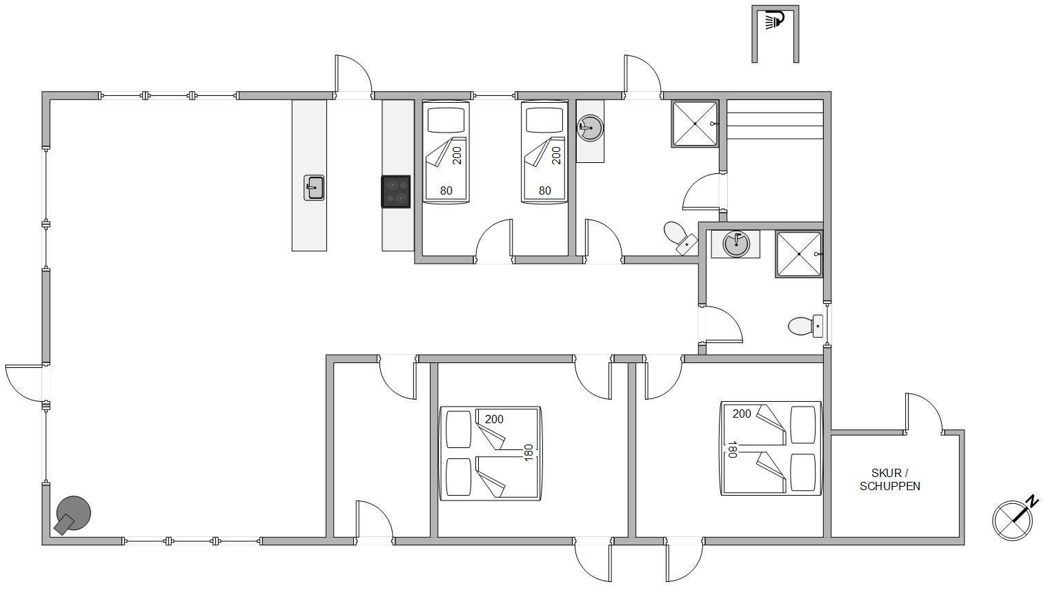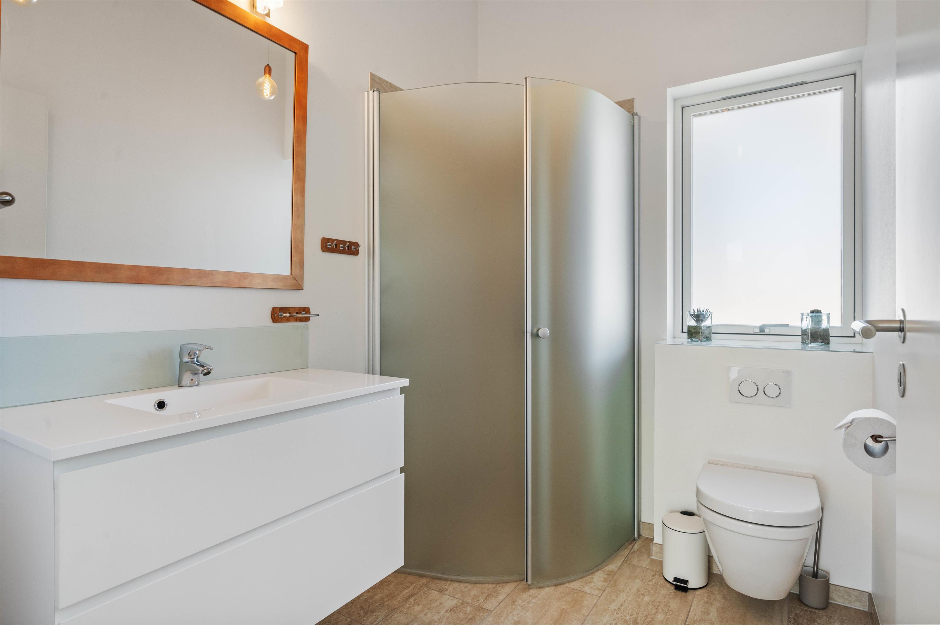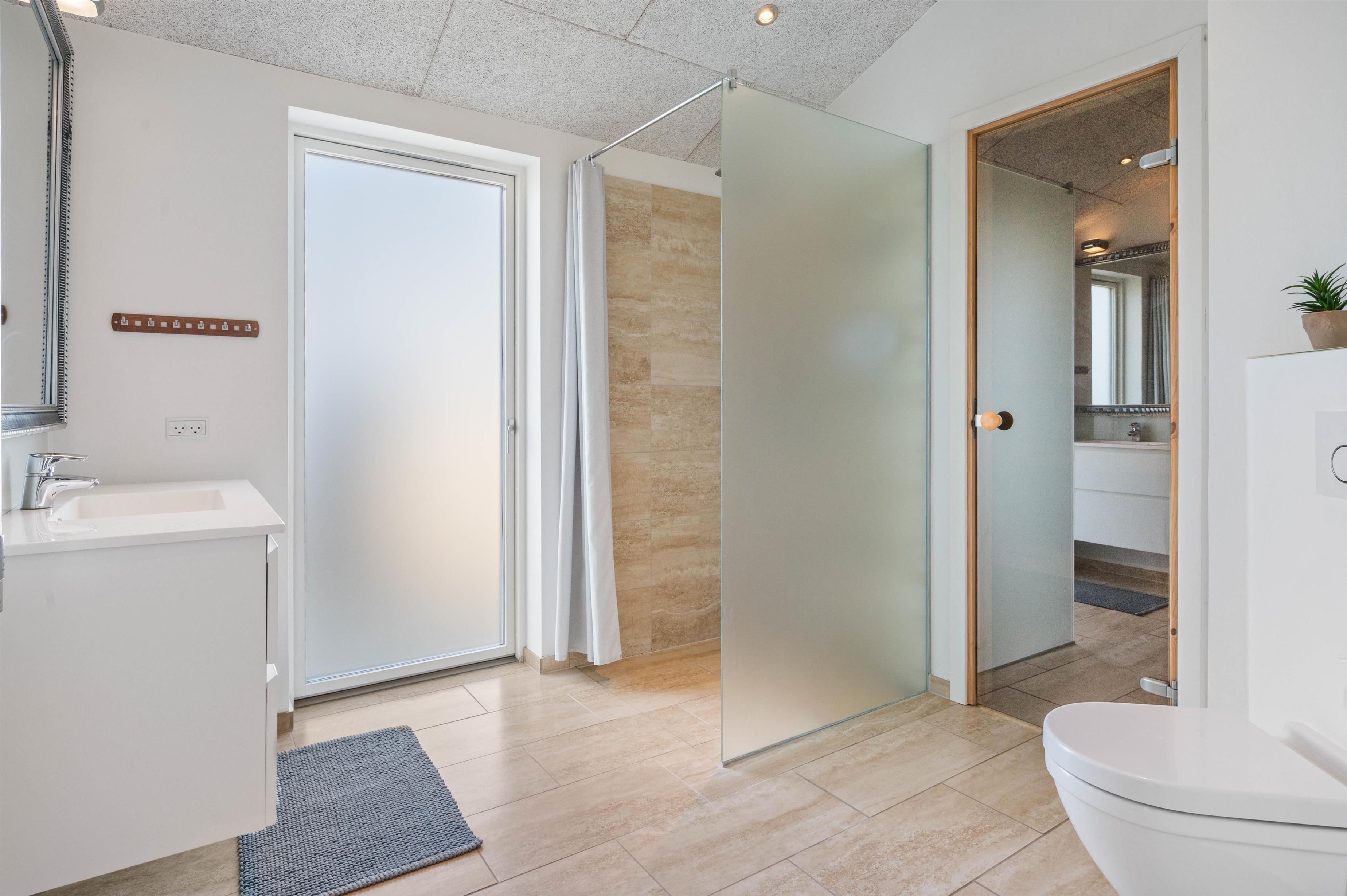 Der er to gode badeværelser, hvor der er sauna med 3 bænke i det ene. Udebruseren giver en frisk afkøling om sommeren, når dagene er varme eller sanden skylles af fødderne.