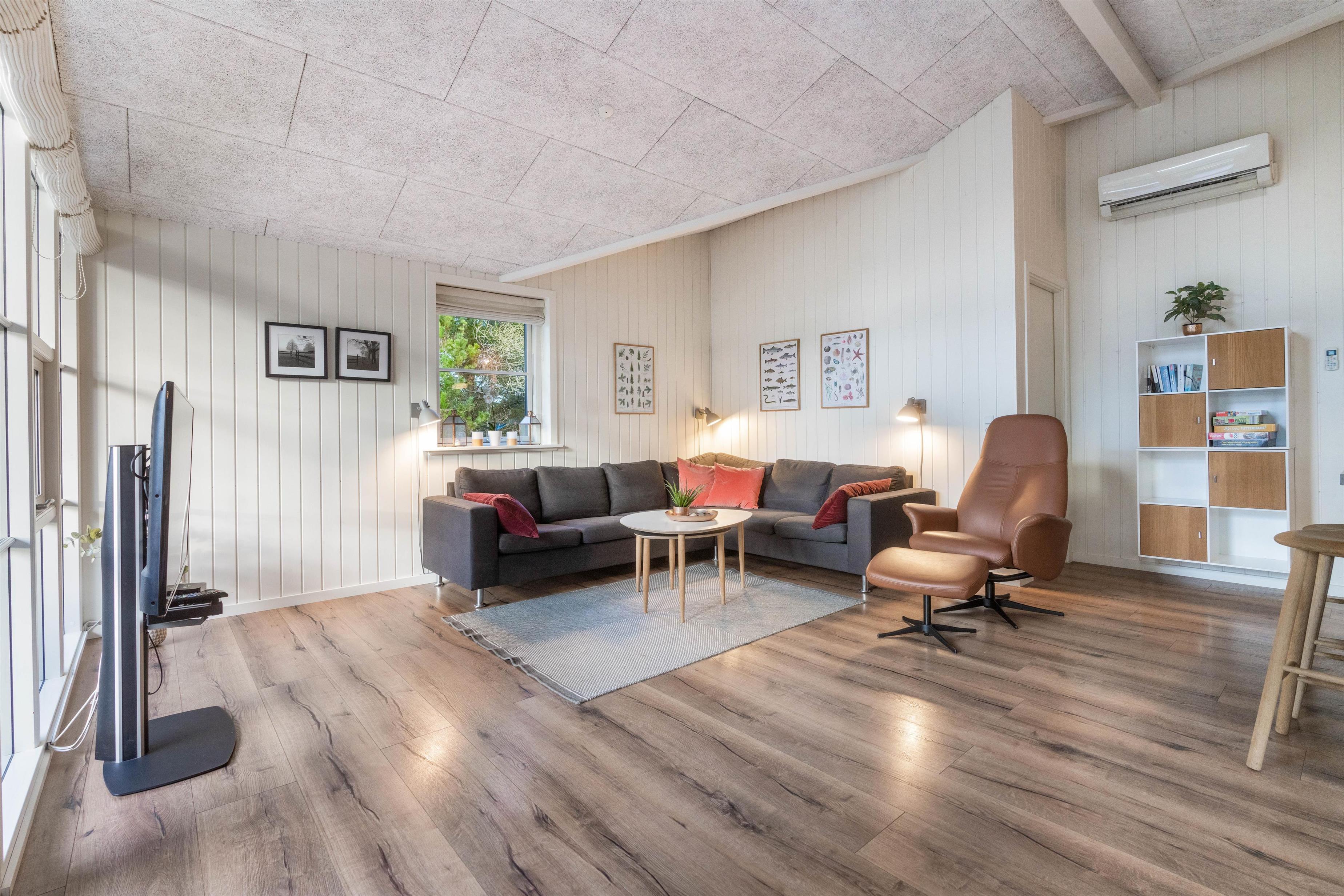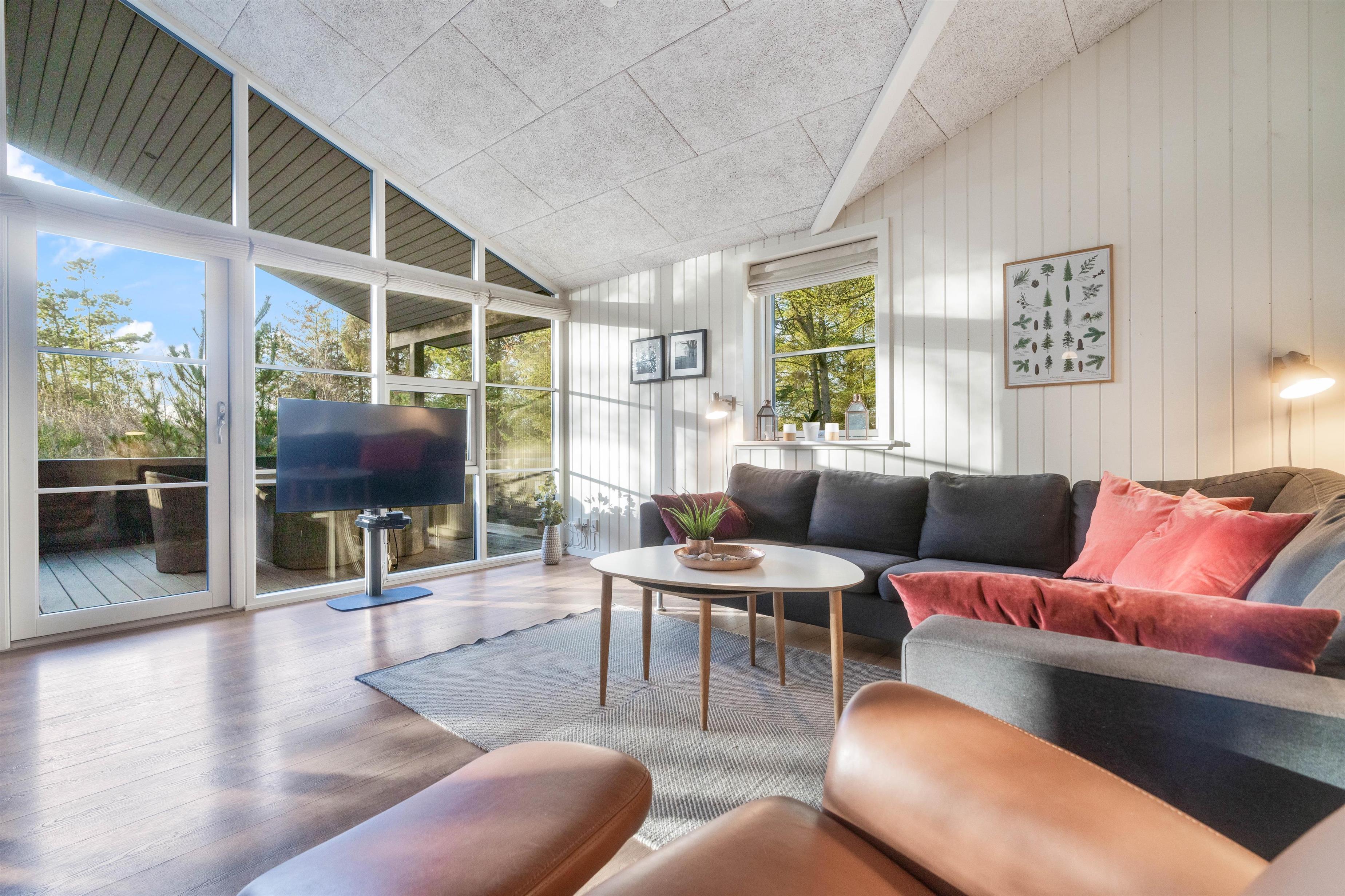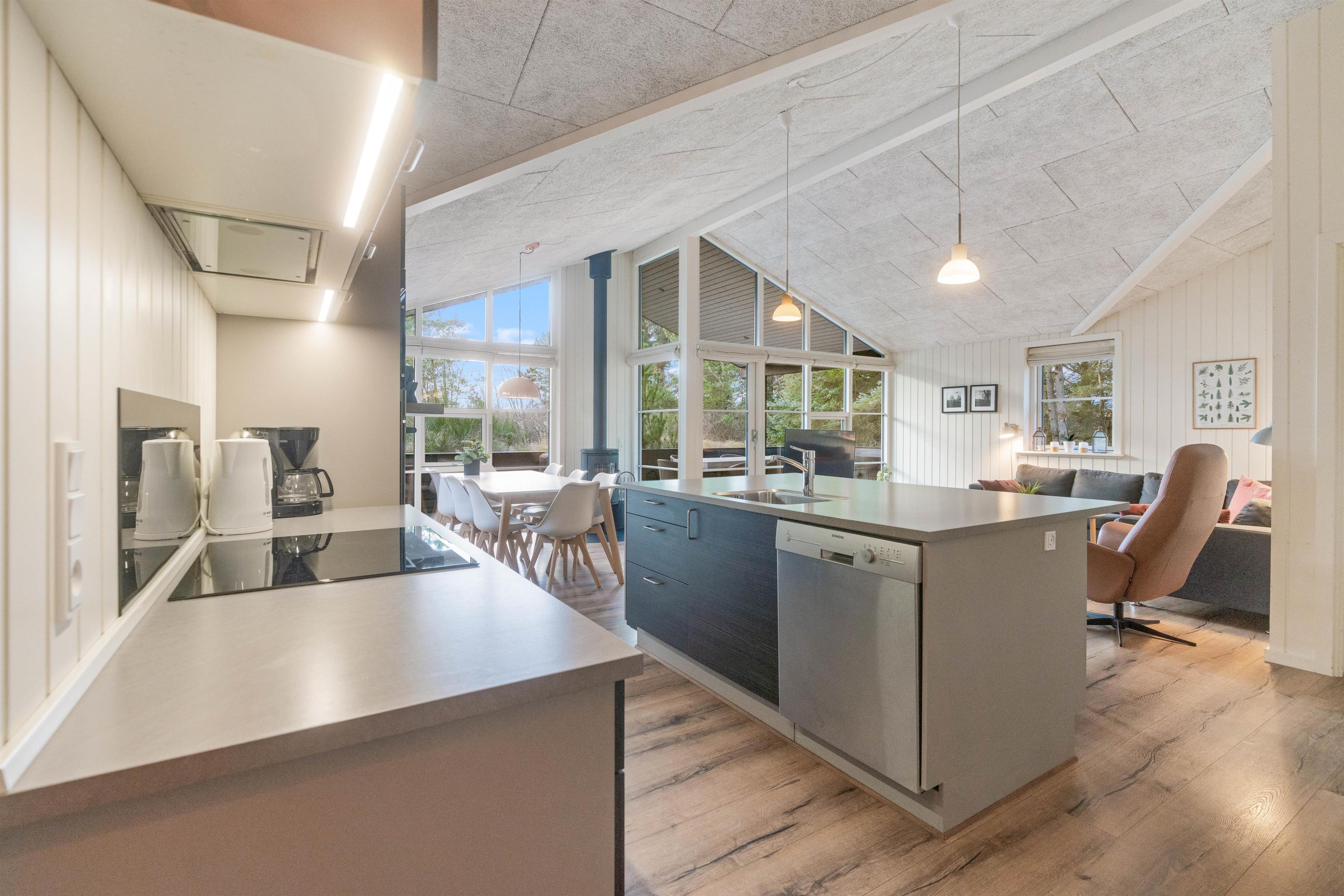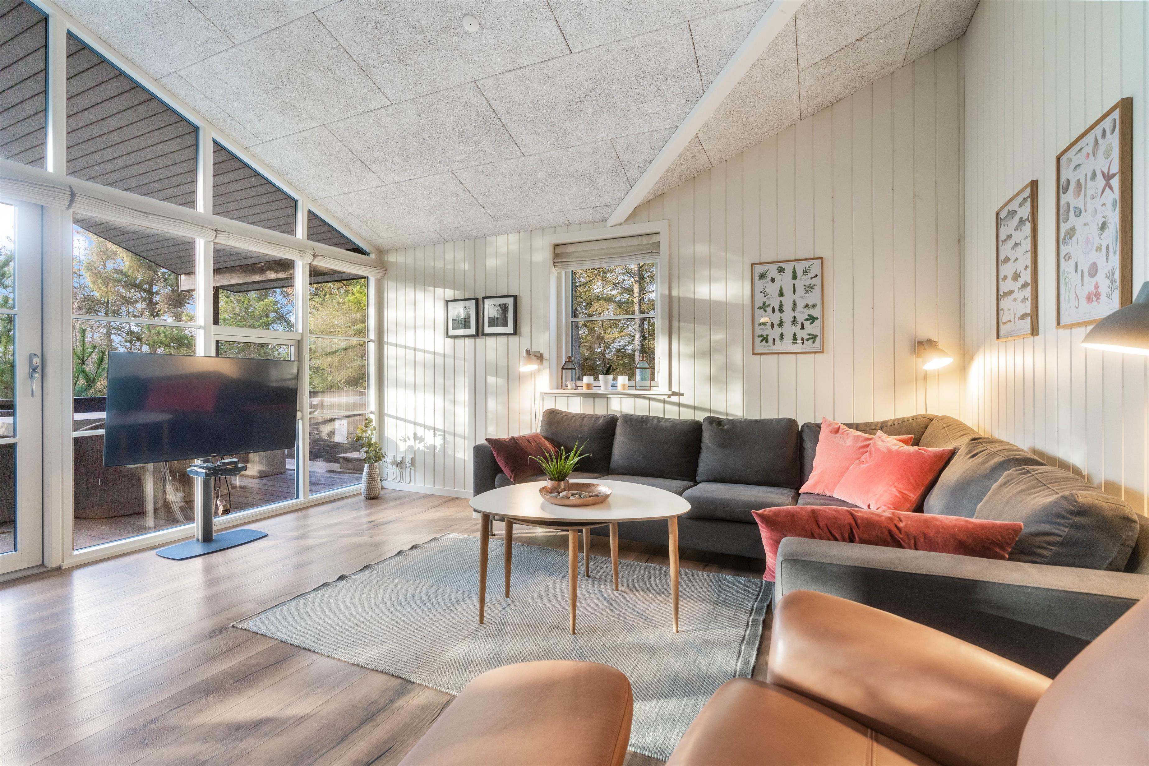 Sommerhusets varmepumpe og de energivenlige vinduer giver lavere el-omkostninger end i ældre huse. Og det flotte loft til kip giver både lys og luft, og det får sommerhuset til at virke større. Har man været en tur ved Vesterhavet er ild i brændeovnen en perfekt afslutning på dagen. Feriehusets gode fladskærms-TV er velegnet til gode film og fodbold.
