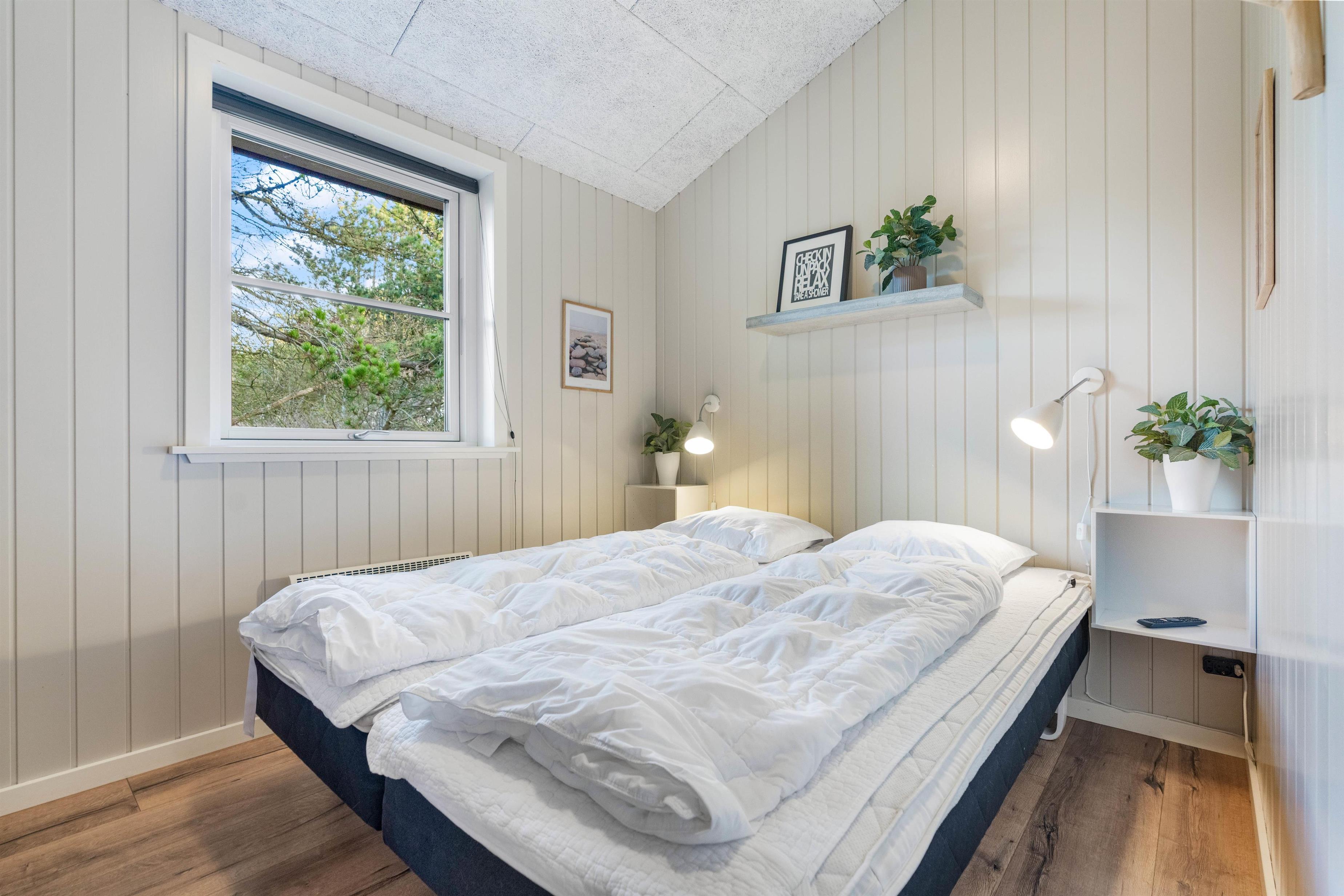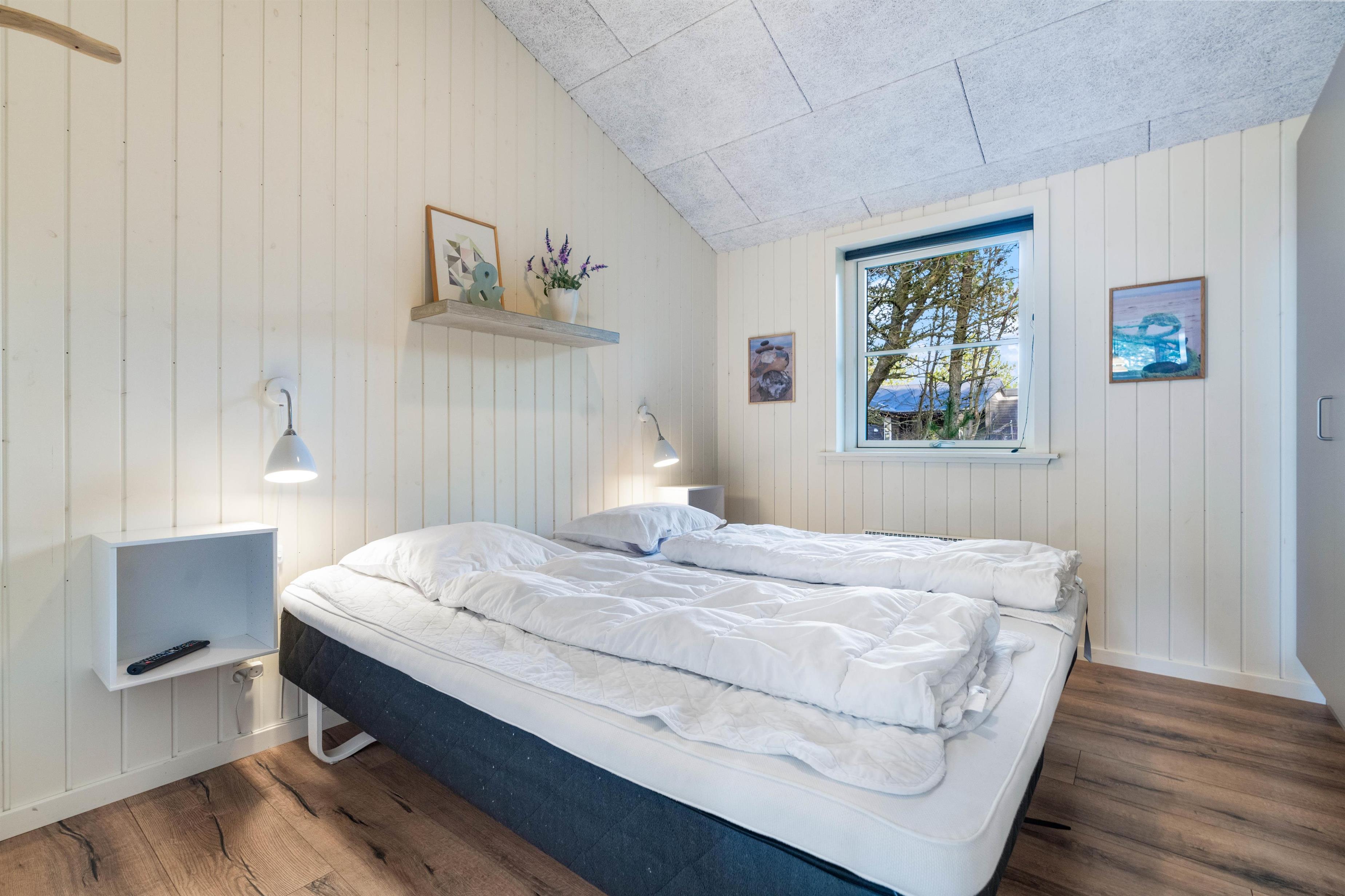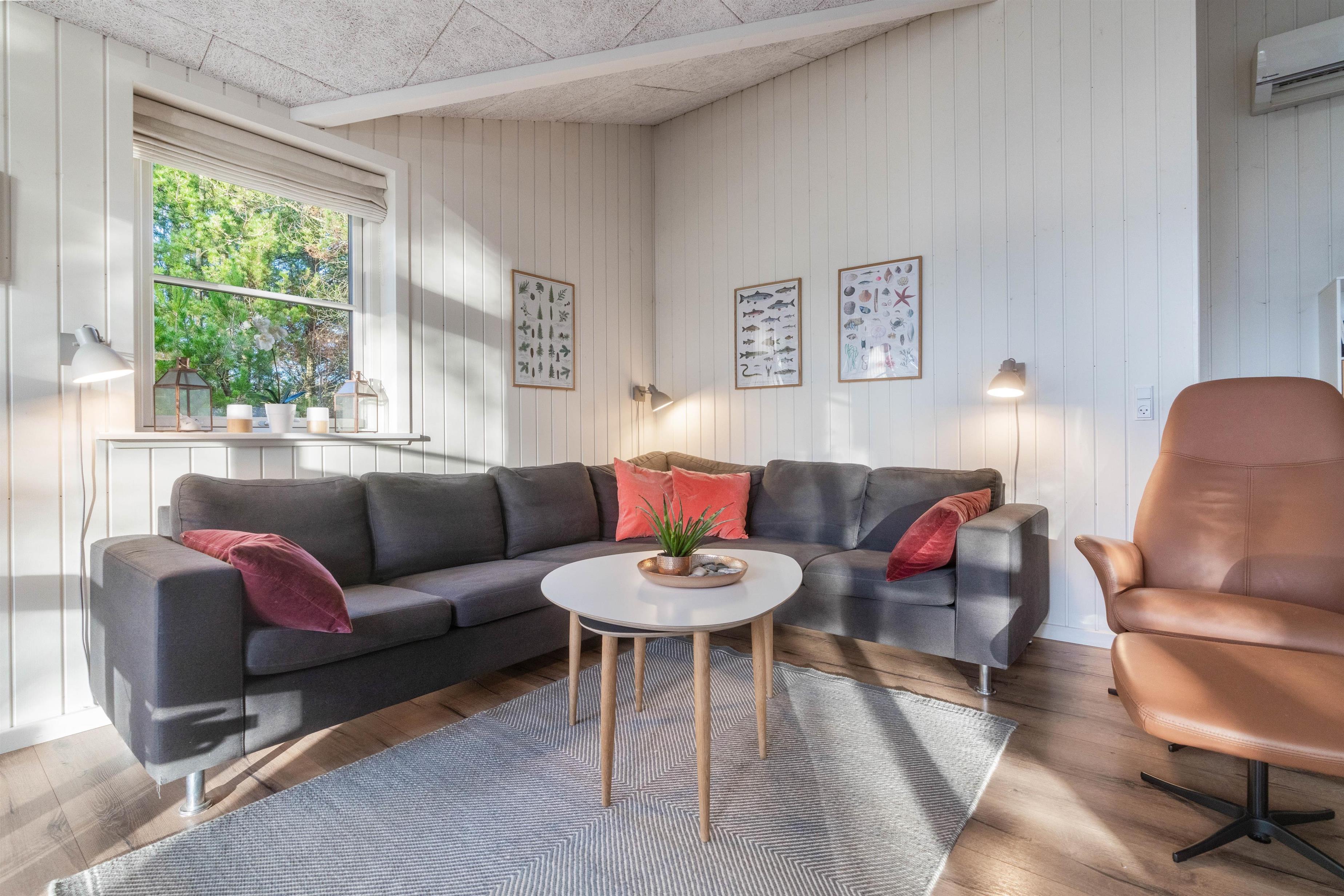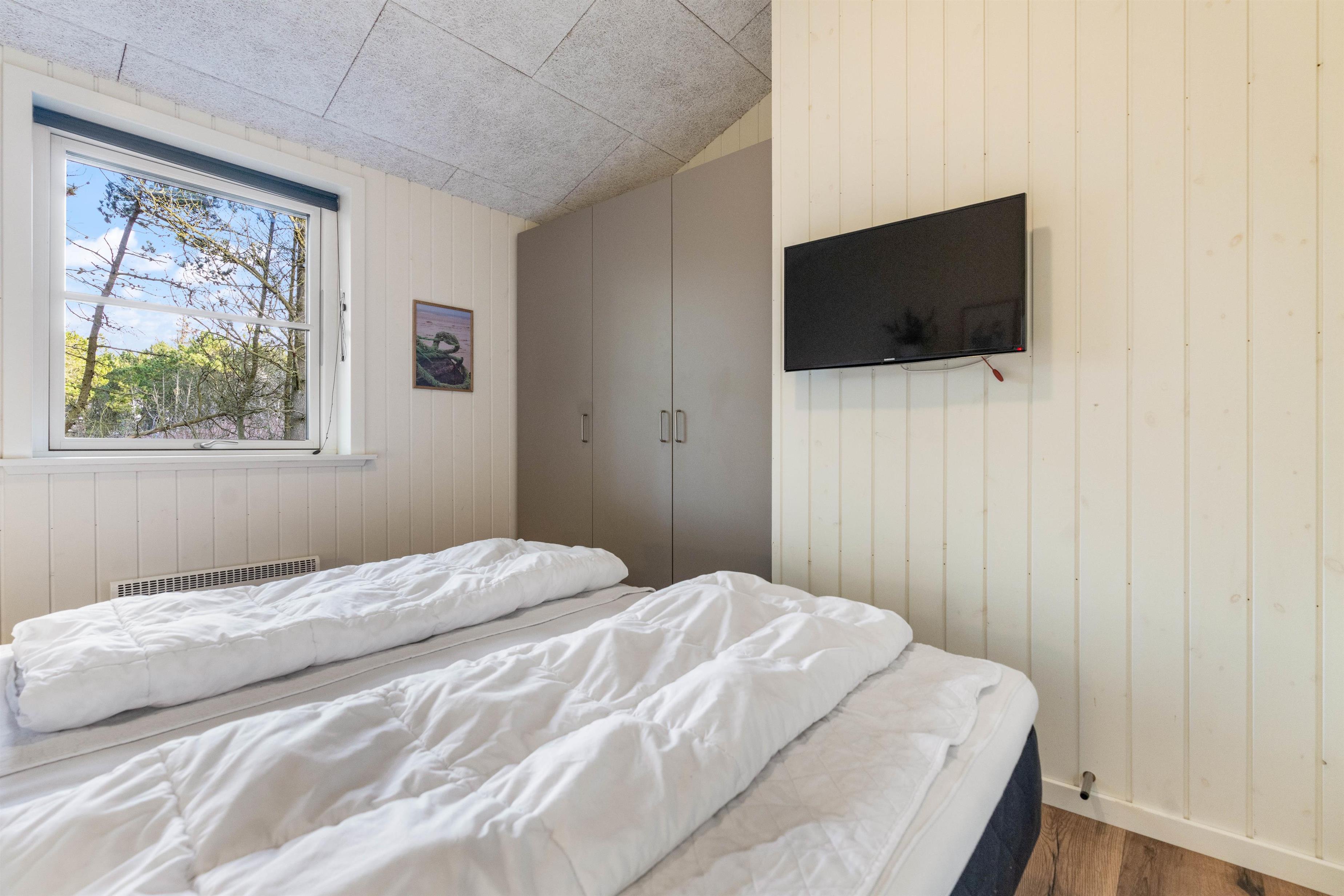 Sommerhusets varmepumpe og de energivenlige vinduer giver lavere el-omkostninger end i ældre huse. Og det flotte loft til kip giver både lys og luft, og det får sommerhuset til at virke større. Har man været en tur ved Vesterhavet er ild i brændeovnen en perfekt afslutning på dagen. Feriehusets gode fladskærms-TV er velegnet til gode film og fodbold.