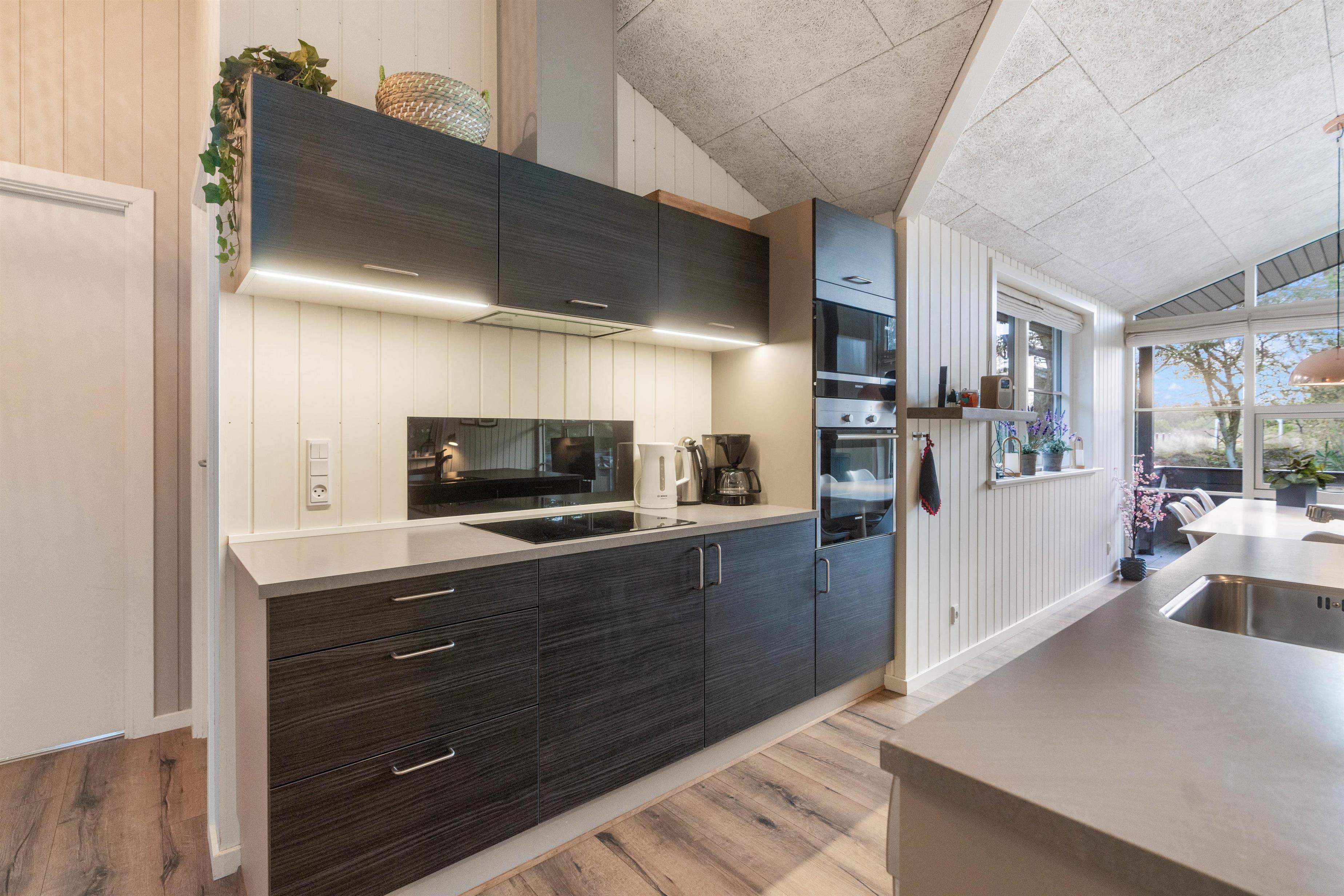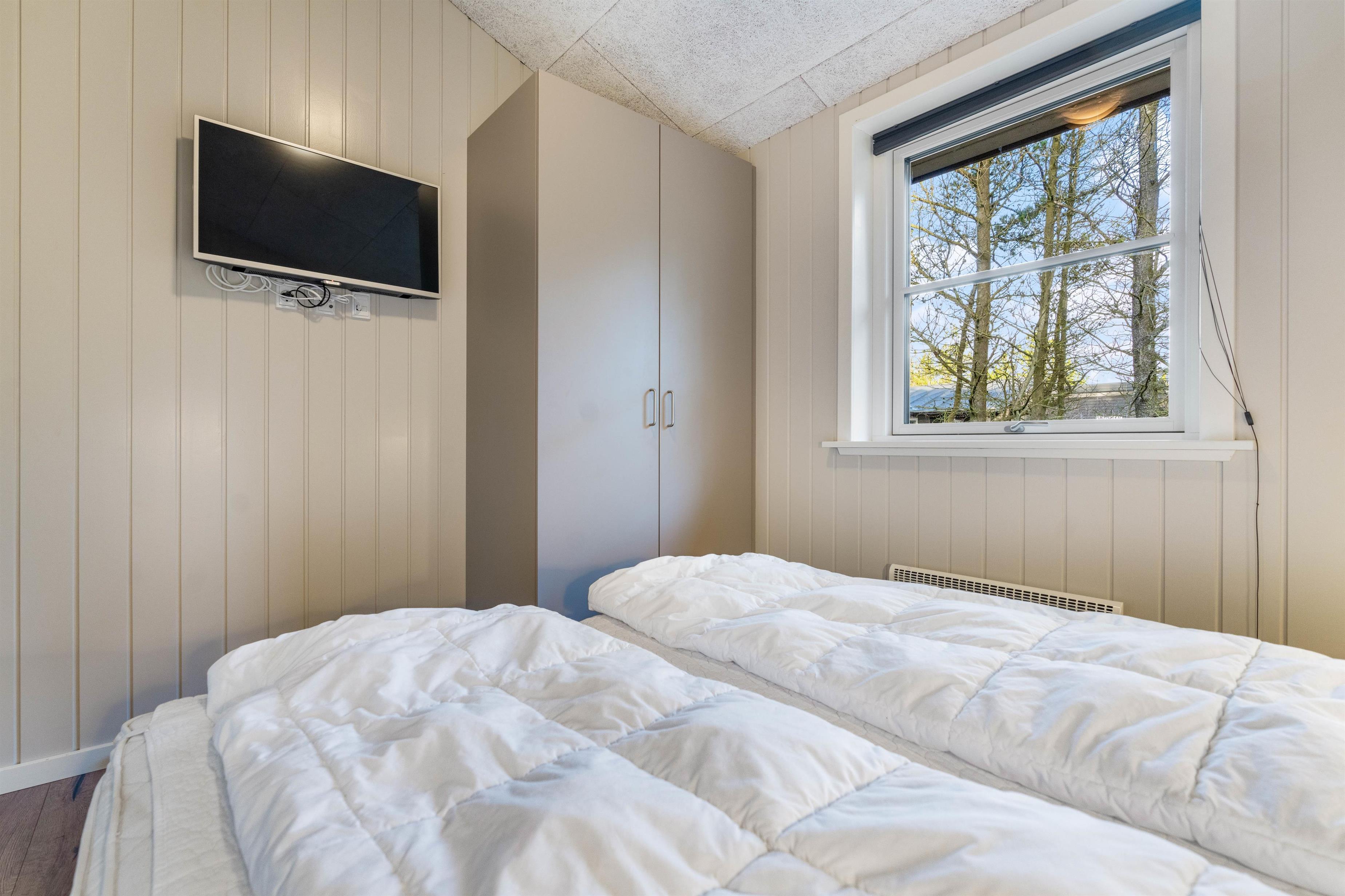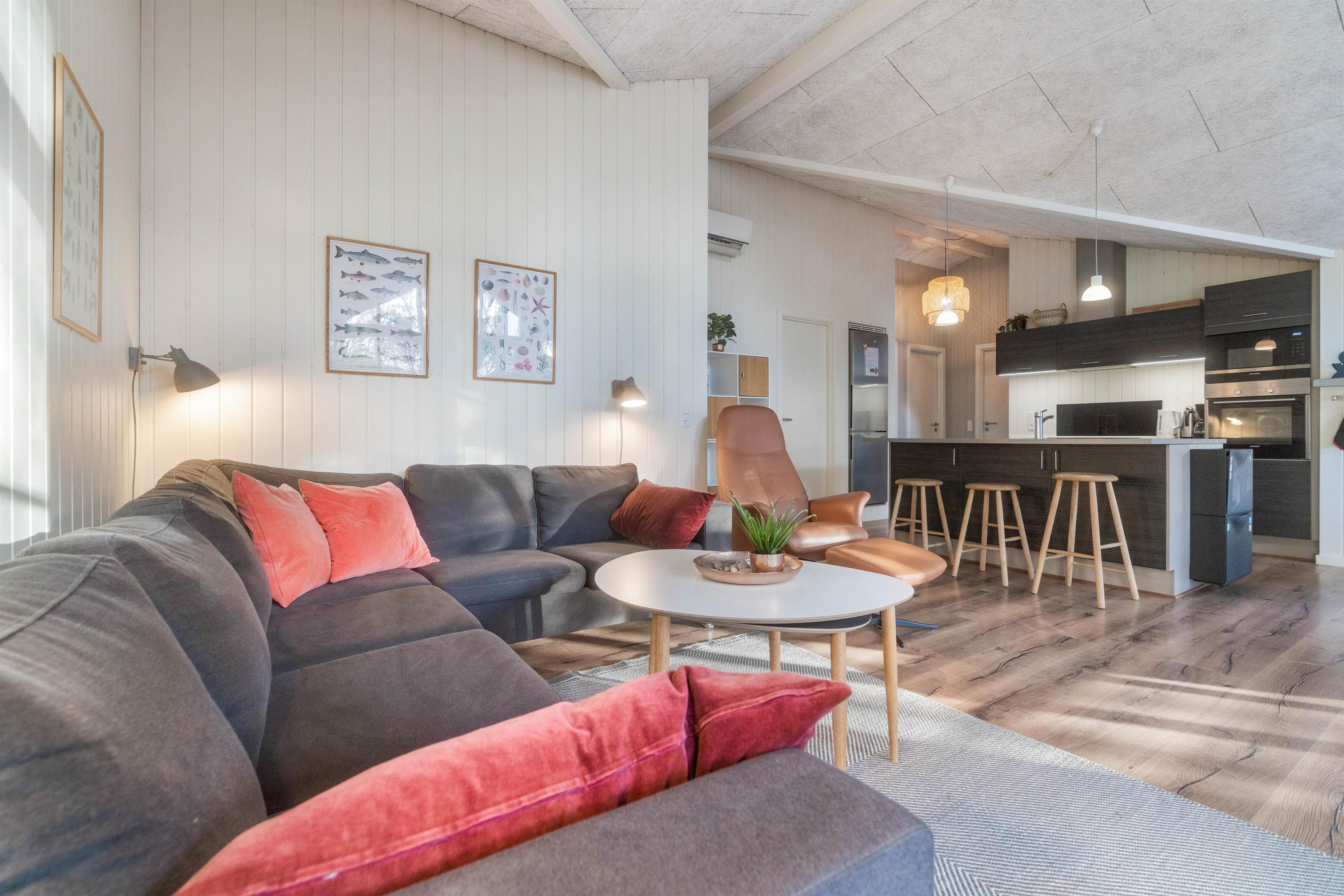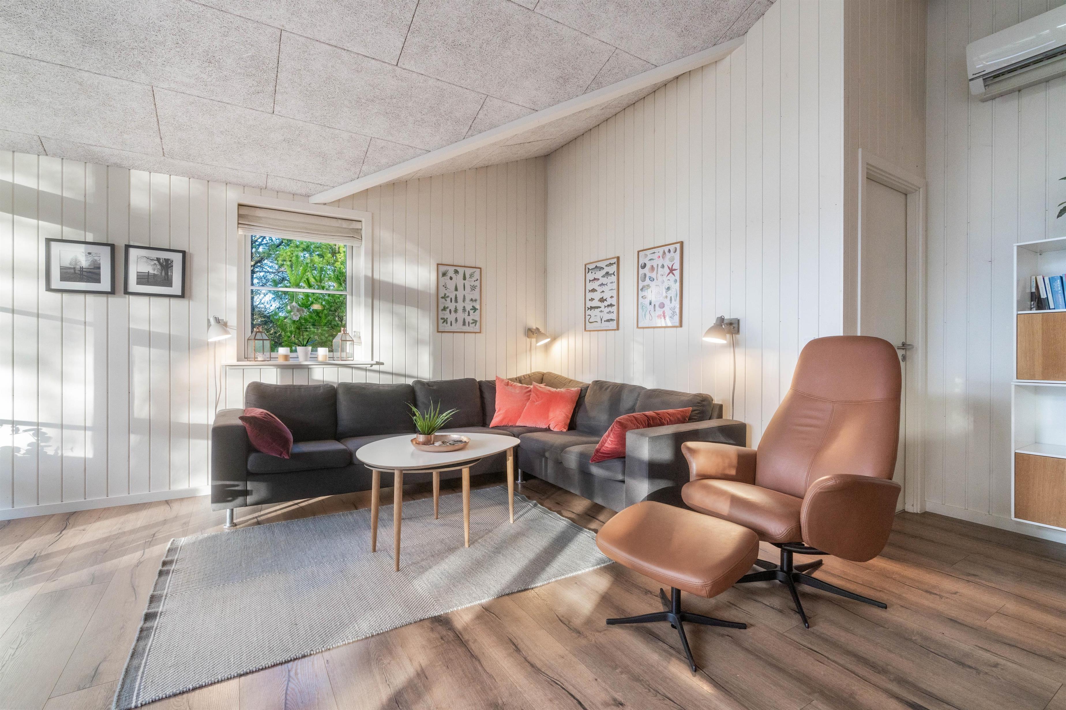 Sommerhusets varmepumpe og de energivenlige vinduer giver lavere el-omkostninger end i ældre huse. Og det flotte loft til kip giver både lys og luft, og det får sommerhuset til at virke større. Har man været en tur ved Vesterhavet er ild i brændeovnen en perfekt afslutning på dagen. Feriehusets gode fladskærms-TV er velegnet til gode film og fodbold.