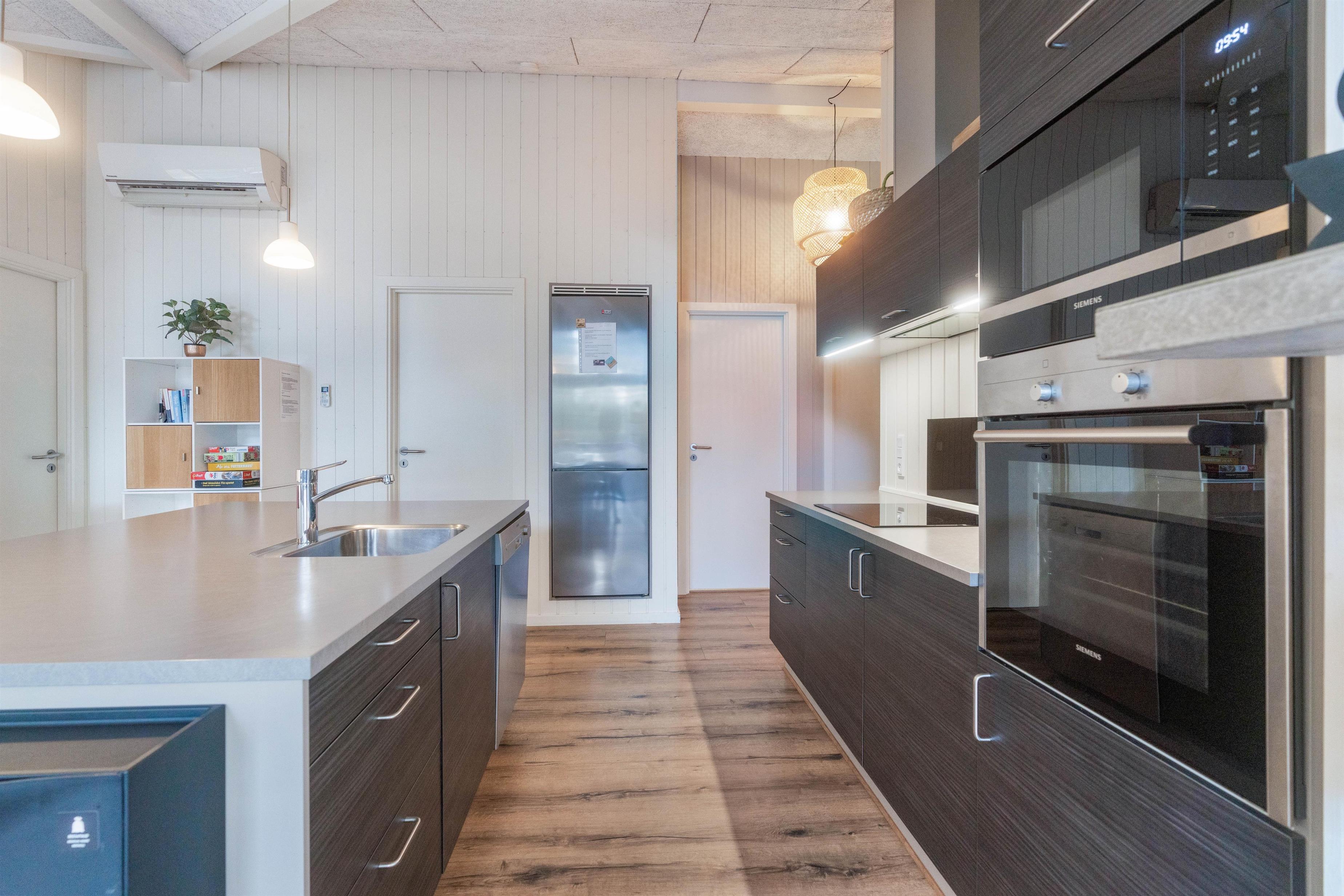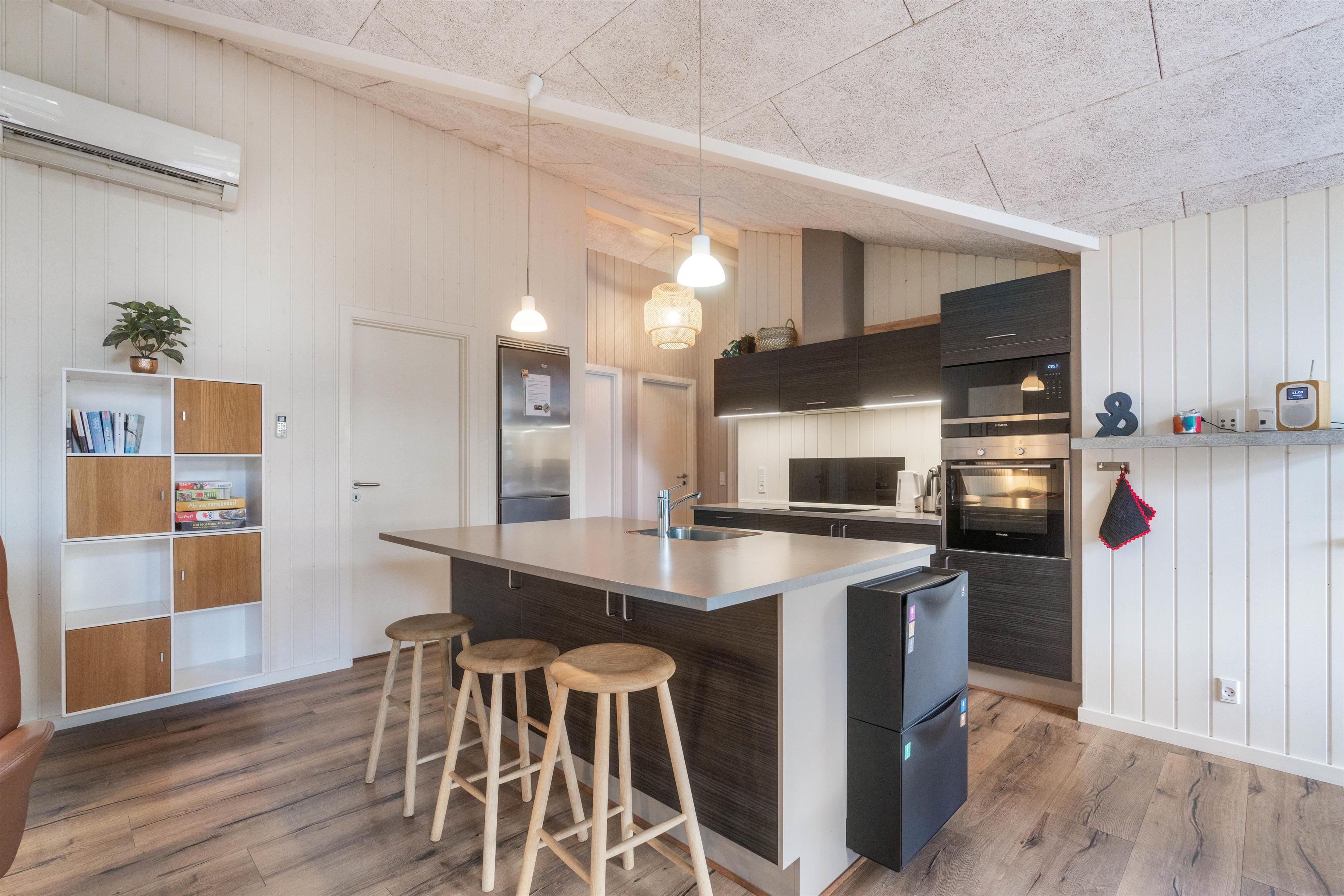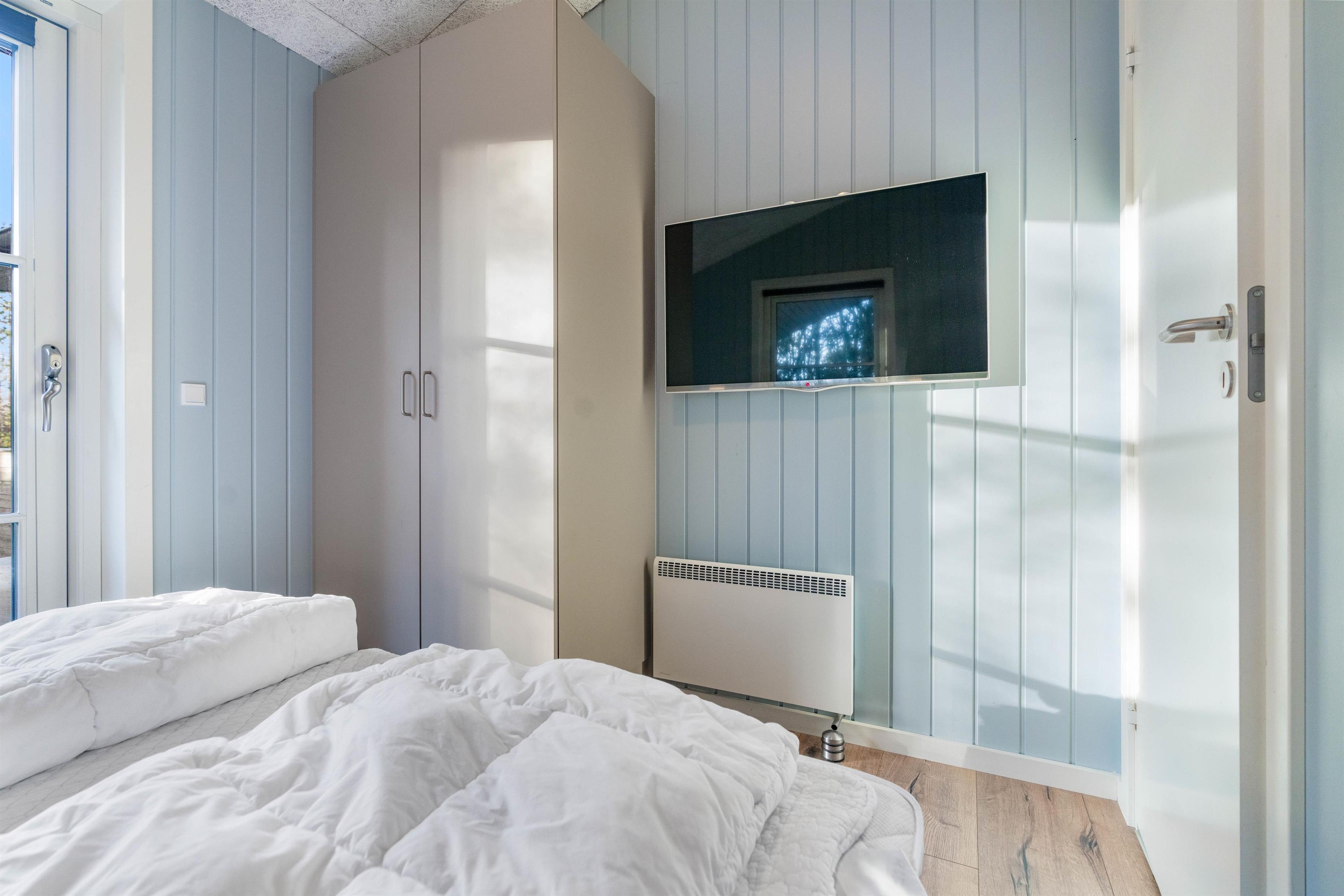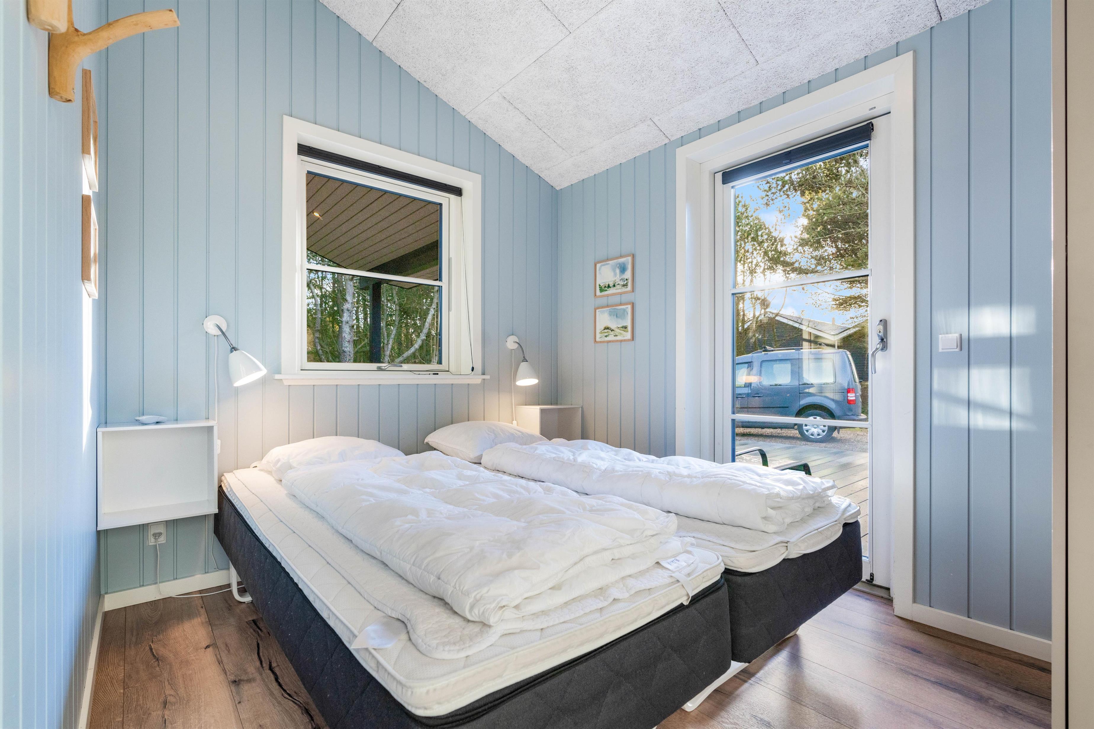 Sommerhusets varmepumpe og de energivenlige vinduer giver lavere el-omkostninger end i ældre huse. Og det flotte loft til kip giver både lys og luft, og det får sommerhuset til at virke større. Har man været en tur ved Vesterhavet er ild i brændeovnen en perfekt afslutning på dagen. Feriehusets gode fladskærms-TV er velegnet til gode film og fodbold.