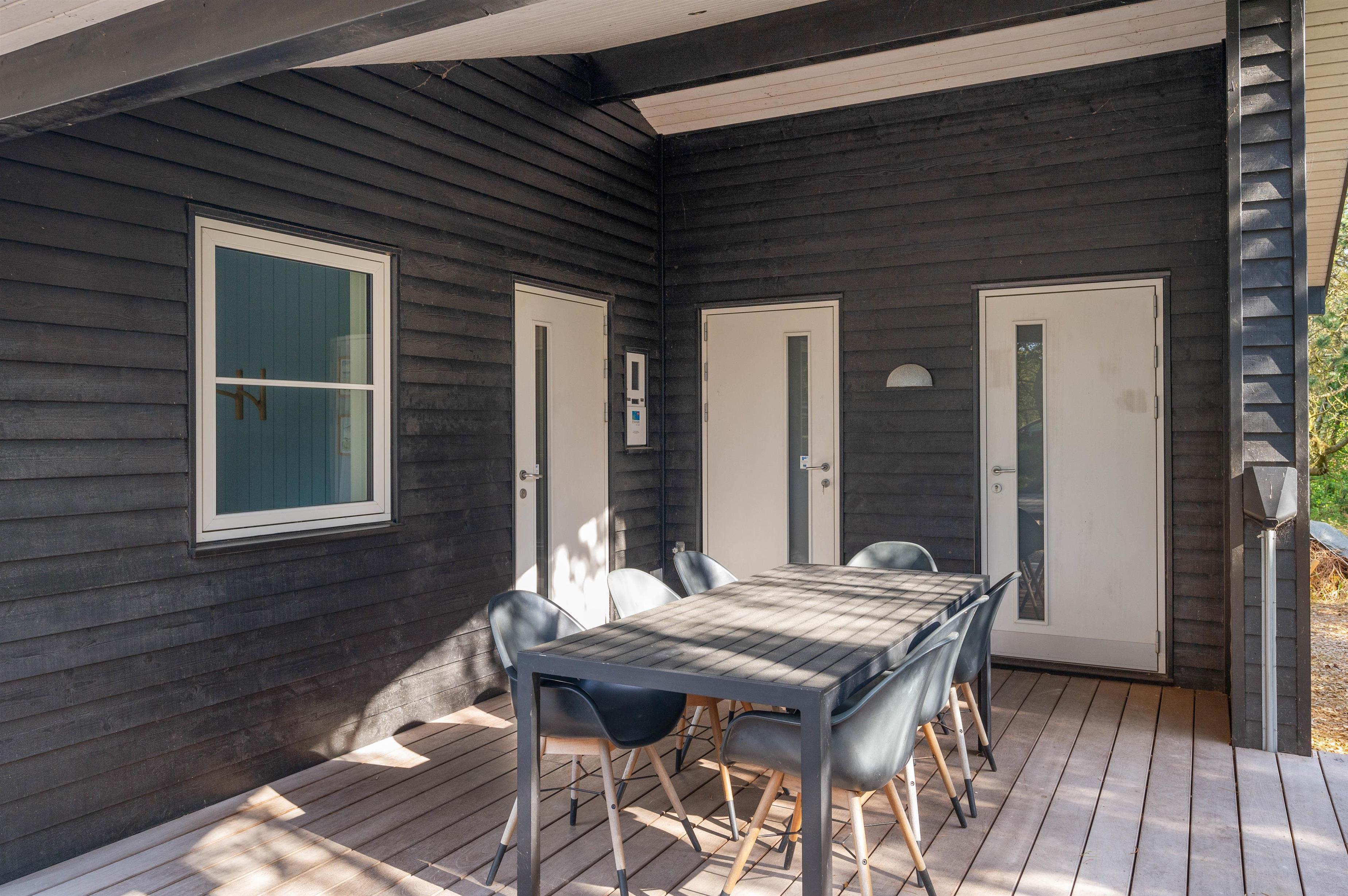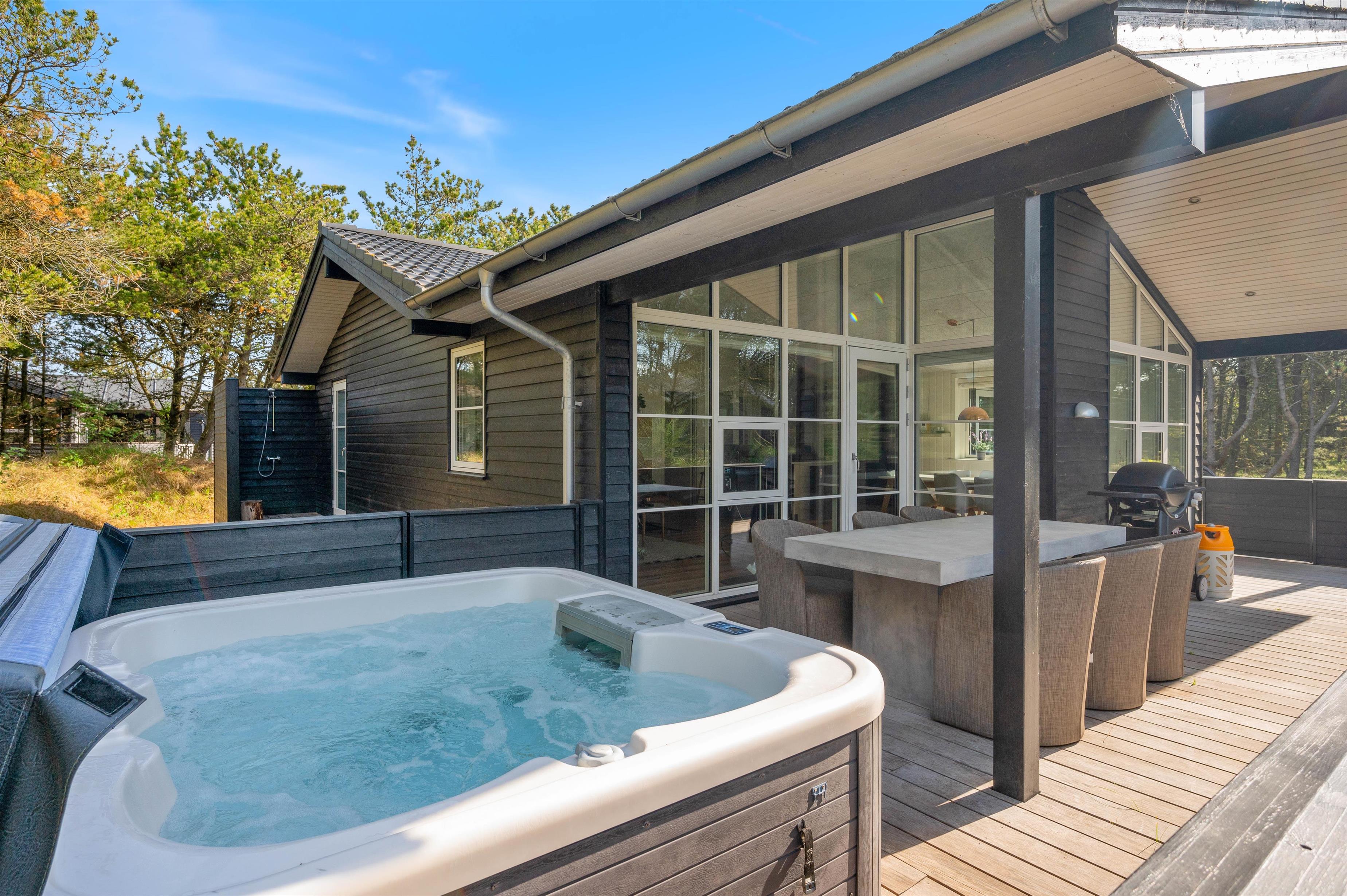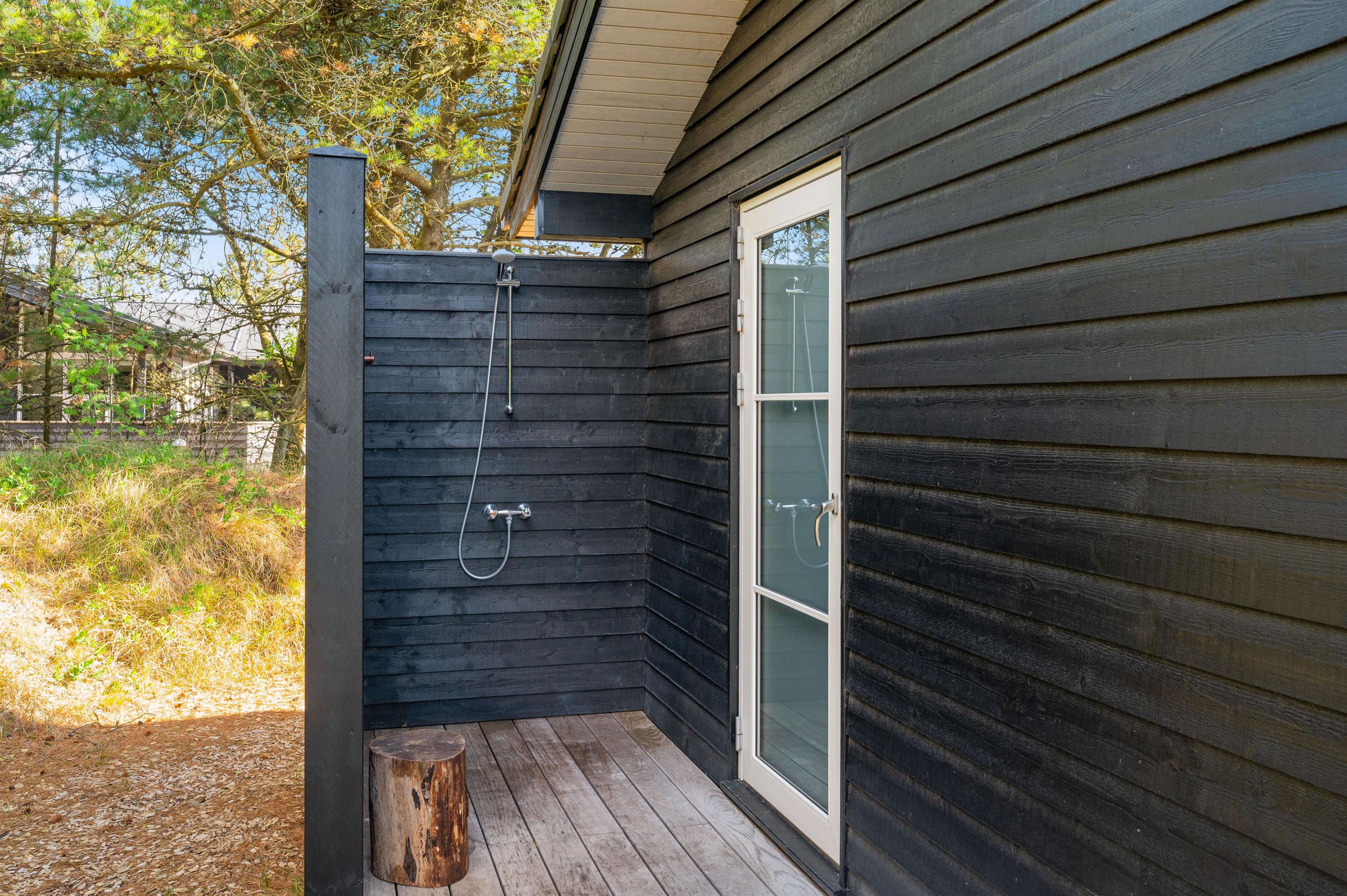 Feriehuset har nogle skønne terrasser, så du har rig mulighed for at sidde ude og nyde ferien. Den ene er stor, overdækket og delvist afskærmet, og en anden er helt lukket. Skulle det blive for varmt, kan det afhjælpes med en skyller under sommerhusets udebruser, som kan bruges fra april til november.