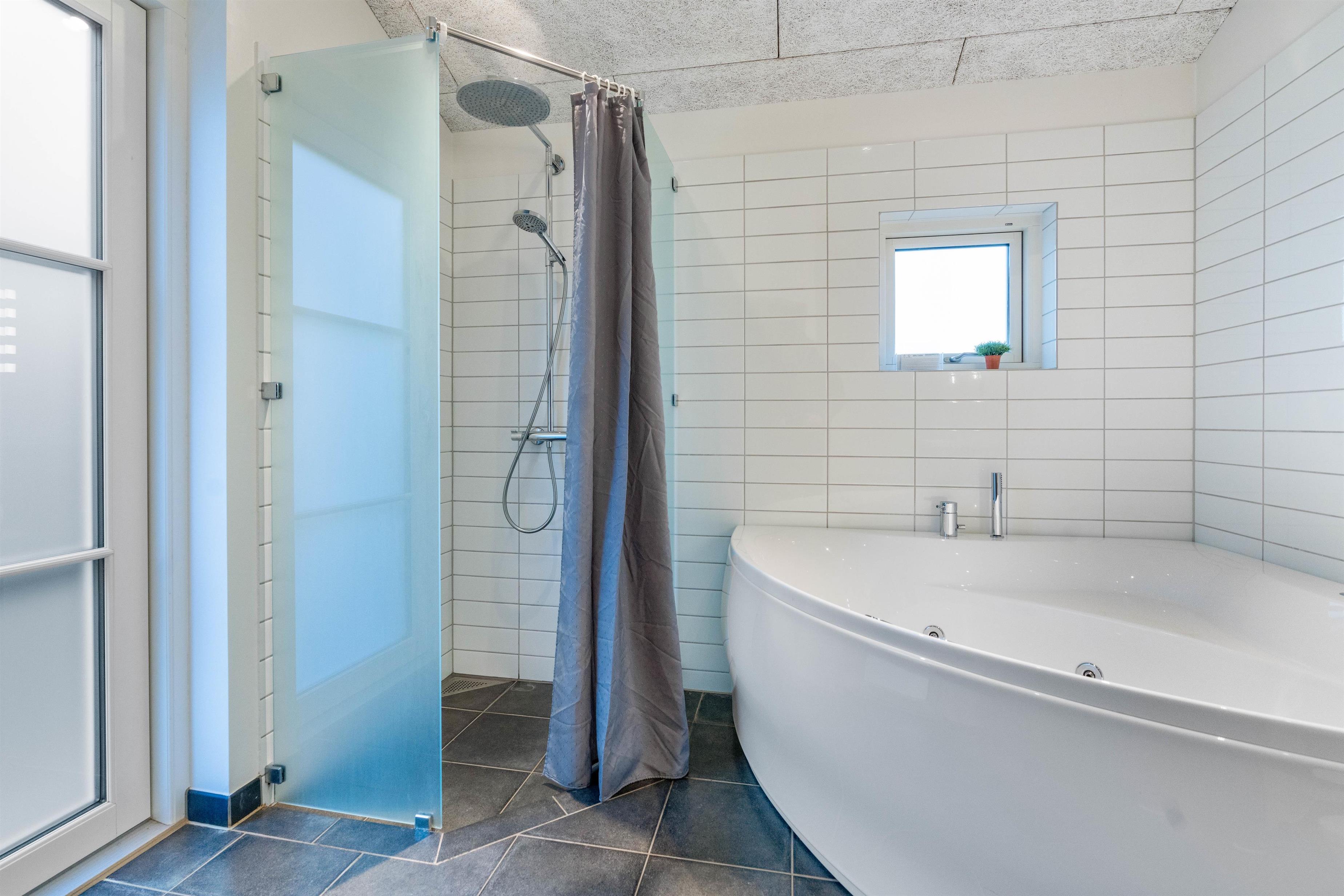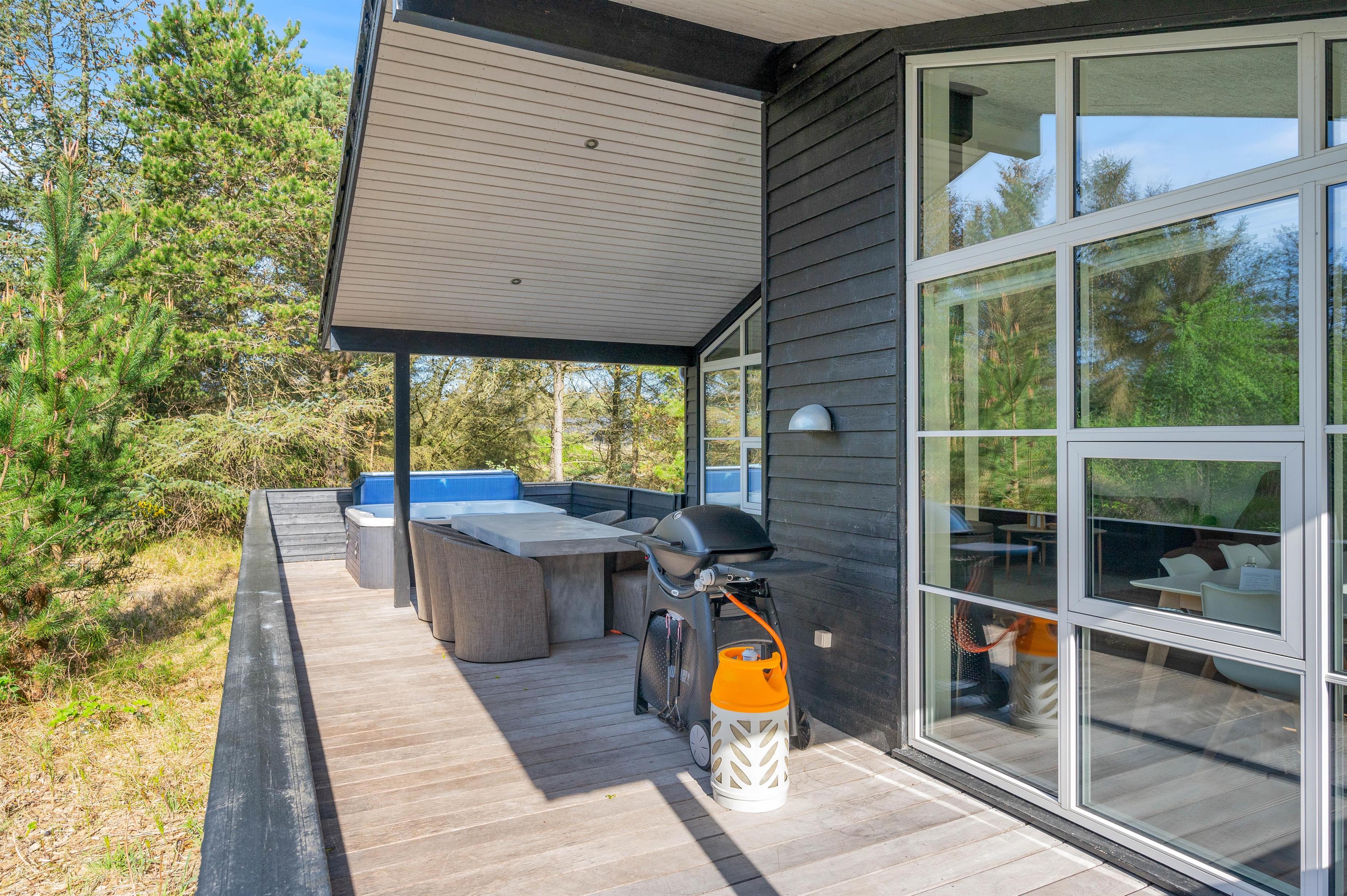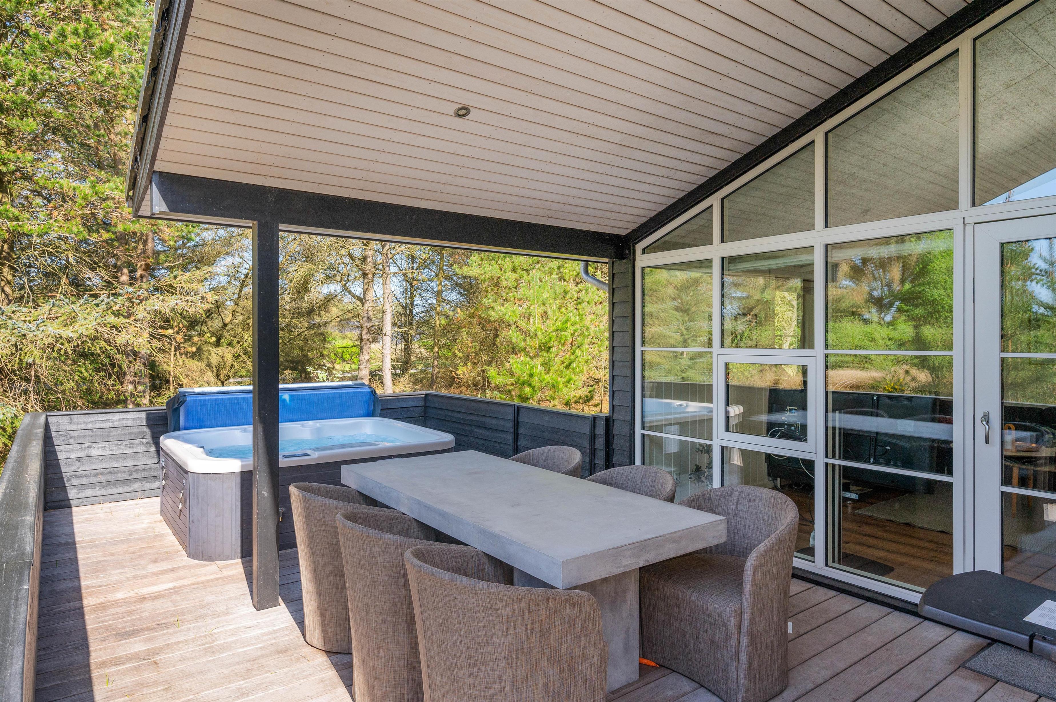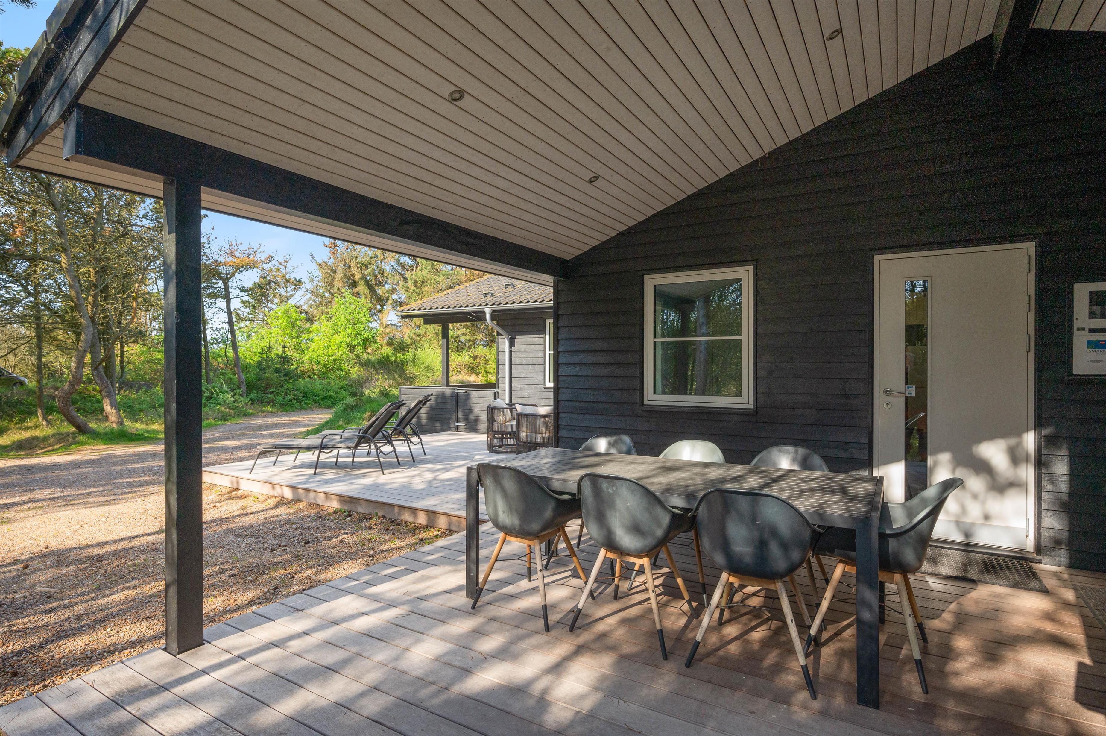 Feriehuset har nogle skønne terrasser, så du har rig mulighed for at sidde ude og nyde ferien. Den ene er stor, overdækket og delvist afskærmet, og en anden er helt lukket. Skulle det blive for varmt, kan det afhjælpes med en skyller under sommerhusets udebruser, som kan bruges fra april til november.