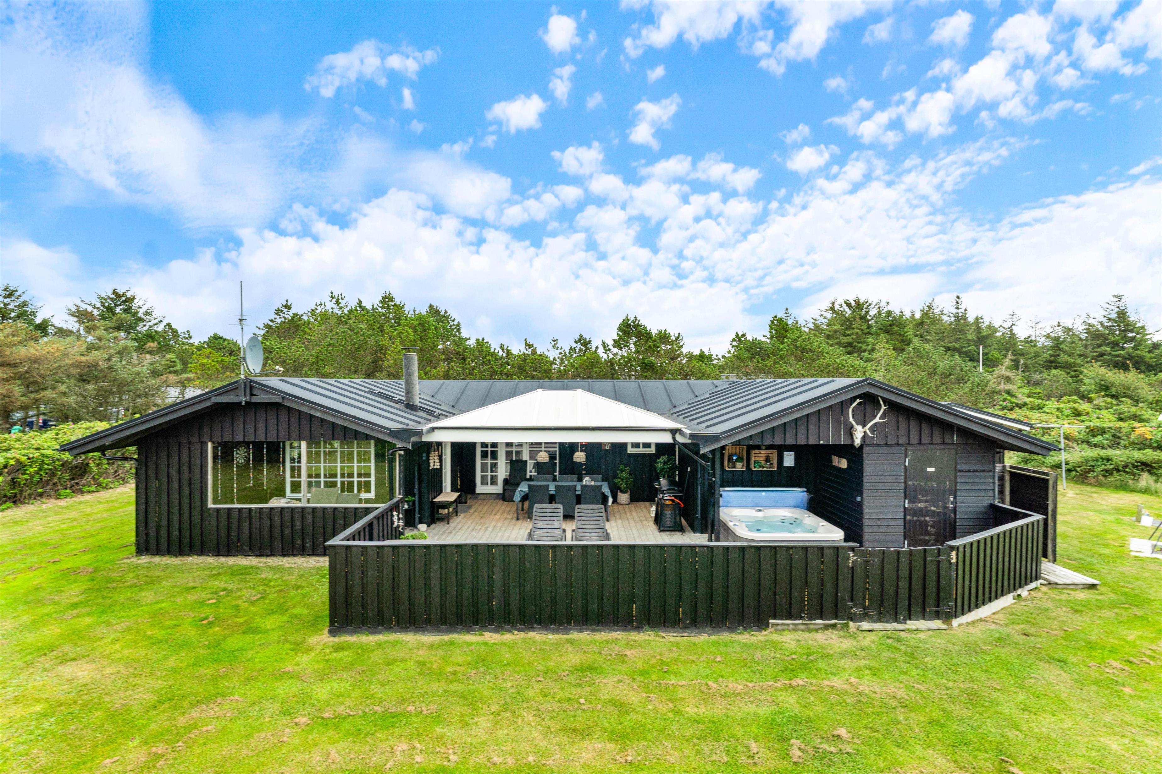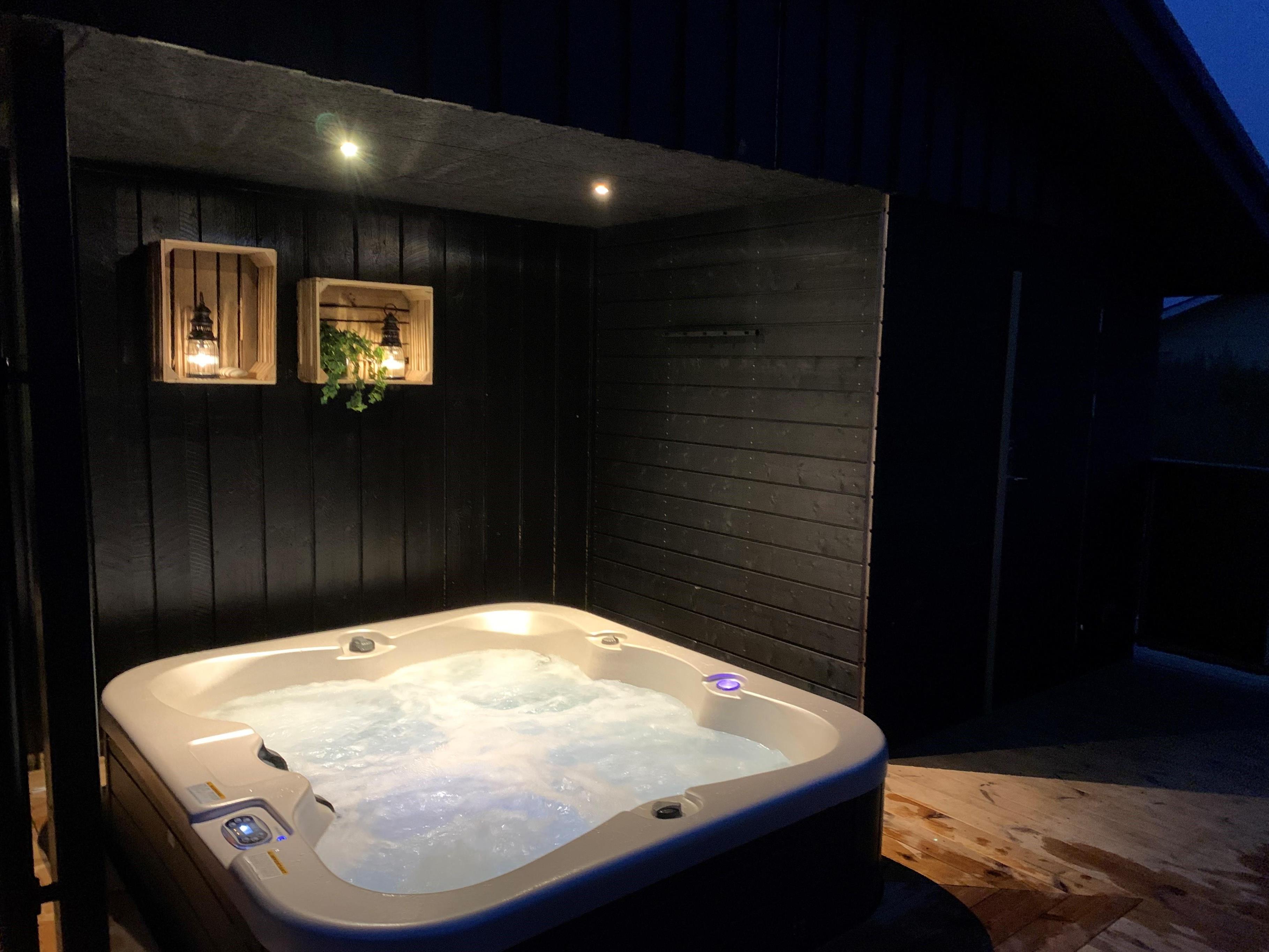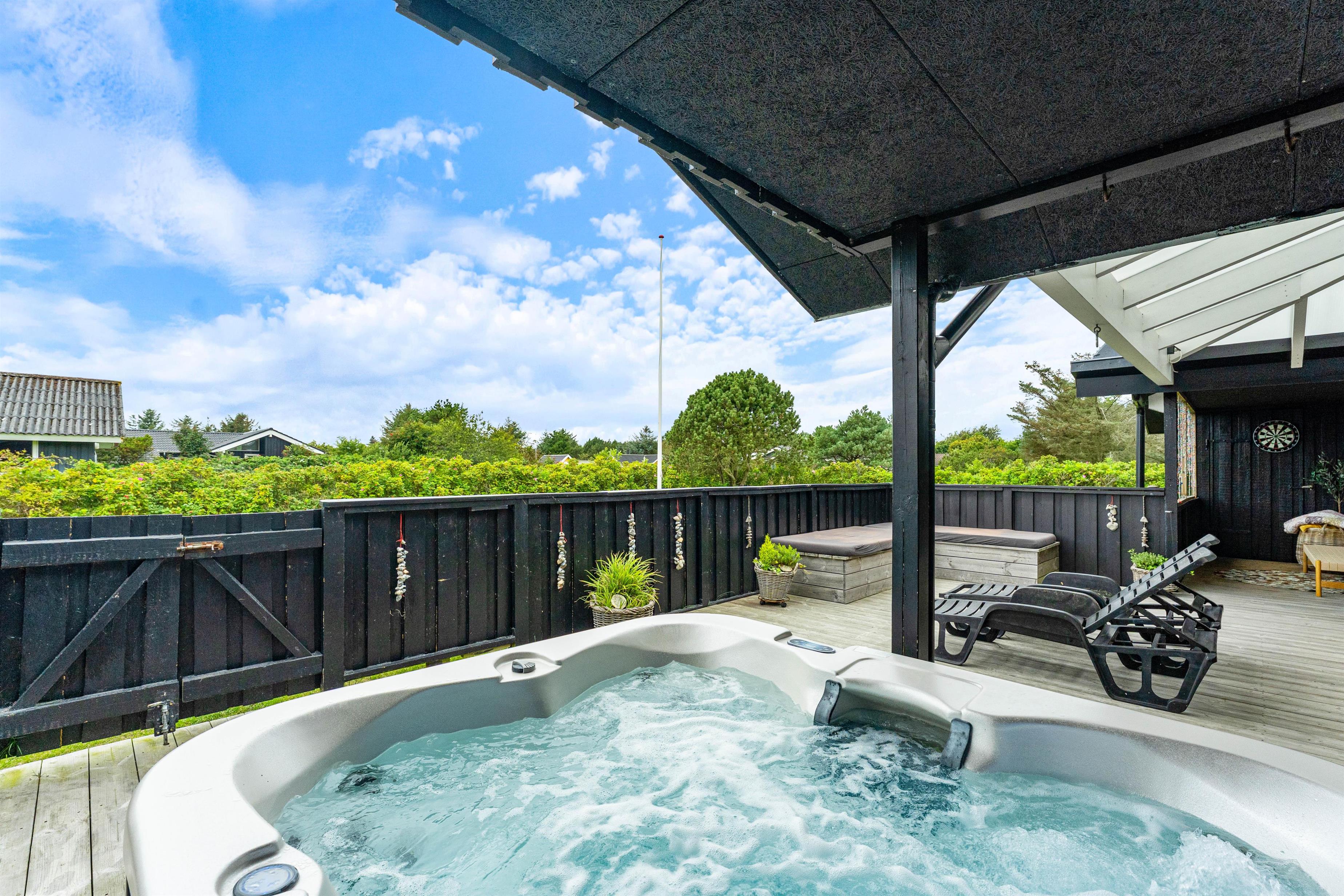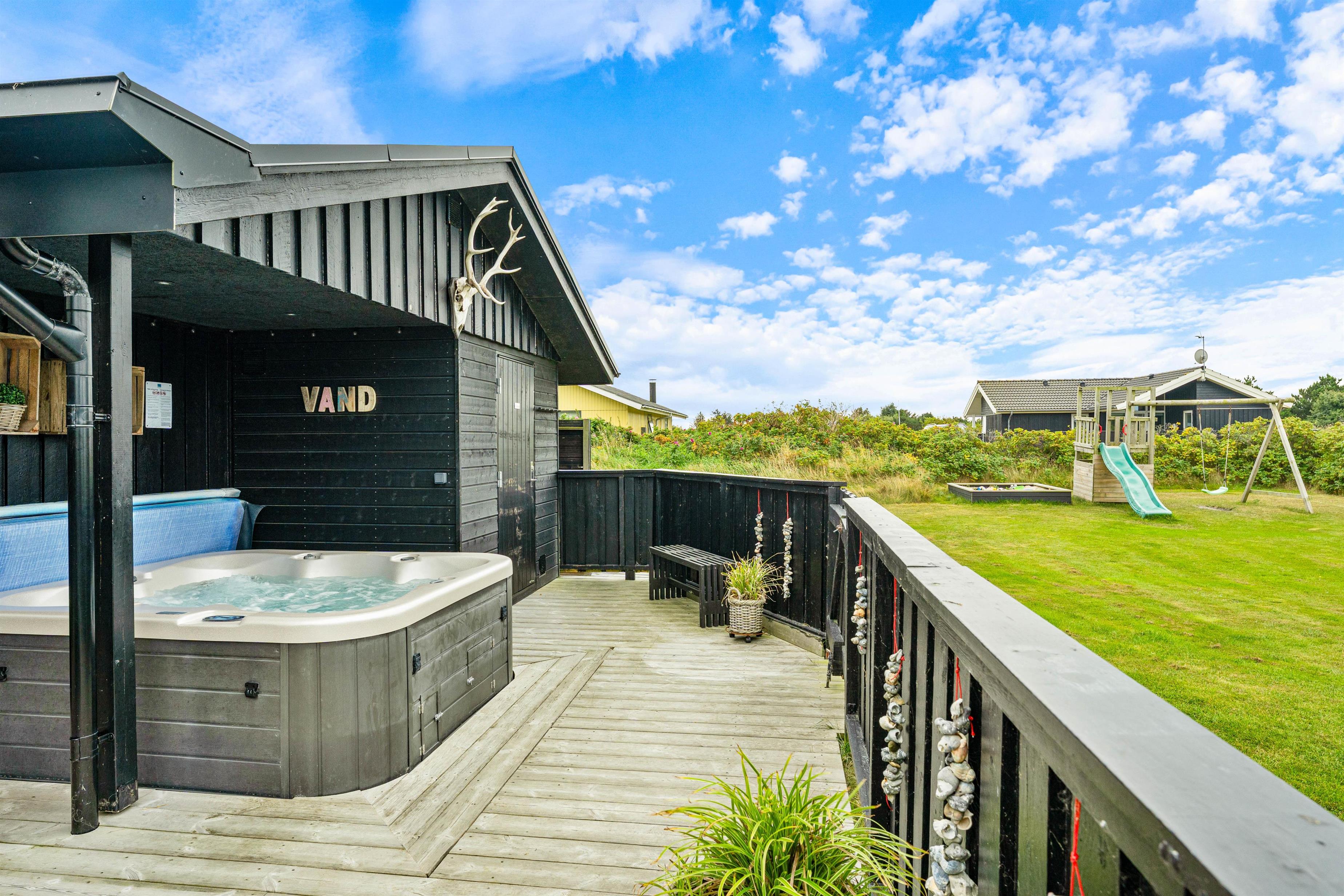 På varme sommerdage er det oplagt at benytte jer af det store udendørs område, hvor I kan slappe af og nyde solen. En udendørs bruser med varmt vand ved sommerhuset sikrer, at I kan få vasket sandet af fødderne efter en tur til stranden (kan bruges fra april til november). Senere på aftenen kan I hoppe en tur i udespaen og saunaen, som indbyder til forkælelse og afslapning.
