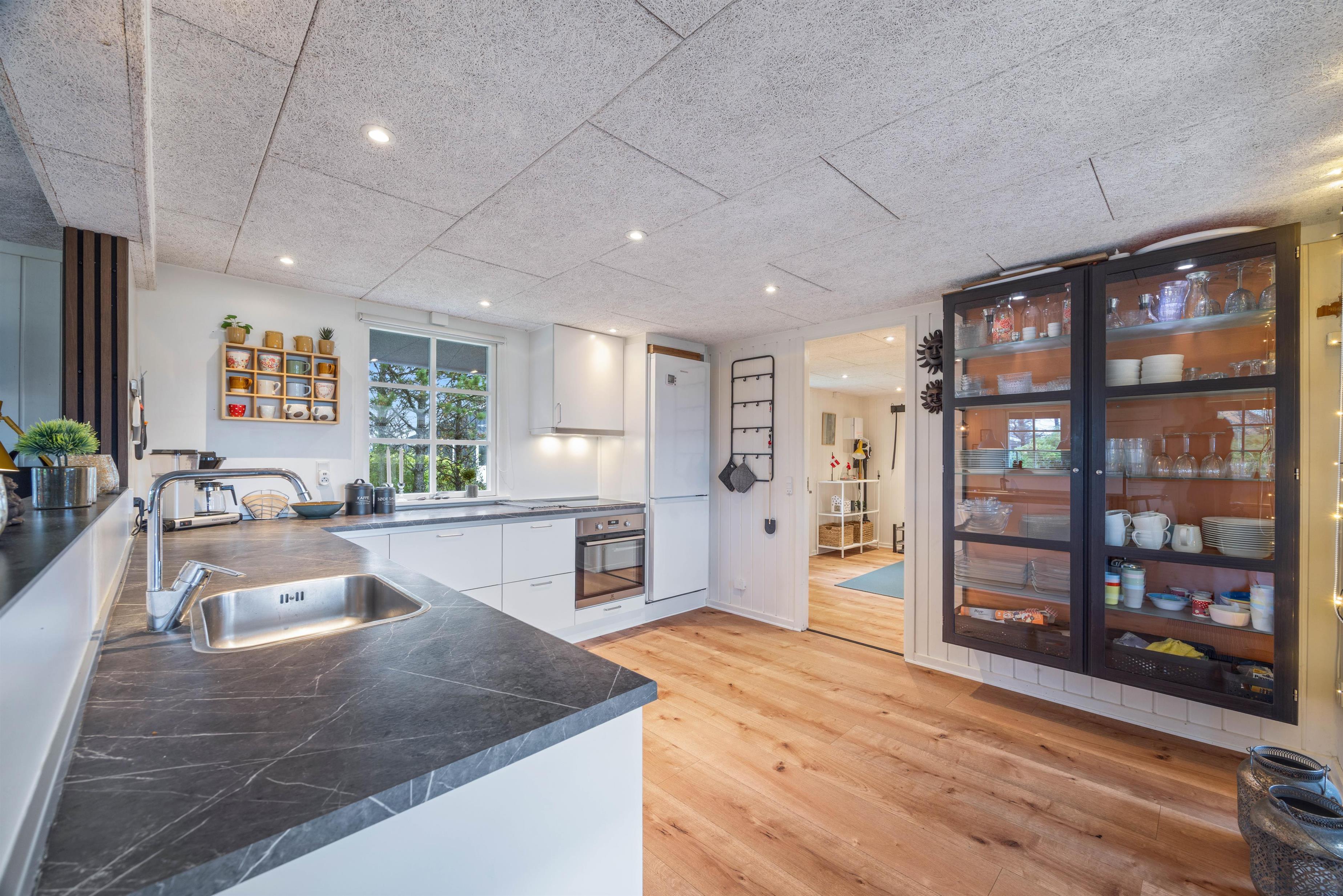 Sommerhusets hjerterum er det hyggelige opholdsrum, som ligger i åben forbindelse med det veludstyrede køkken. Her er der lagt op til en masse hyggelige stunder i familiens selskab. Brændeovnen sørger for både varme og en ekstra hyggelig feriestemning. I kan med fordel også benytte jer af den energibesparende varmepumpe. I sommerhuset er der en chromecast til jeres rådighed, så I kan streame jeres yndlingsfilm fra jeres egen mobil eller tablet.
