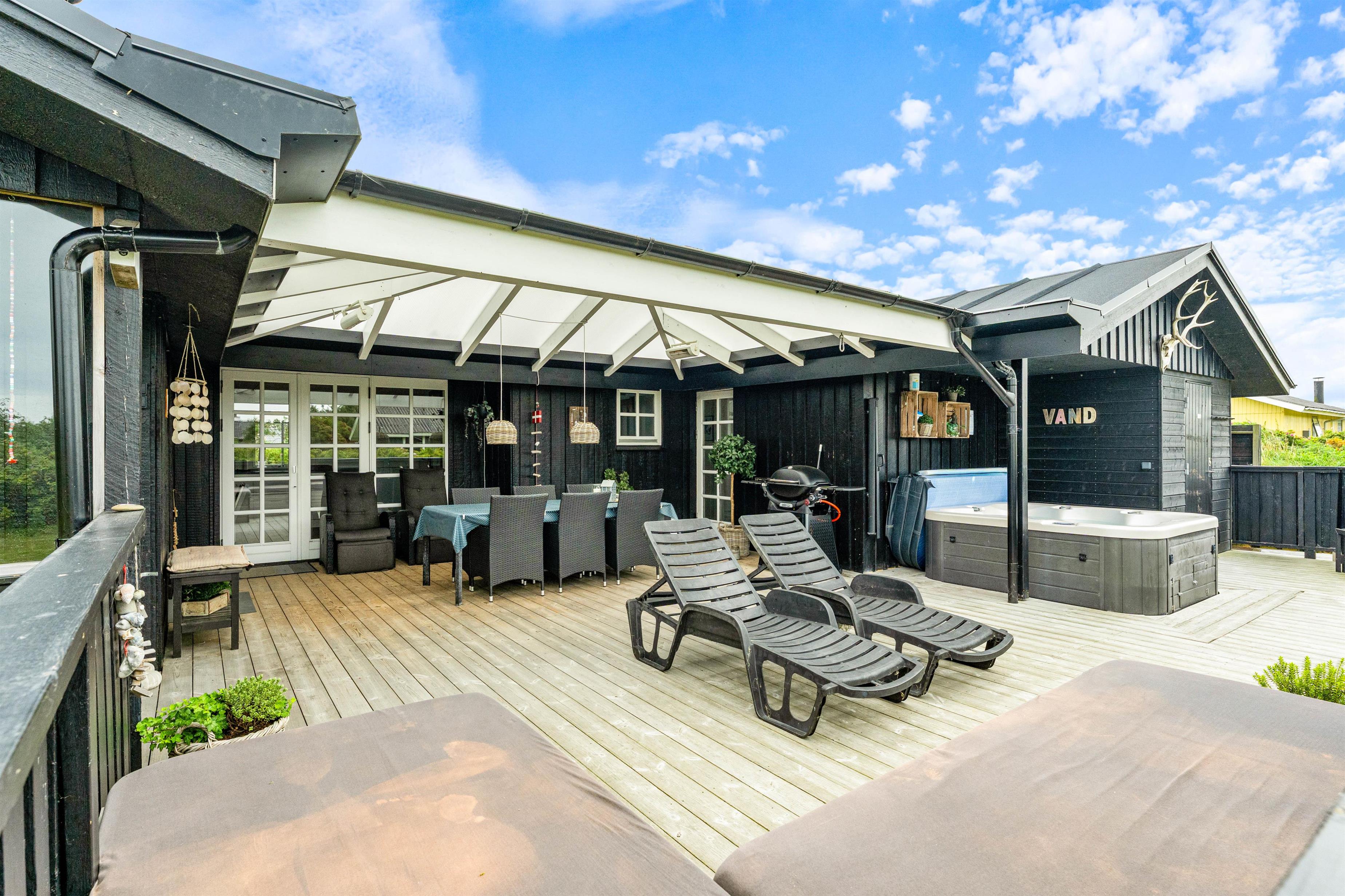 Dagen kan sluttes af med et lækkert grillmåltid tilberedt på den store gasgrill, som I finder ved sommerhuset. Skulle der komme en lille regnbyge på en ellers lun sommeraften, er der ingen grund til bekymring; Den lukkede og afskærmede terrasse er nemlig overdækket, så I kan sidde i læ for vind og vejr. Desuden er der 2 terrassevarmere, I kan tænde for, hvis det bliver køligt senere på aftenen.