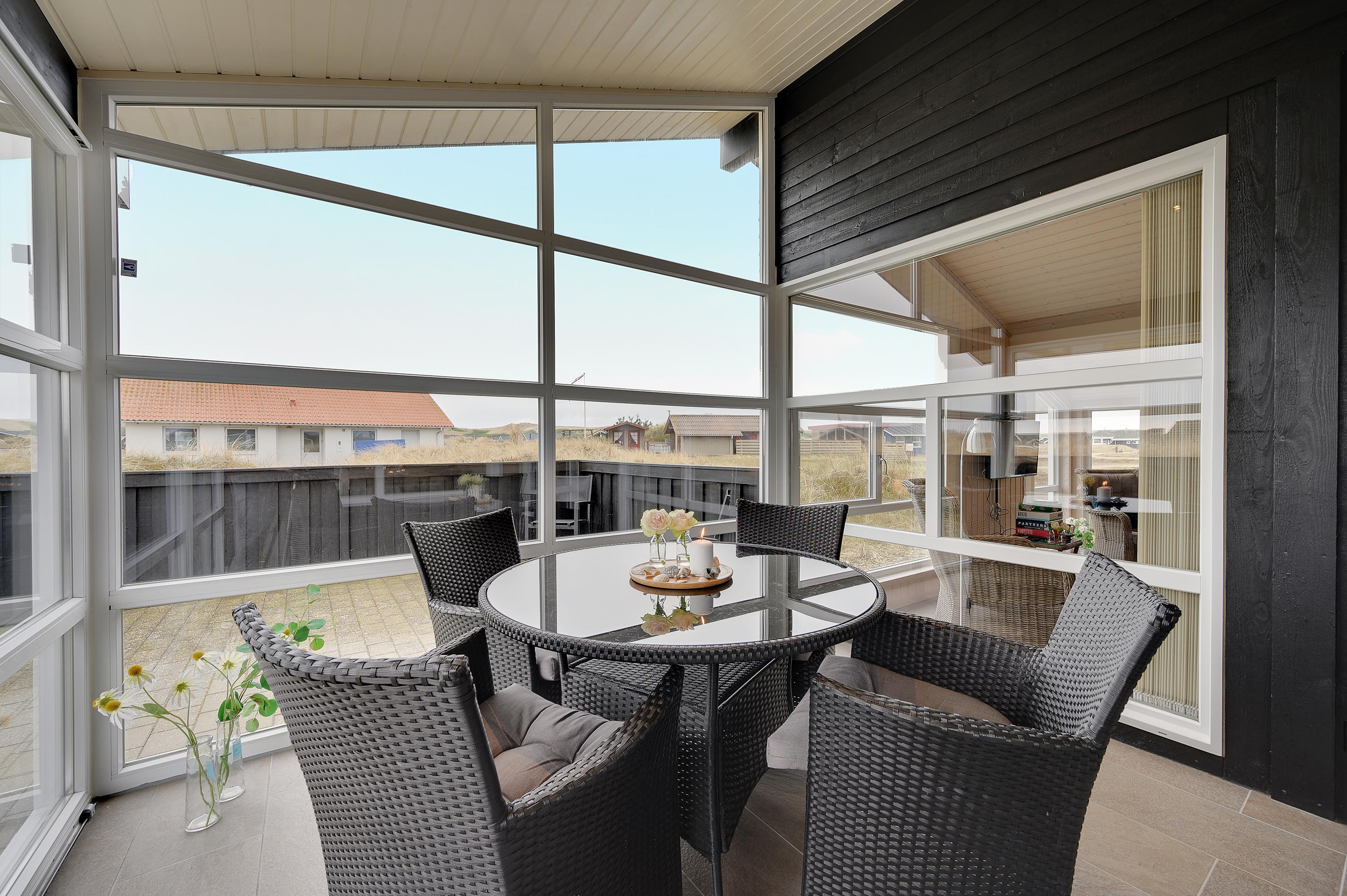 Bliver blæsten for vild, eller regner det, så kan I alligevel godt holde en hyggelig grillaften med udsigt til klitterne; i den dejlige udestue har I nemlig altid læ for den, til tider, lunefulde natur. Fra udestuen er der adgang til den store lukkede og delvist overdækkede terrasse.