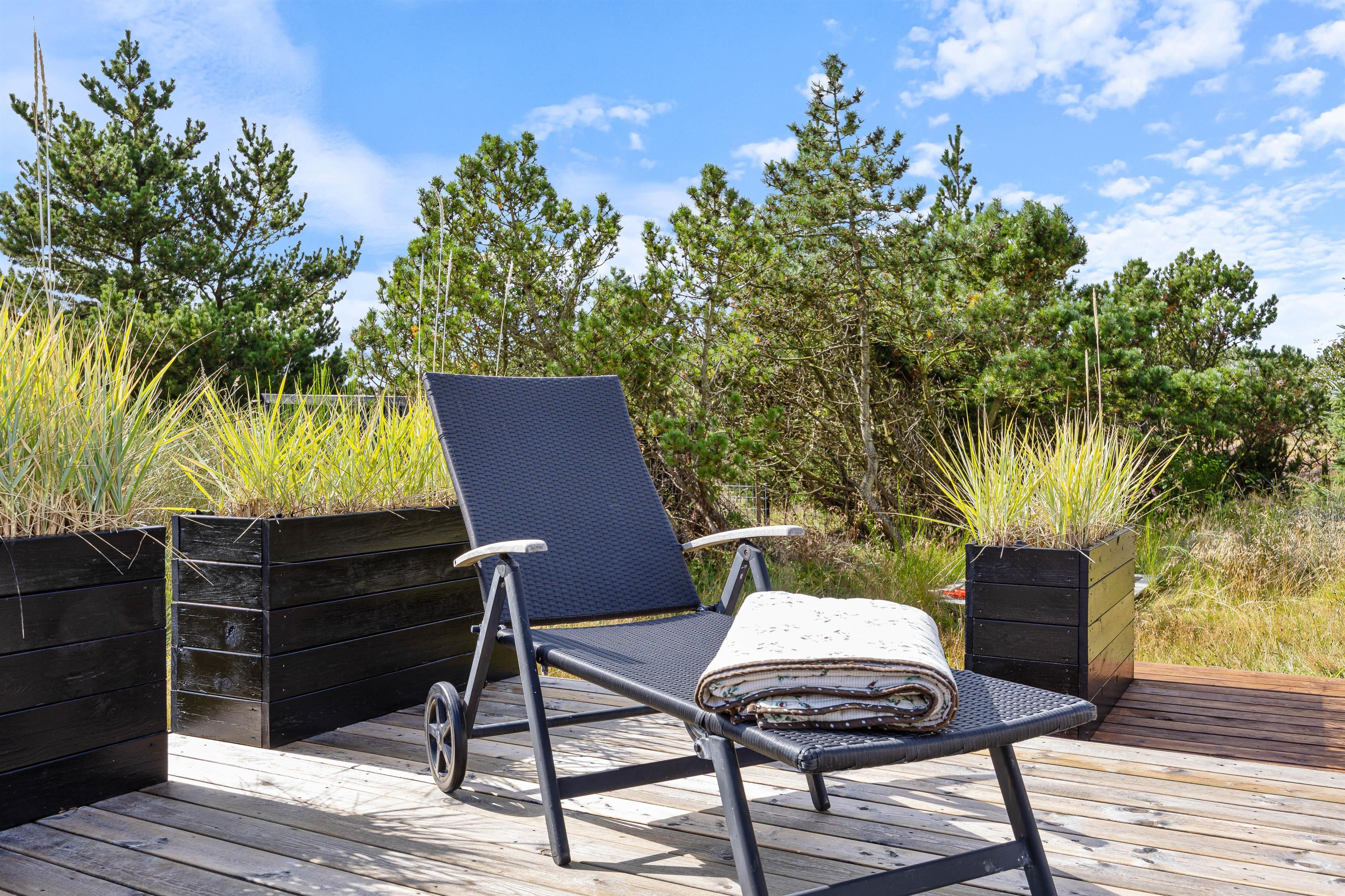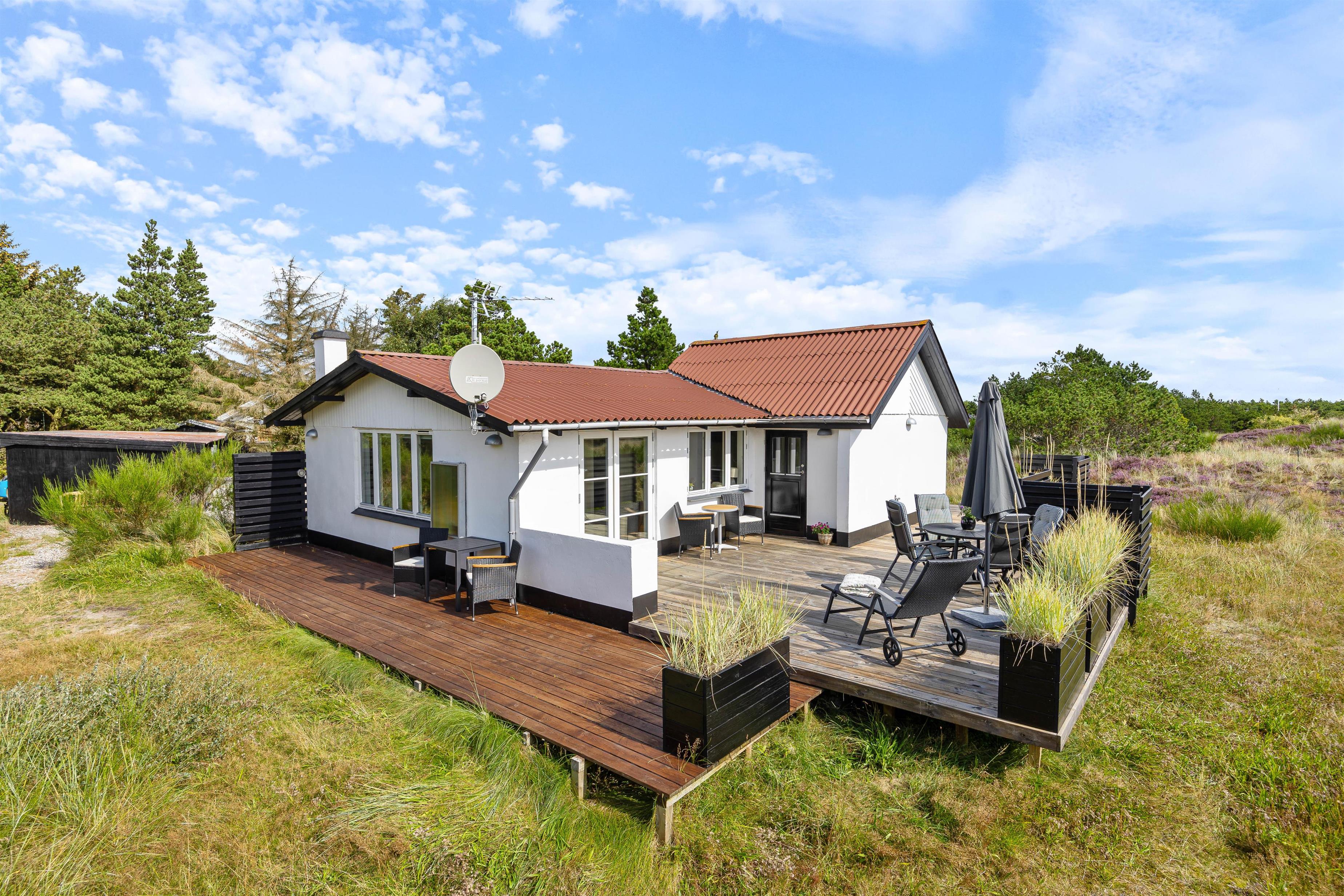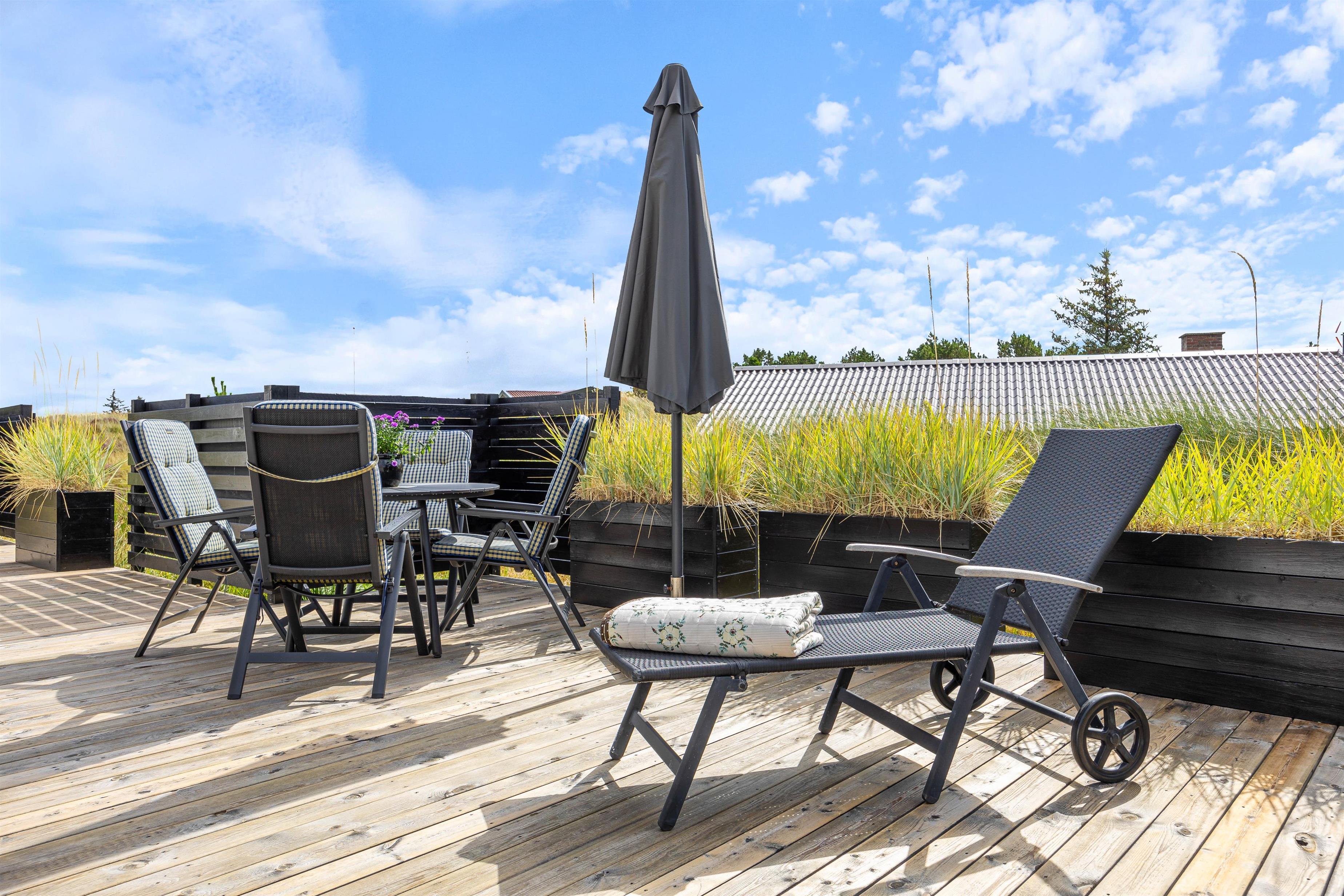 Sommerhuset har en stor træterrasse, som er vendt mod flere hjørner. På den måde kan I nyde solen i mange timer, blandt andet fra feriehusets liggestol, mens I har øje på børnene, som kan lege i sandkassen eller i klitterne. En del af terrassen er også overdækket, hvilket giver mulighed for at forlænge sommeren eller blot nyde morgenkaffen, når vejret bliver en smule køligere. Her kan I også sidde at nyde grillmaden, som er tilberedt på gasgrillen.