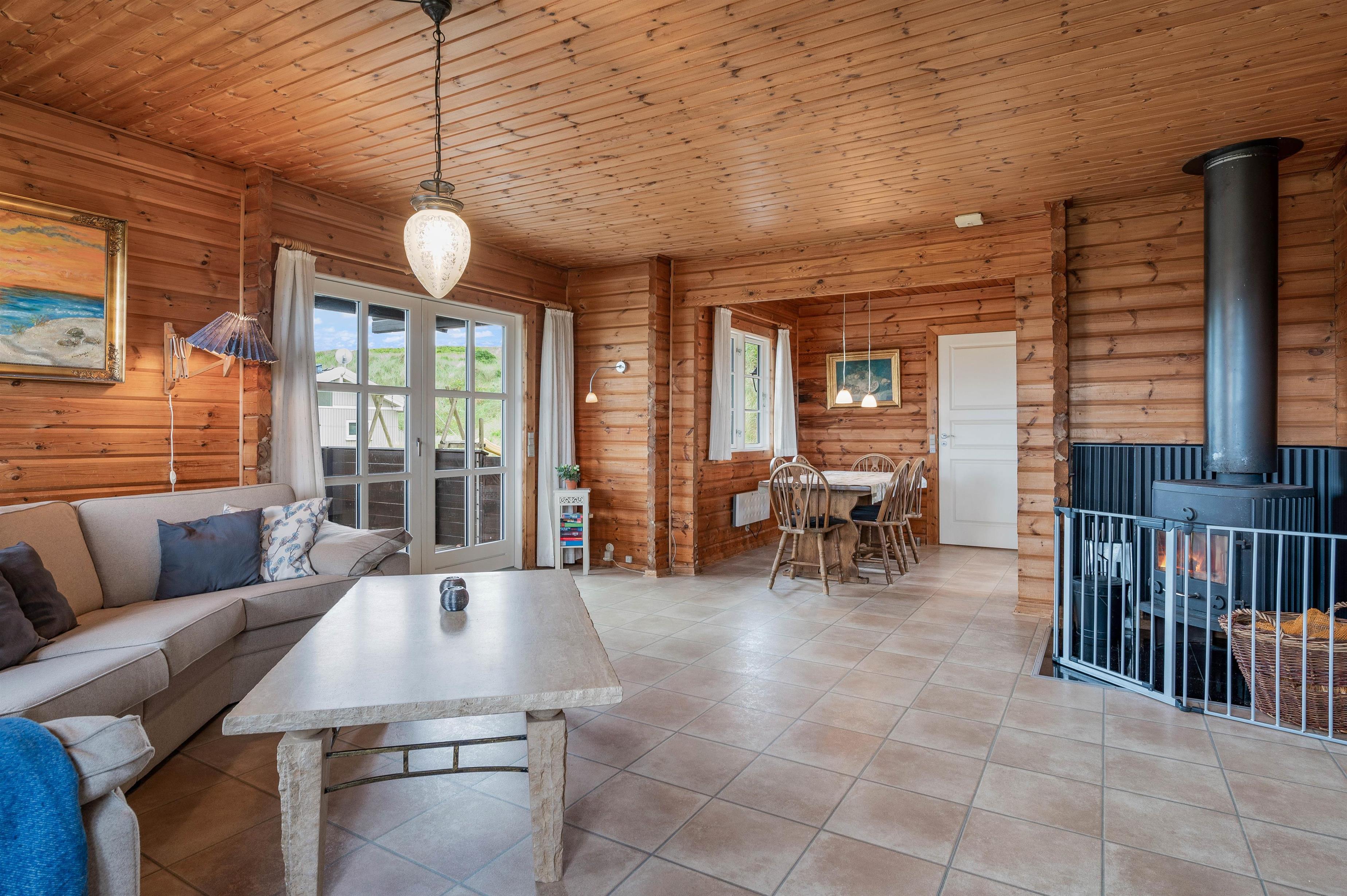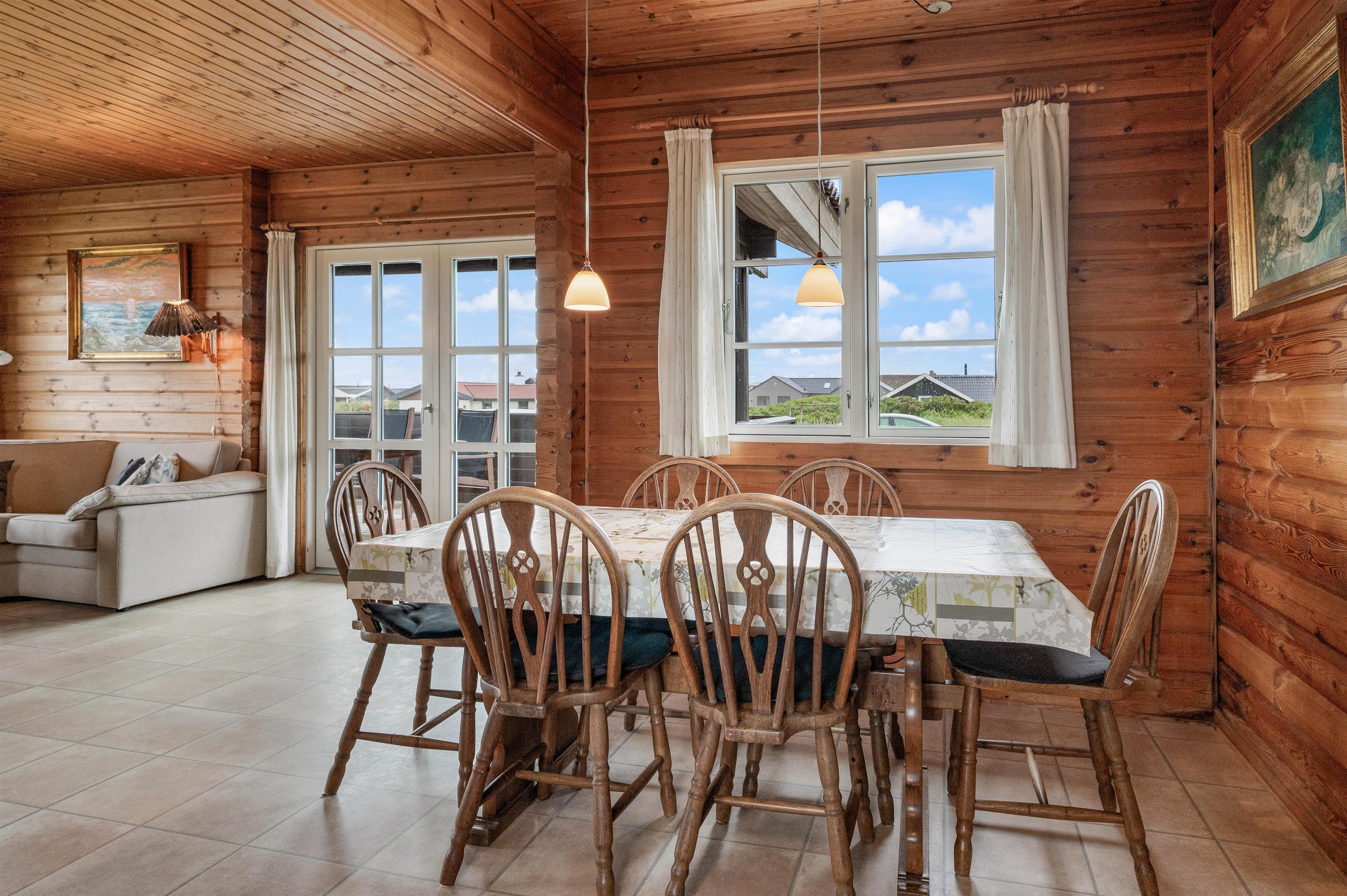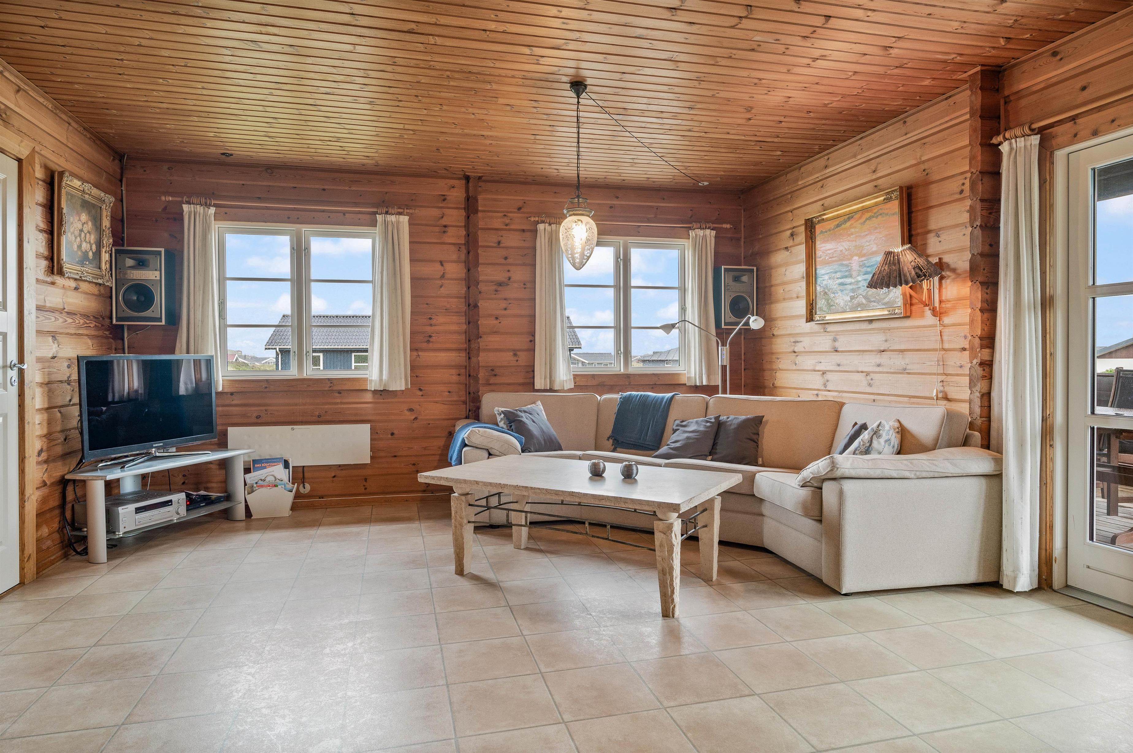 Dette rustikke bjælkehus har et godt udstyret køkken og en stor stue med trævægge, der giver en atmosfære af feriehygge. Her er både brændeovn, TV, DVD og stereoanlæg. Efter dagens oplevelser er det en fornøjelse at slappe af i sommerhusets sauna eventuelt efter en frisk dukkert ved Vesterhavet. Sommerhusets badeværelse er samtidig med gulvvarme, så jeres fødder holdes varme om morgenen.