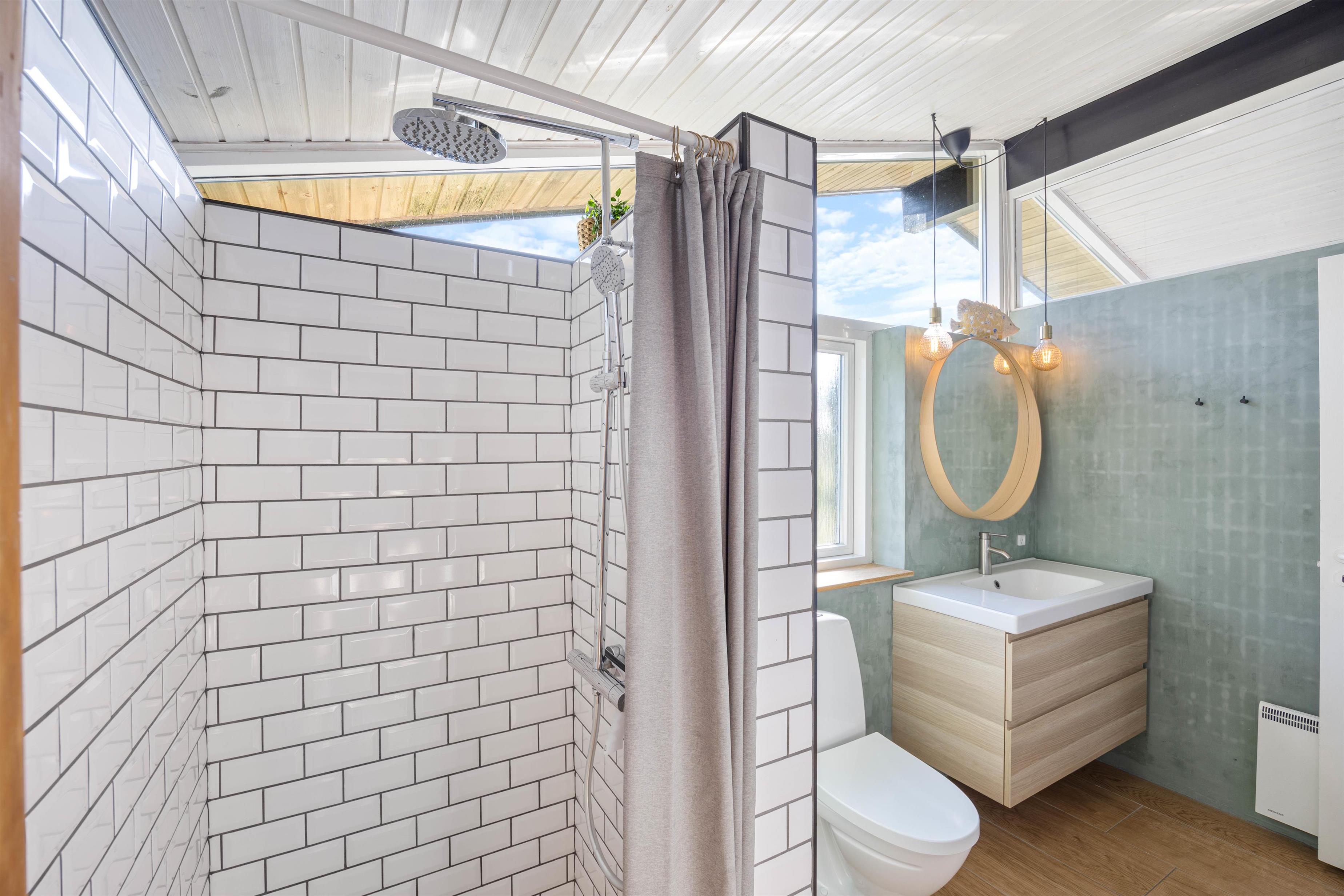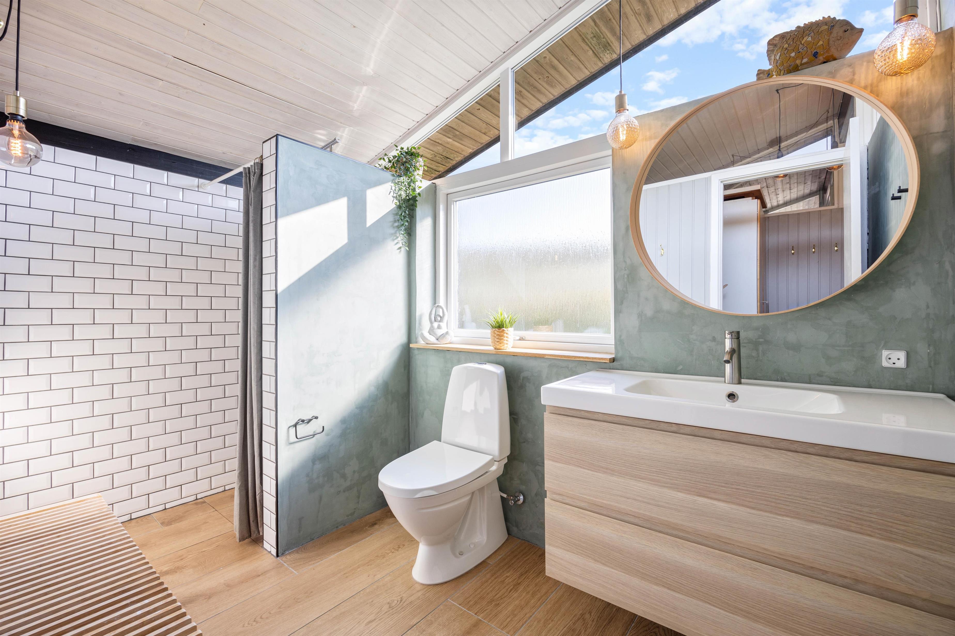 Badeværelset er moderne indrettet med gulvvarme, som giver en behagelig varme på kølige dage. Efter en lang gåtur på stranden kan du blive varmet op og slappe af i saunaen.