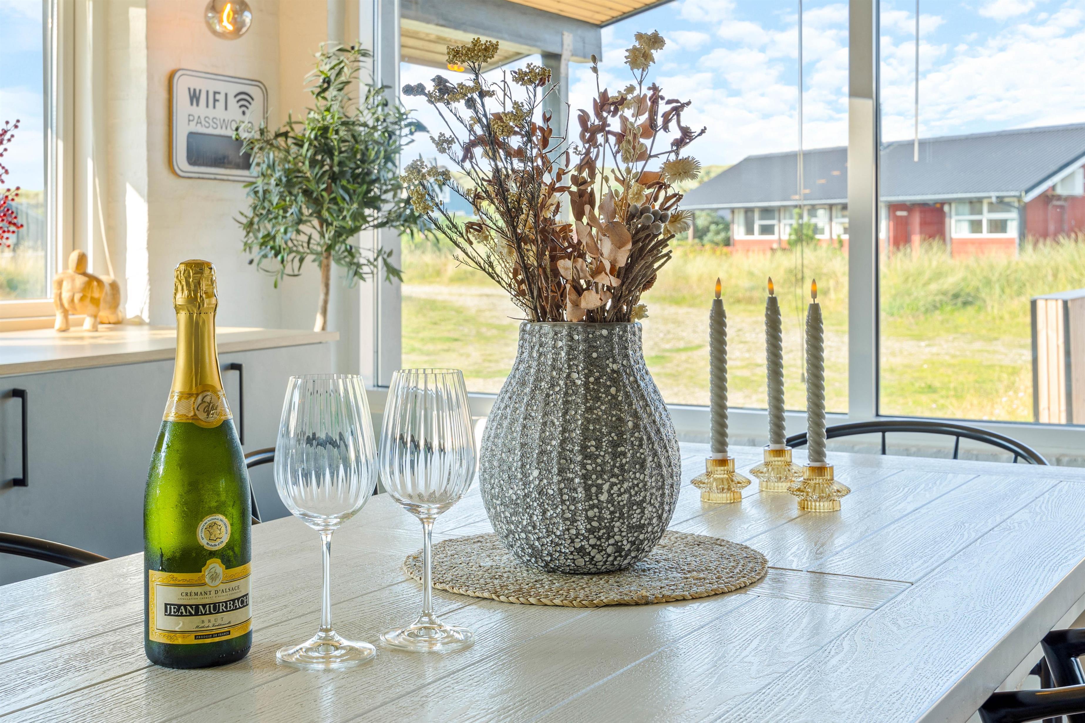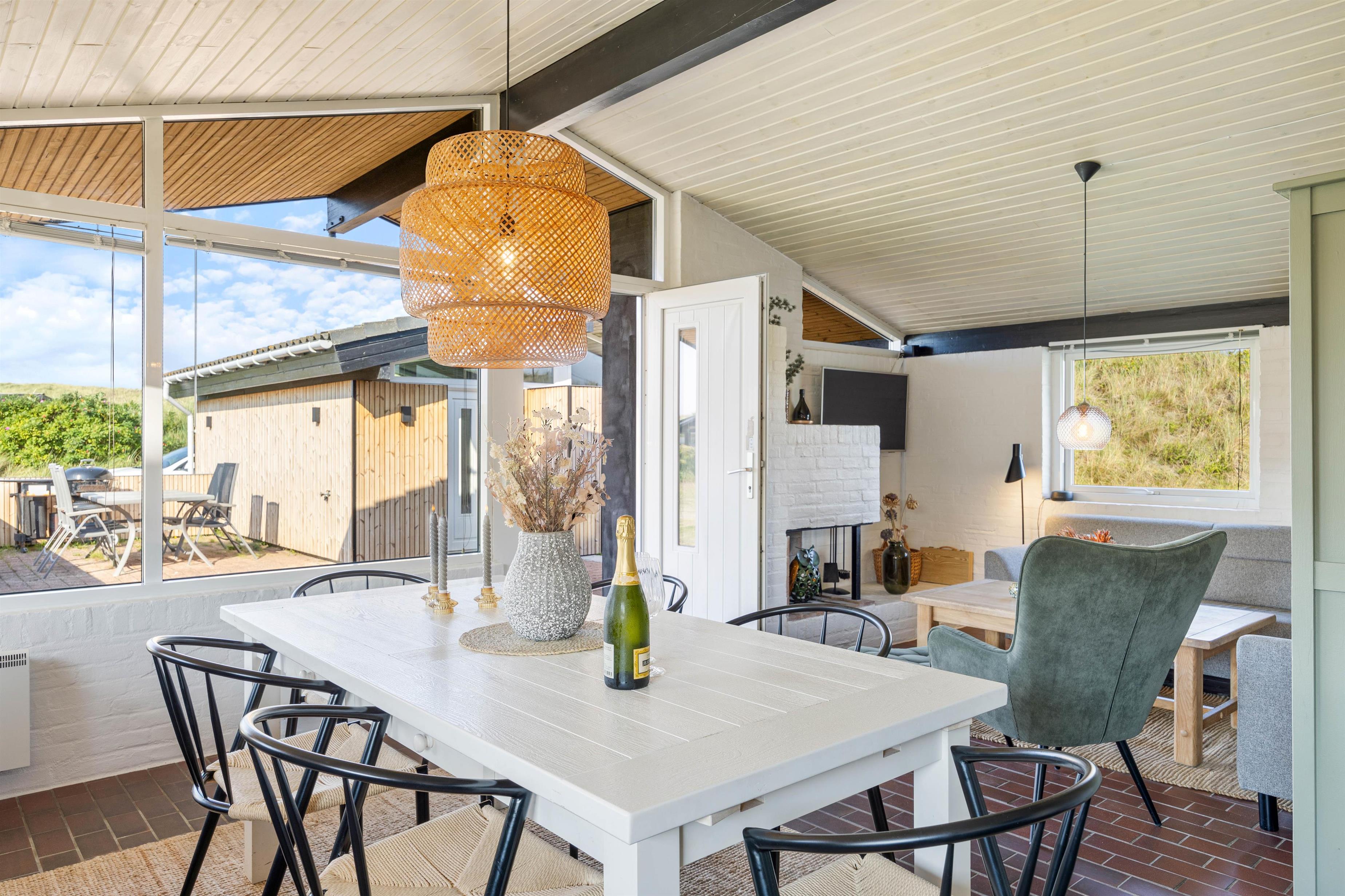 Feriehuset er også ideelt i de køligere måneder af året. Med varmen fra ilden i den åbne pejs kan I mærke både hyggen og feriestemningen på mørke aftener. Den energibesparende luft-til-luft varmepumpe sørger for behagelige temperaturer i feriehuset og hjælper med at holde inde luften frisk hele tiden.