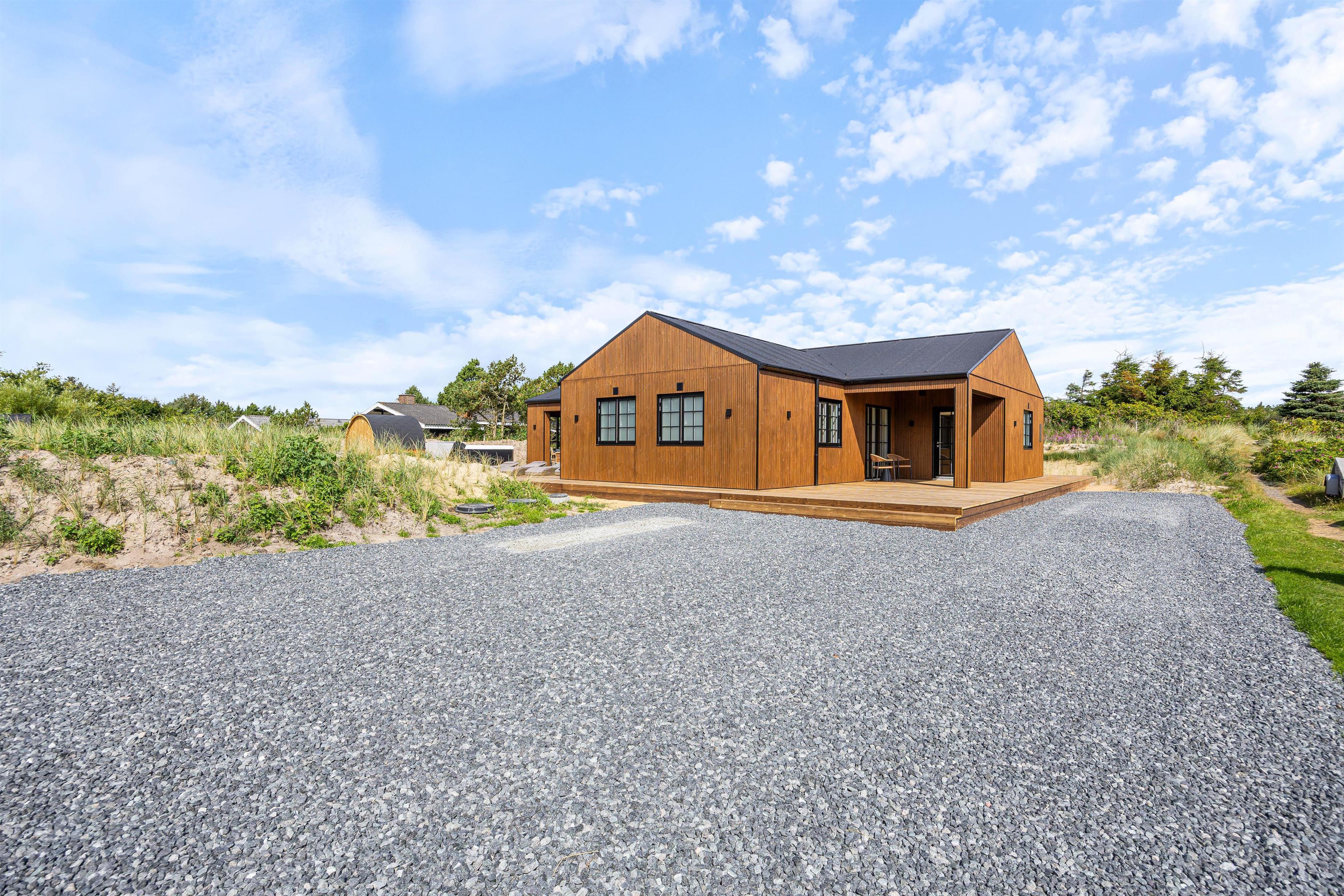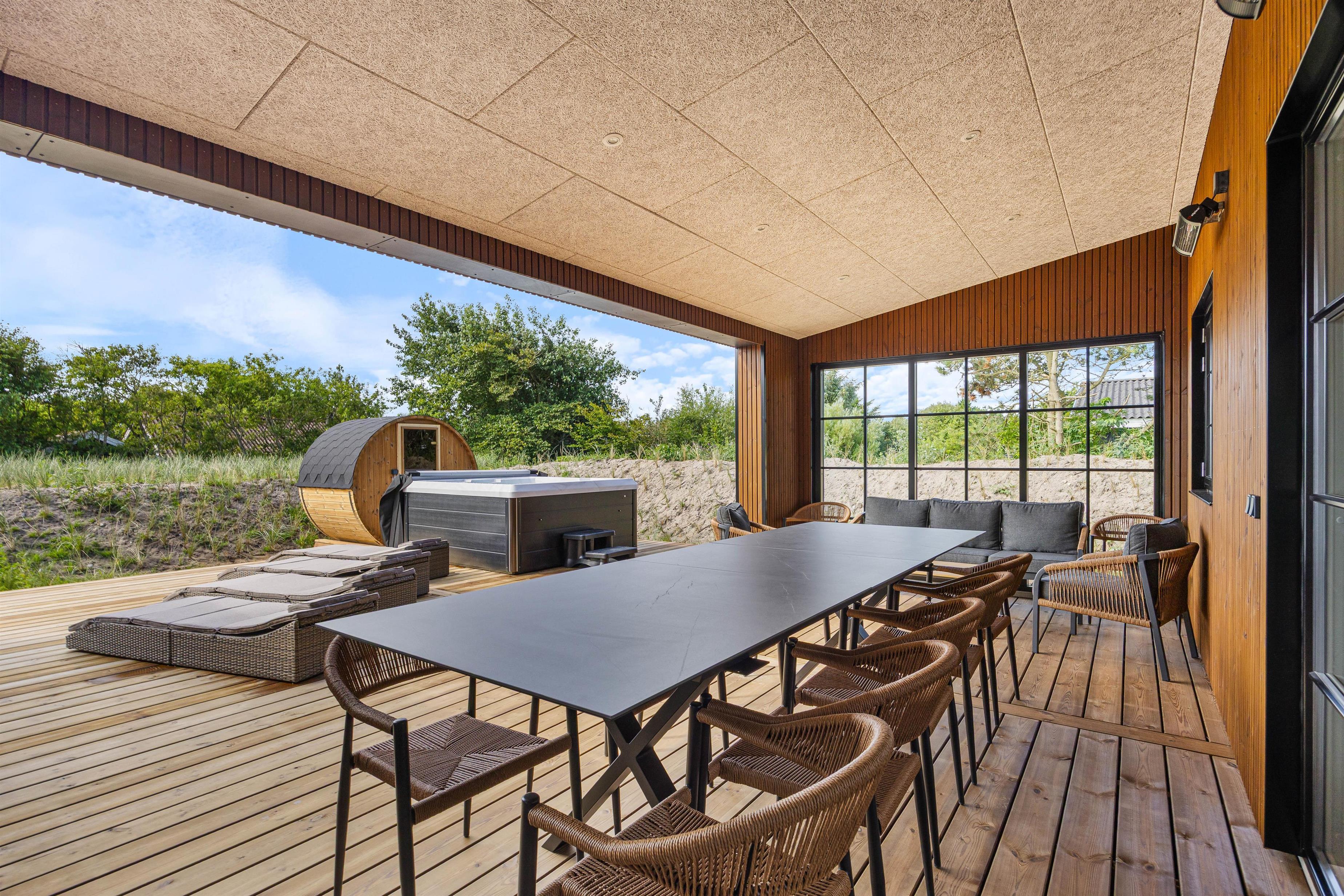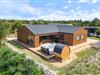 Det moderne sommerhus har et rummeligt og veludstyret udendørsområde. På den godt 1200 m² store naturgrund er der forskellige terrasseområder med gasgrill, havemøbler og liggestole. Terrasserne er delvist overdækkede og delvist afskærmede, så I altid kan finde en plet med sol eller læ. Der er en sandkasse og en gynge, som børnene kan lege i.