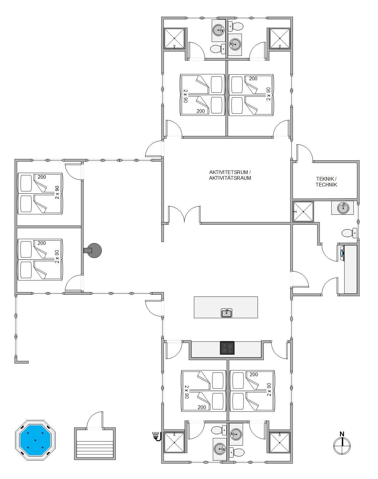 6 soveværelser med hver 2 enkeltsenge giver masser af plads, og 4 af soveværelserne har eget badeværelse med direkte adgang. Endnu et badeværelse betyder, at I kan undgå ventetid om morgenen. I alt er der 5 moderne badeværelser i sommerhuset.
