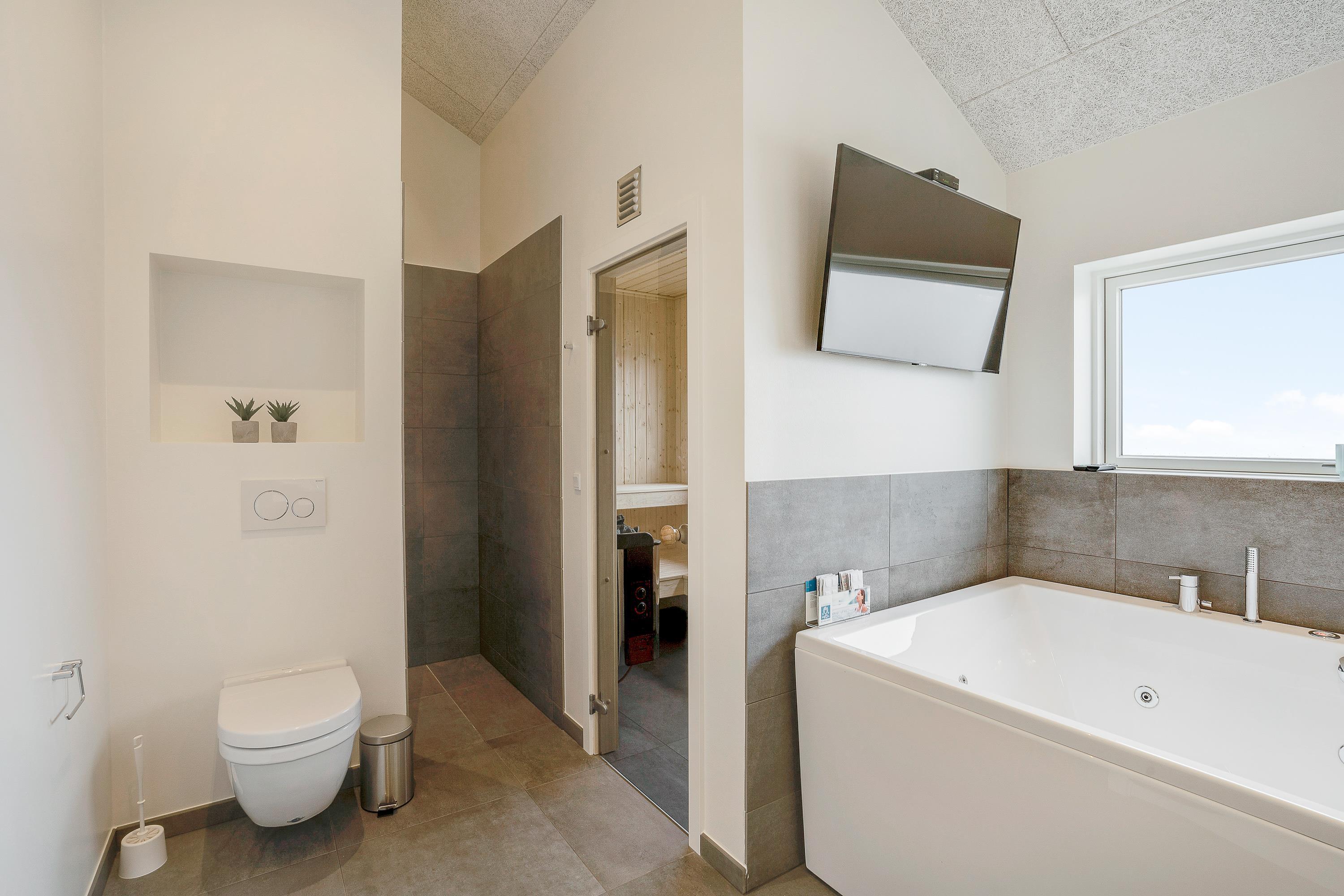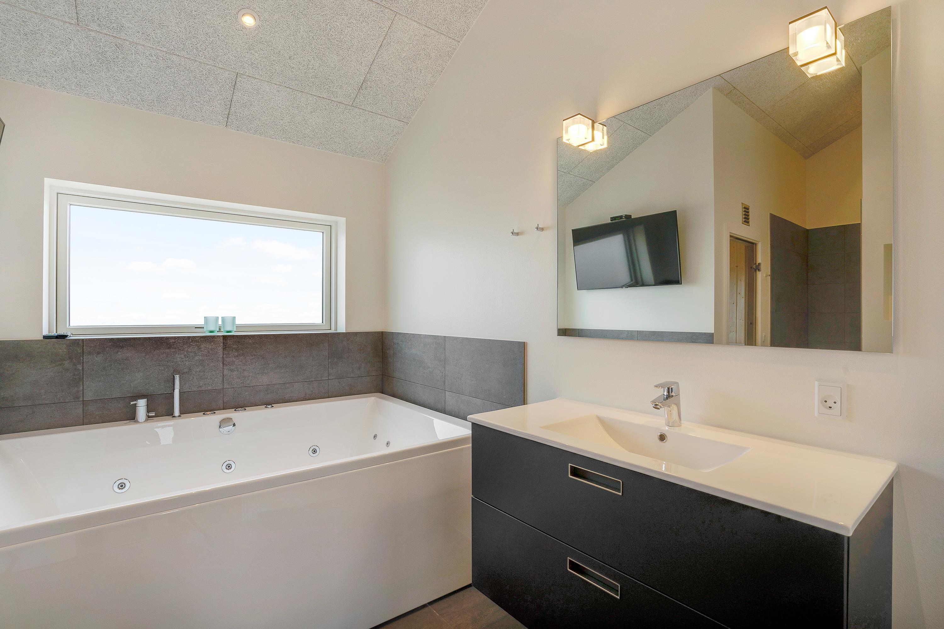 Her har I de perfekte forudsætninger for at slappe af og komme helt ned i gear. De lyse farver skaber en indbydende atmosfære i hele feriehuset, og i alrummet står brændeovnen klar til at danne ramme om hyggelige stunder. Det største af ferieboligens to badeværelser er indrettet med sauna og spabad, så I kan nyde godt af lidt ekstra wellness på ferien. En energivenlig varmepumpe sørger desuden for, at I altid har et behageligt indeklima, også uden de store omkostninger.