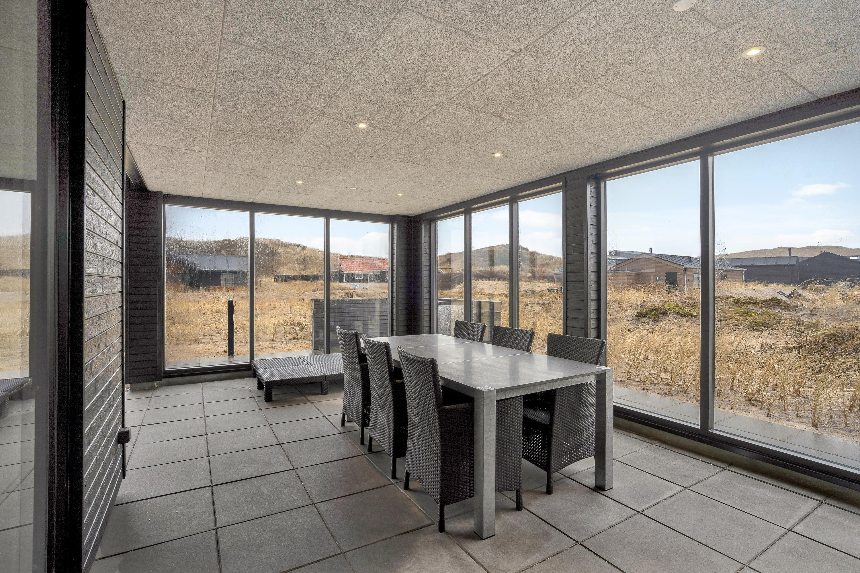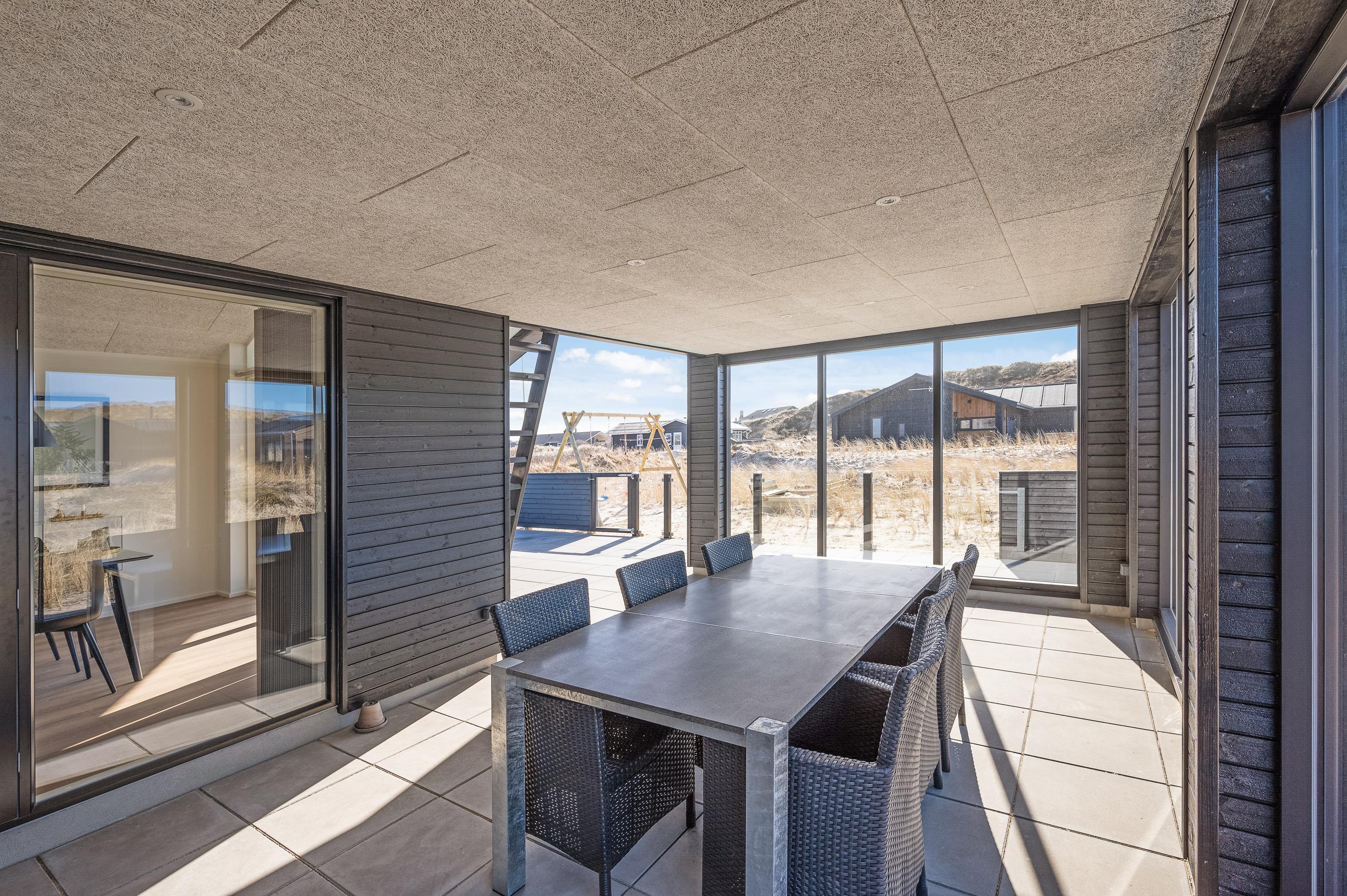 Næsten hele vejen rundt om sommerhuset løber en stor, lækker terrasse med alsidige muligheder for at nyde den friske luft og den flotte natur. Hele terrassen er lukket, og fra stuen træder I ud på en stor, overdækket og afskærmet del, hvor I altid kan finde ly og læ – især praktisk til de hyggelige grillaftener. Her finder I også en udebruser, så I kan skylle jer efter en tur på stranden (kan benyttes fra april til november).