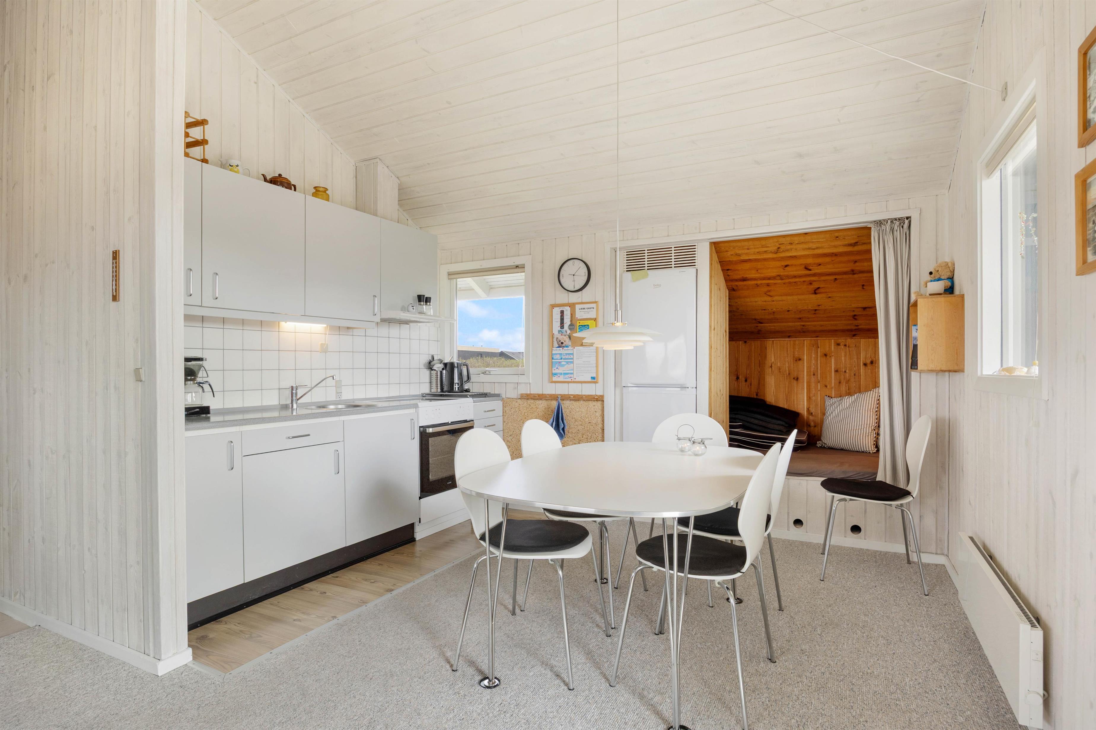 Det hyggelige opholdsrum har et fint lille køkken i åben forbindelse med stuen. Her kan du tage en lur på sofaen eller læse en bog, mens ilden knitrer i brændeovnen. Det er også muligt at holde forbindelsen med familie og venner via den gratis internetforbindelse i feriehuset.