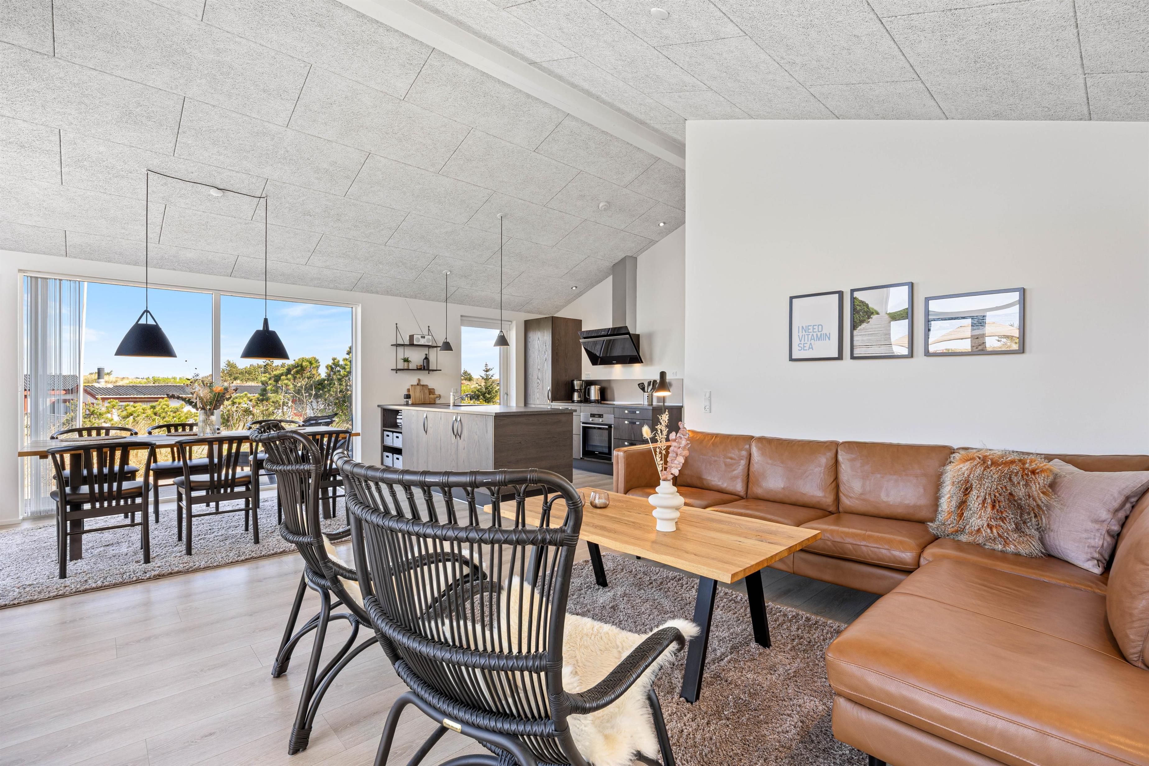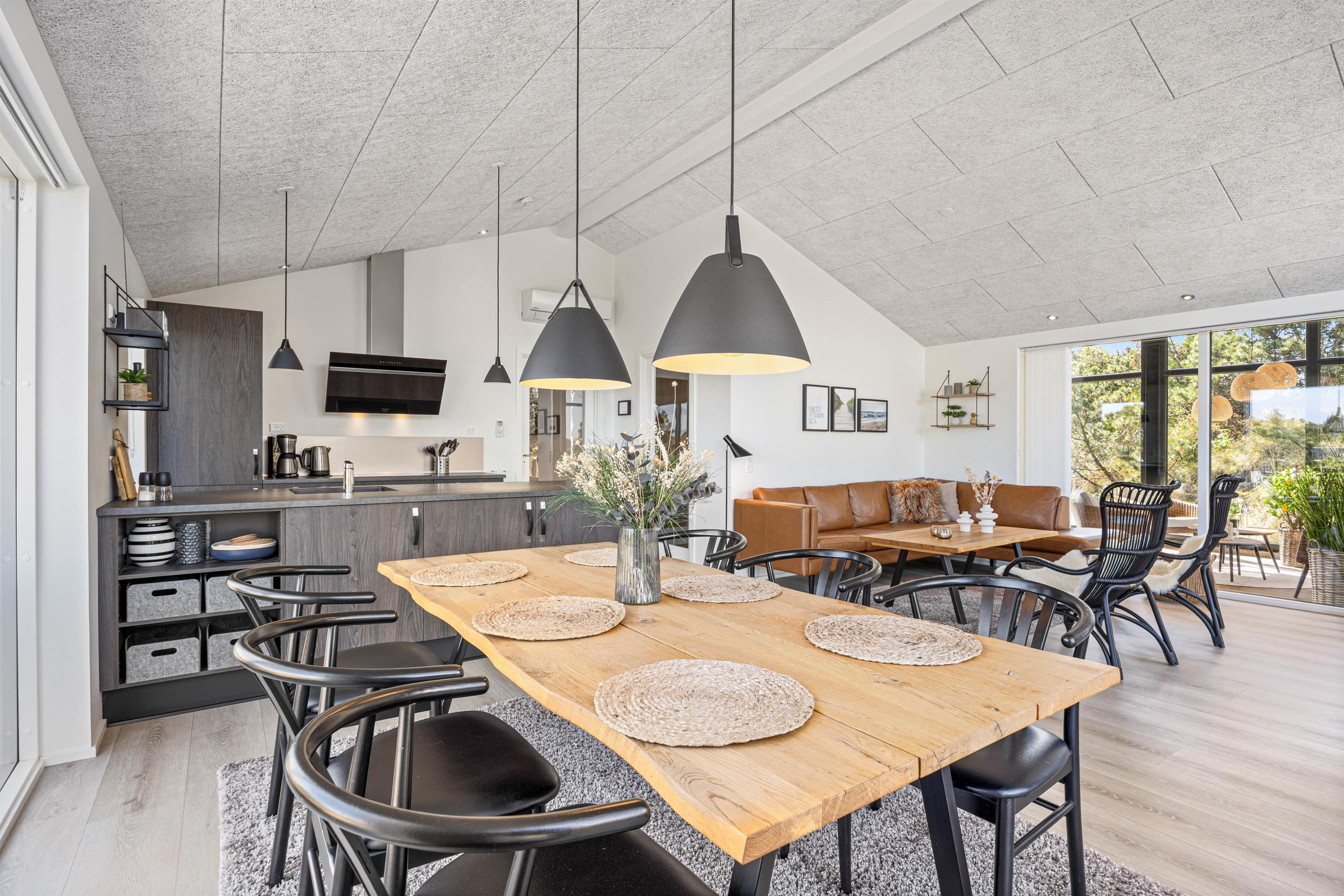 Her kan I hygge jer i de komfortable møbler, se en film eller nyde lækre måltider ved spisebordet, mens brændeovnens knitren skaber en hyggelig atmosfære. I kan tilberede jeres måltider i det åbne køkken med køkkenø, der giver jer bekvemmeligheder som opvaskemaskine, induktionskogeplade og 80 L frysekapacitet.