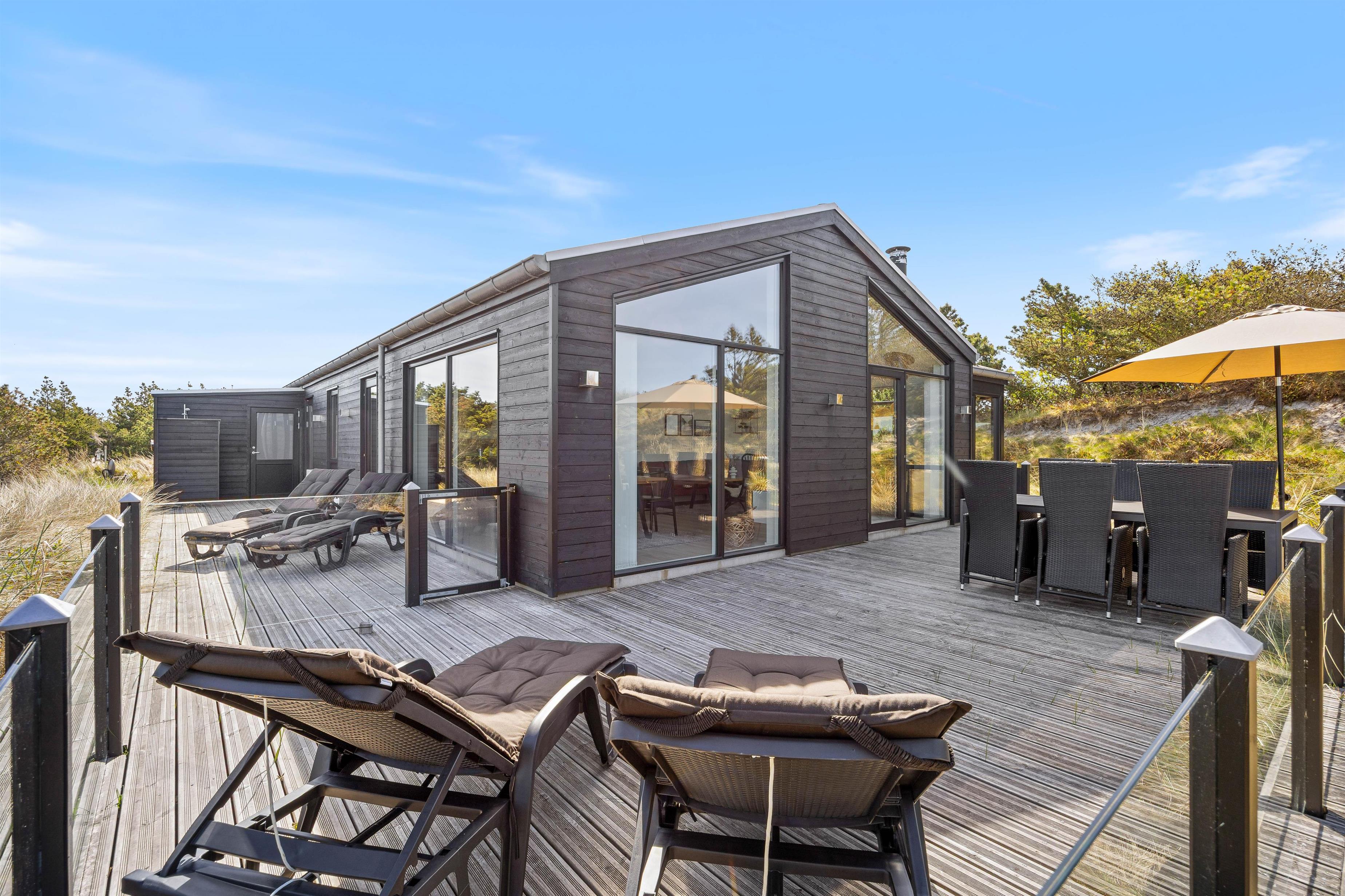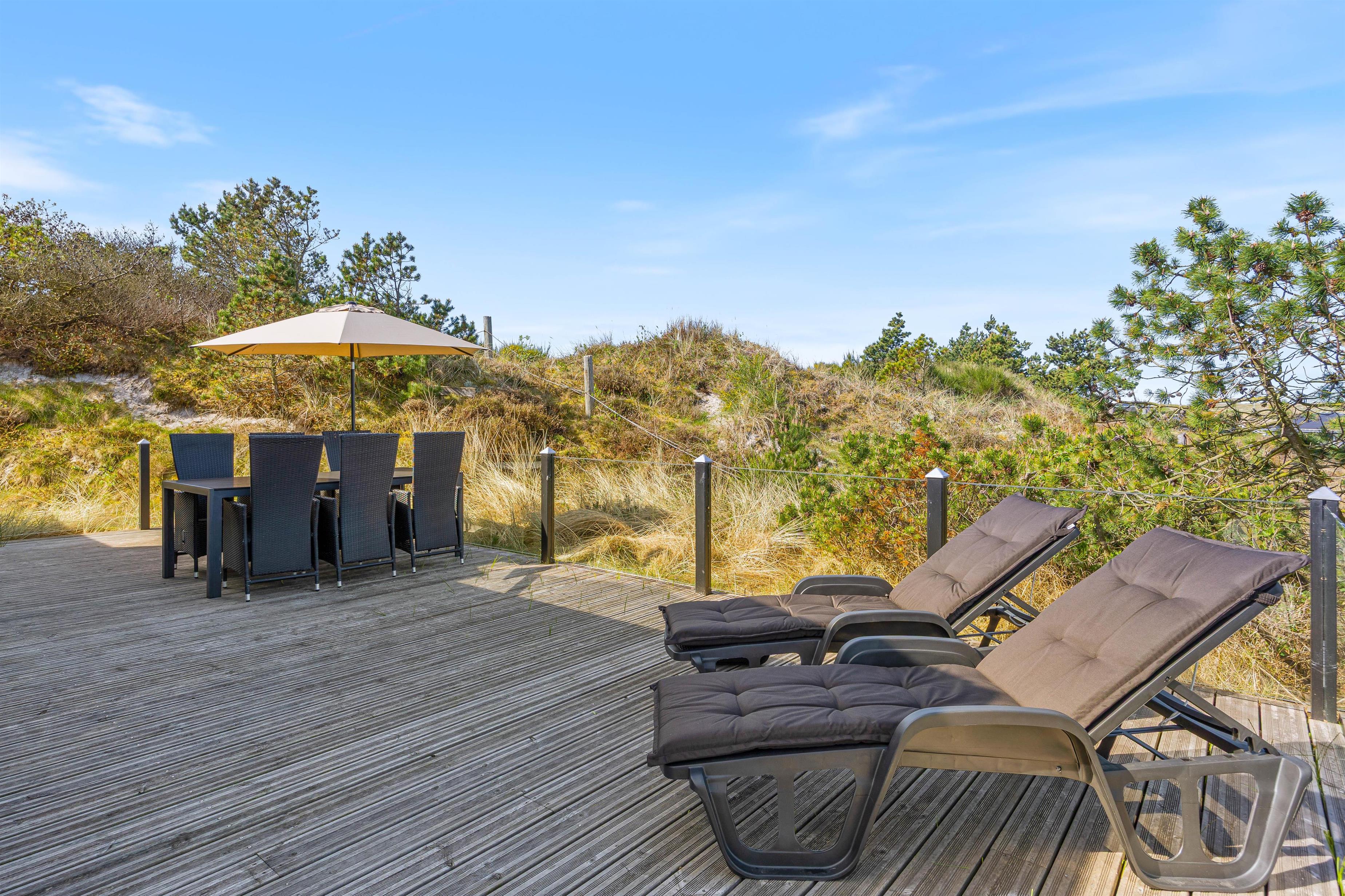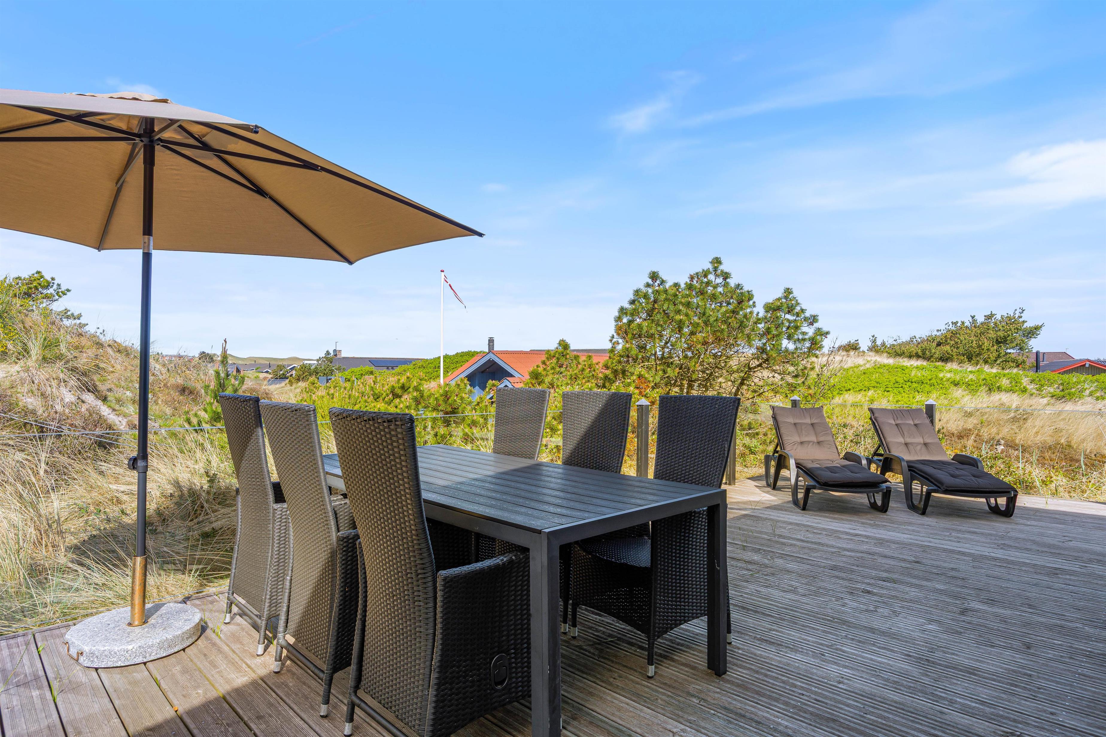 Med et areal på 1221 m² fremstår den kuperede klitgrund som et rigtigt højdepunkt. En gasgrill, komfortable havemøbler og liggestole indbyder til hyggelige grillaftener og afslappende soltimer. Der er et afskærmet terrasseområde samt et overdækket område, som giver beskyttelse og komfort året rundt. Udebruseren er tilgængelig fra april til november og er ideel efter et opfriskende dyp i det nærliggende hav eller en tur i saunaen.