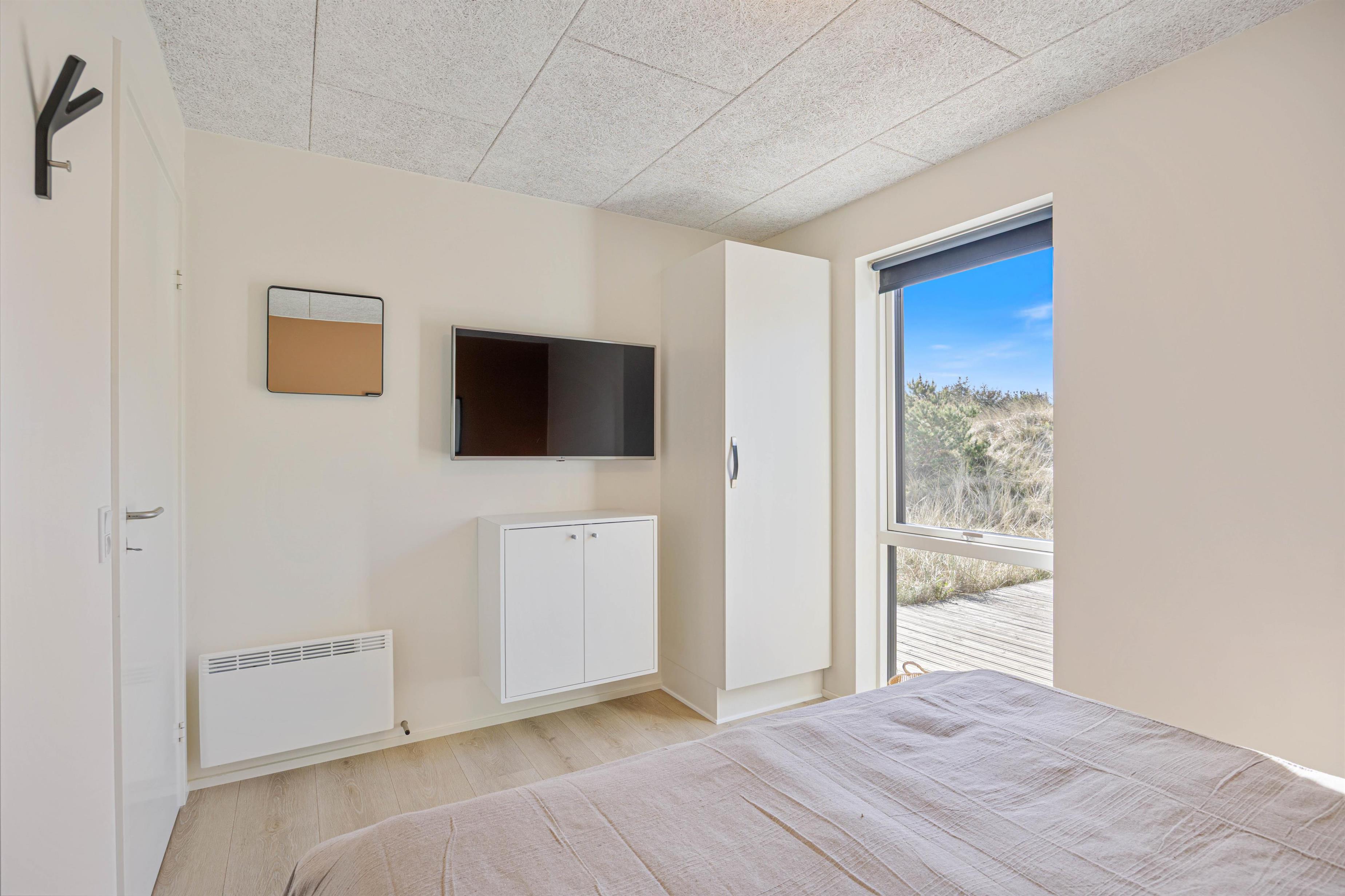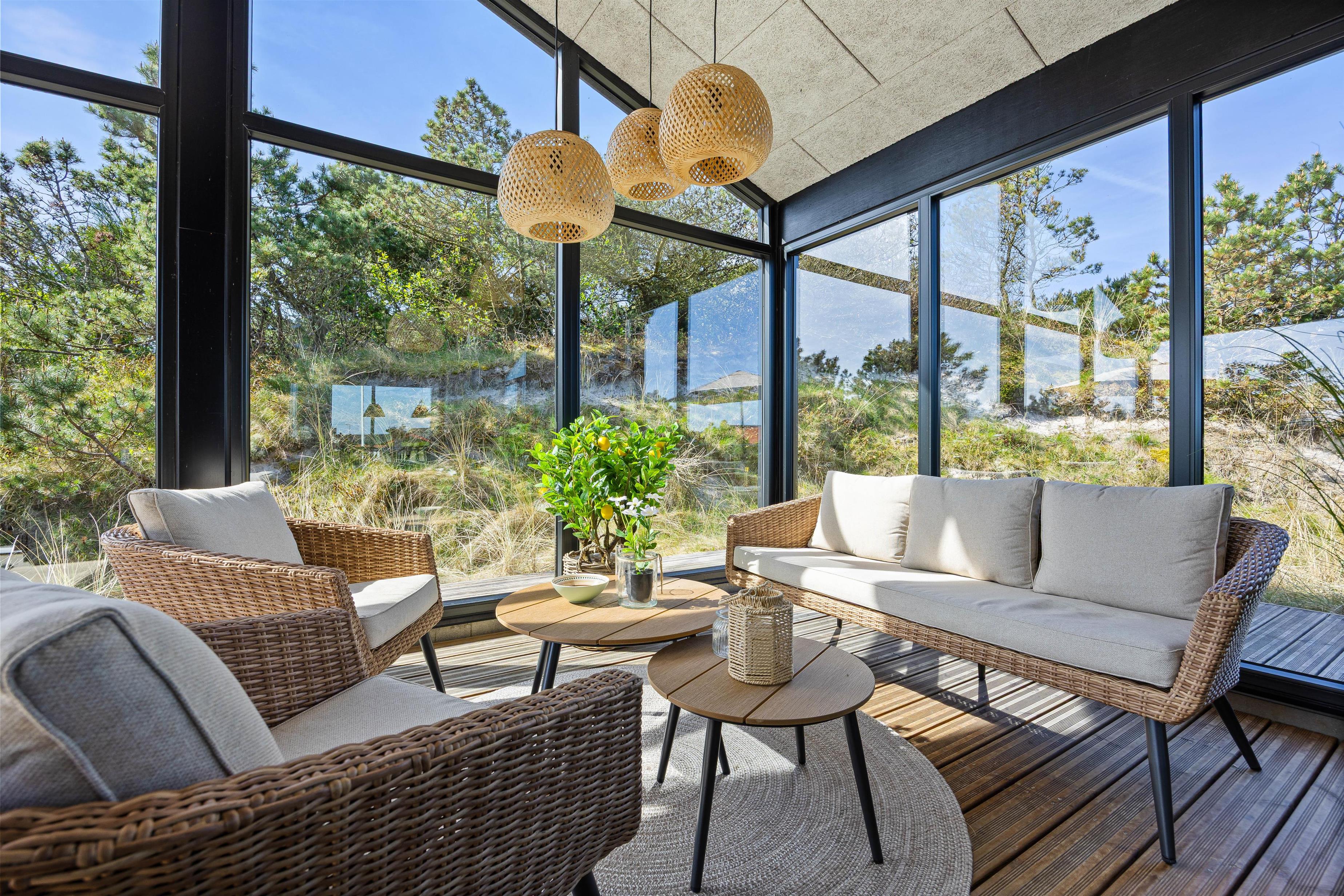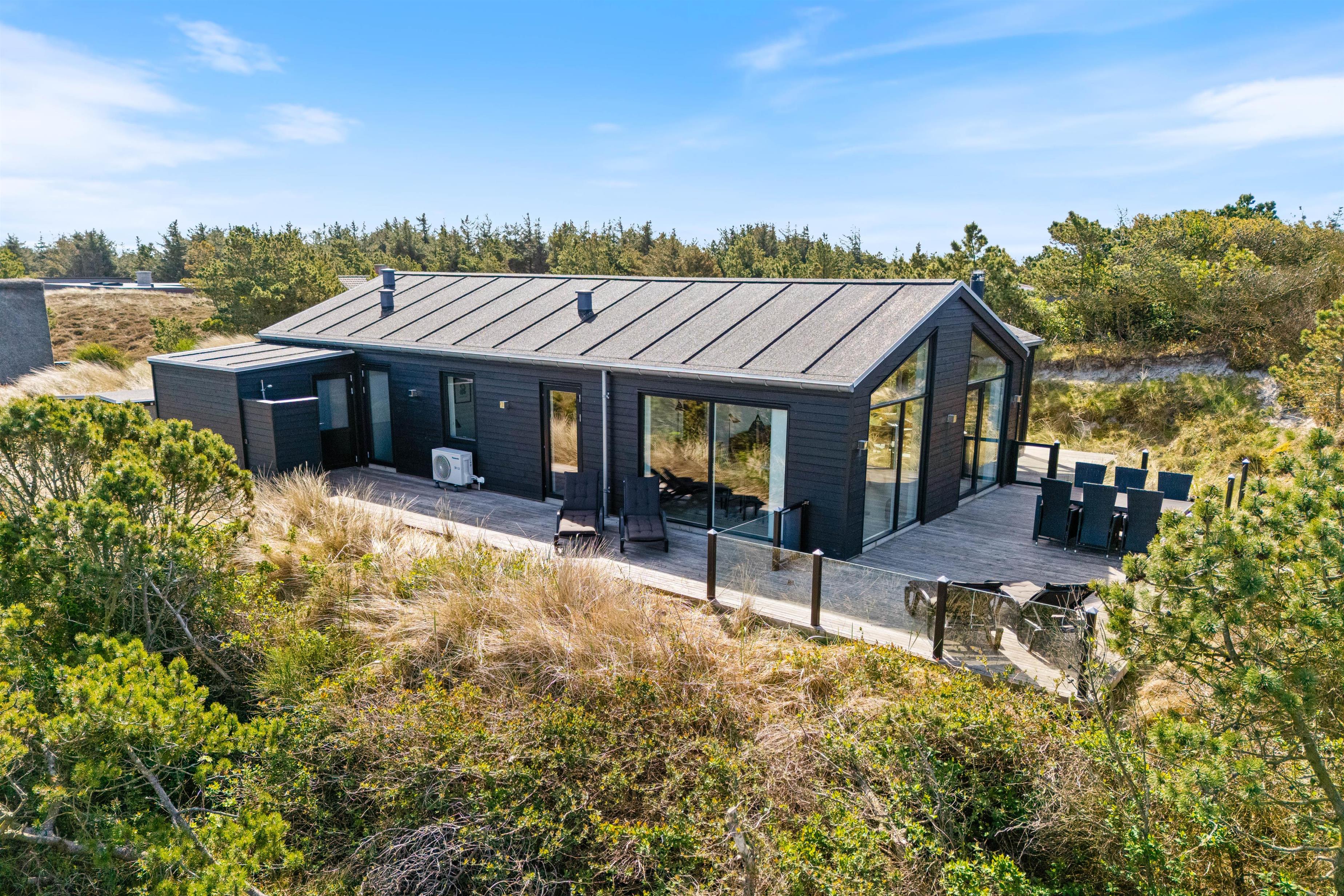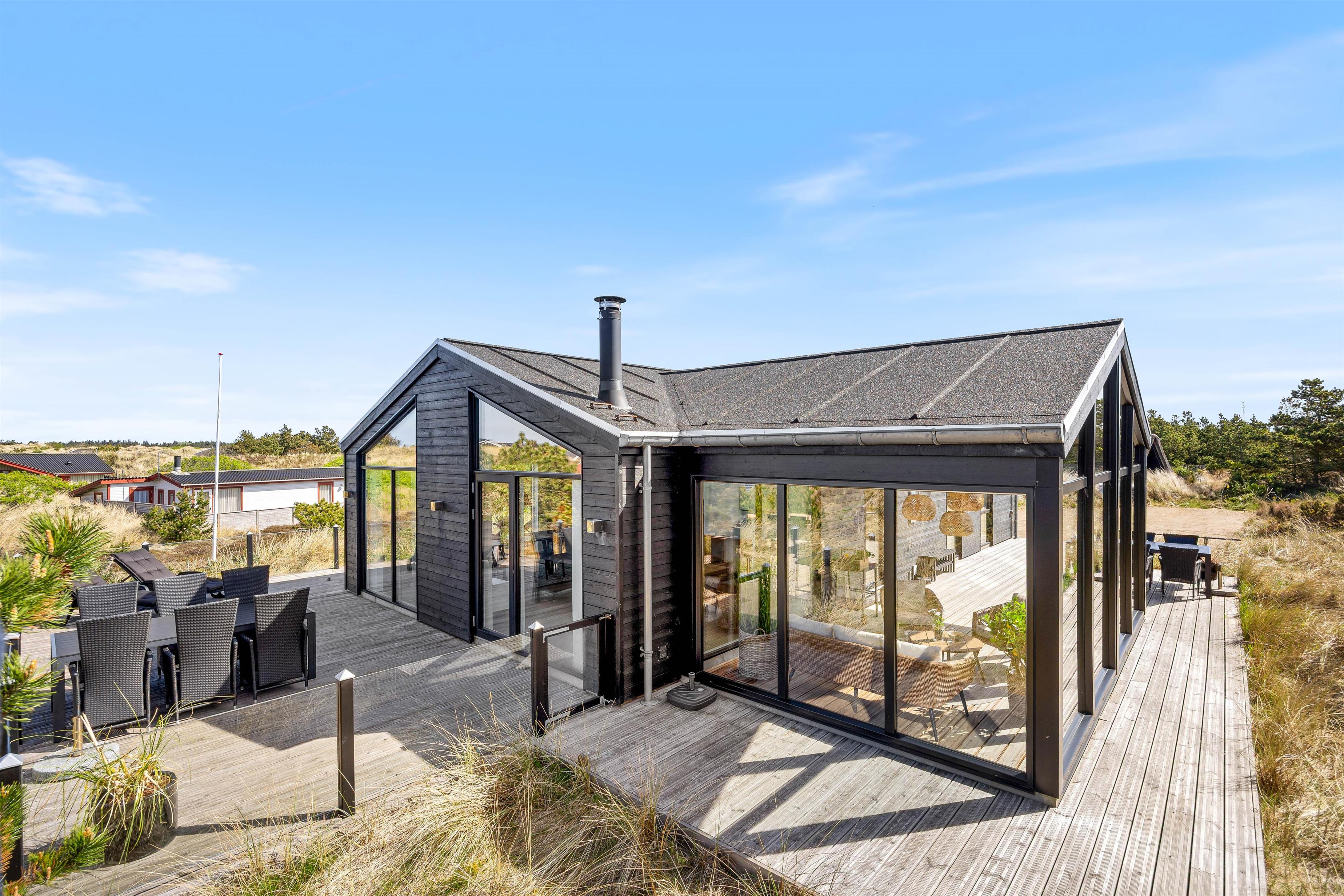 Med et areal på 1221 m² fremstår den kuperede klitgrund som et rigtigt højdepunkt. En gasgrill, komfortable havemøbler og liggestole indbyder til hyggelige grillaftener og afslappende soltimer. Der er et afskærmet terrasseområde samt et overdækket område, som giver beskyttelse og komfort året rundt. Udebruseren er tilgængelig fra april til november og er ideel efter et opfriskende dyp i det nærliggende hav eller en tur i saunaen.