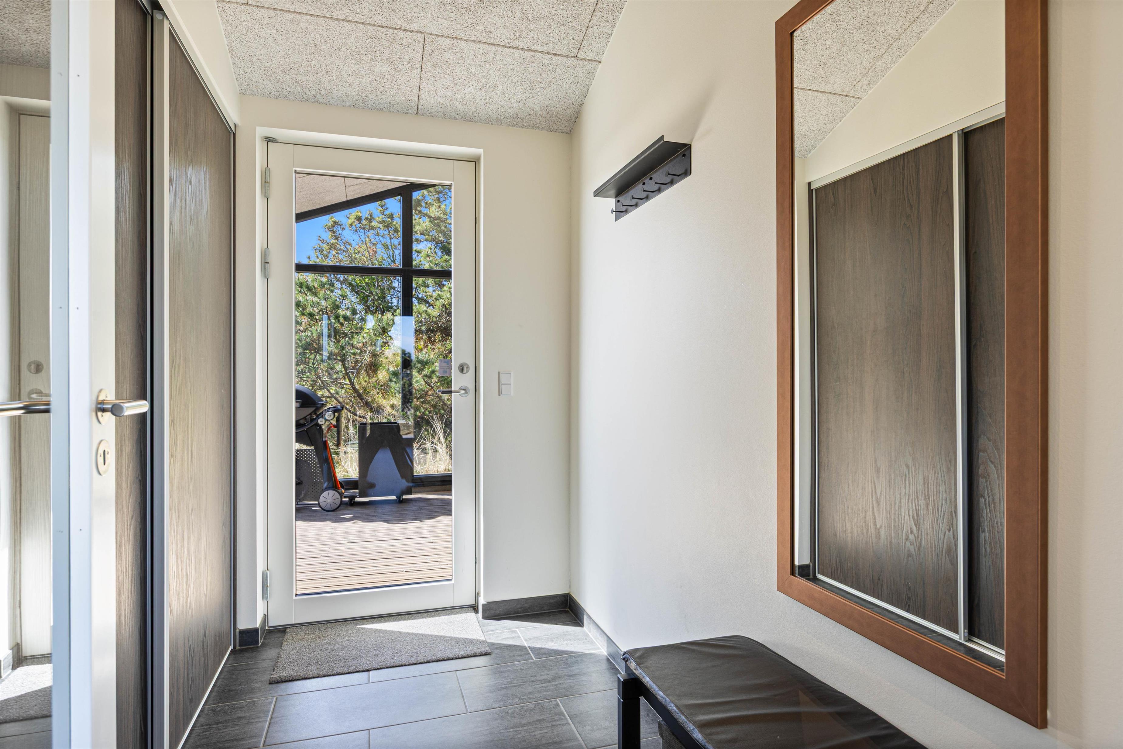 Et rummeligt entréområde, der er udstyret med vaskemaskine og tørretumbler, giver plads til jakker og sko. De 2 moderne badeværelser har gulvvarme. Et af sommerhusets højdepunkter er saunaen med adgang til udebruseren, som kan tilgås gennem det store badeværelse.