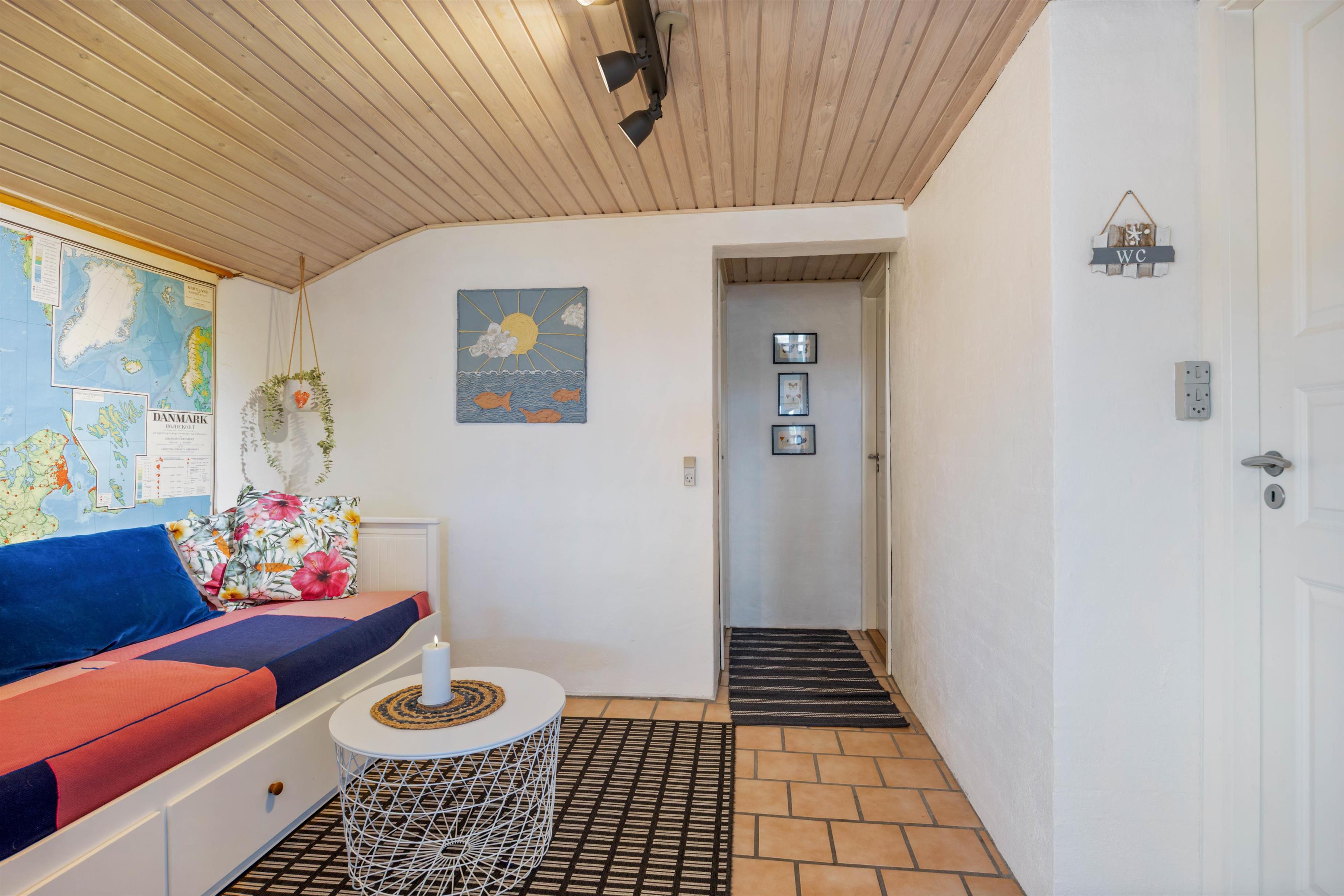 Den lyse og venlige indretning byder velkommen så snart, du træder ind over dørtrinnet. I stuen er brændeovnen, der sørger for varme og hyggestemning på de køligere aftener, samt en energibesparende luft-til-luft varmepumpe, der sikrer en behagelig temperatur hele året. Det åbne køkken med klinker er udstyret med alt, hvad I behøver for at forkæle hinanden med lækre hjemmelavede måltider, herunder opvaskemaskine.