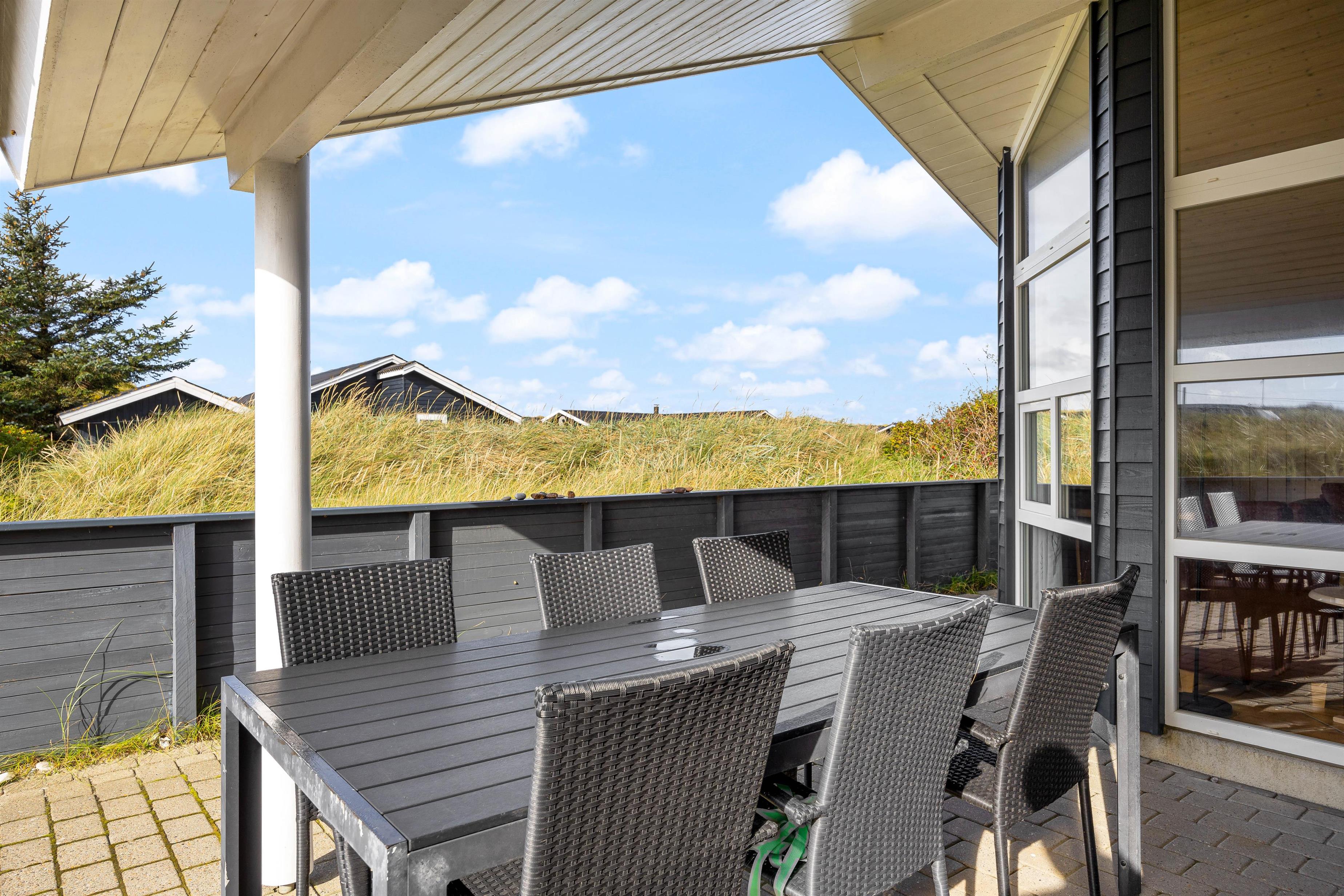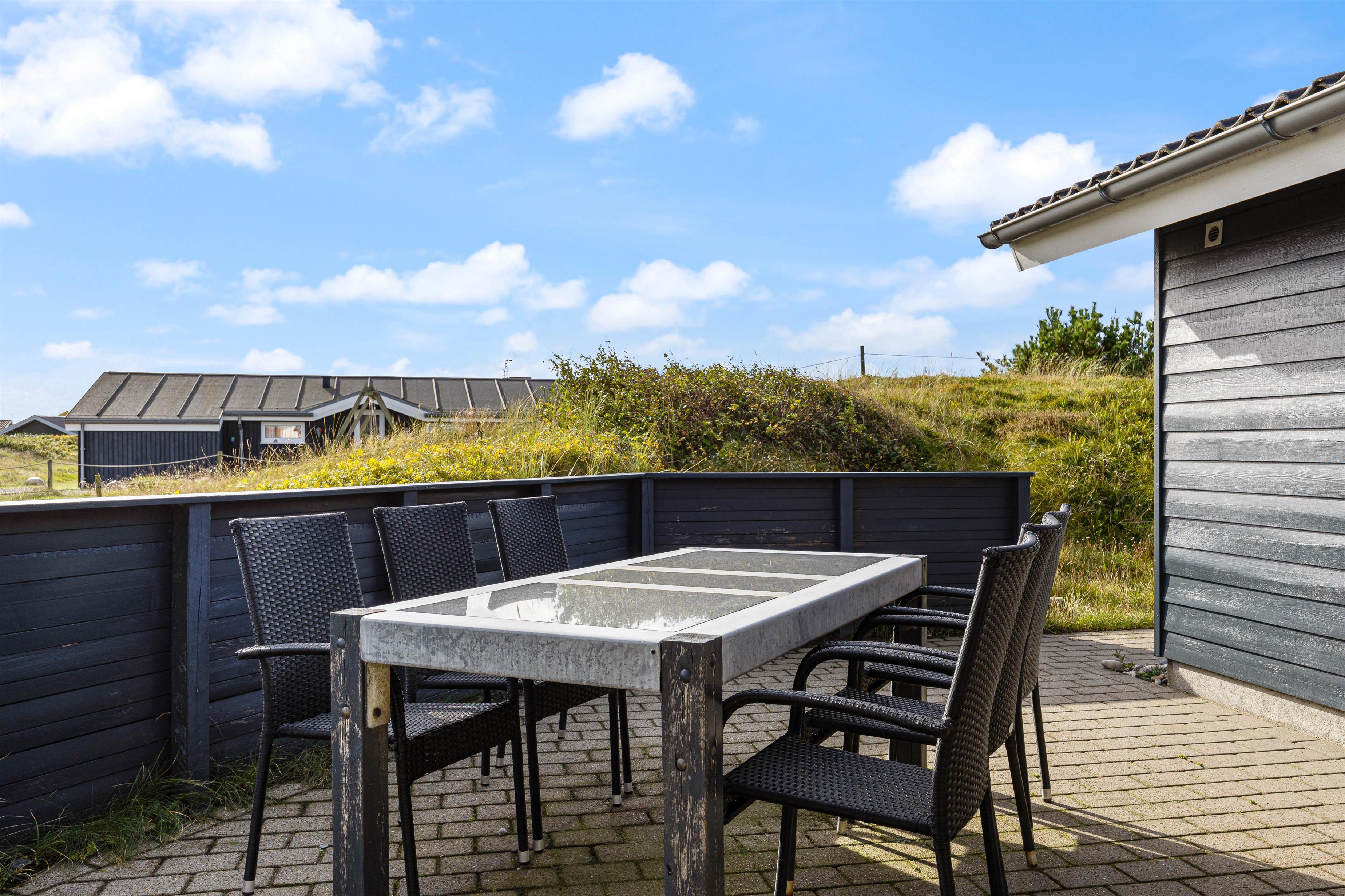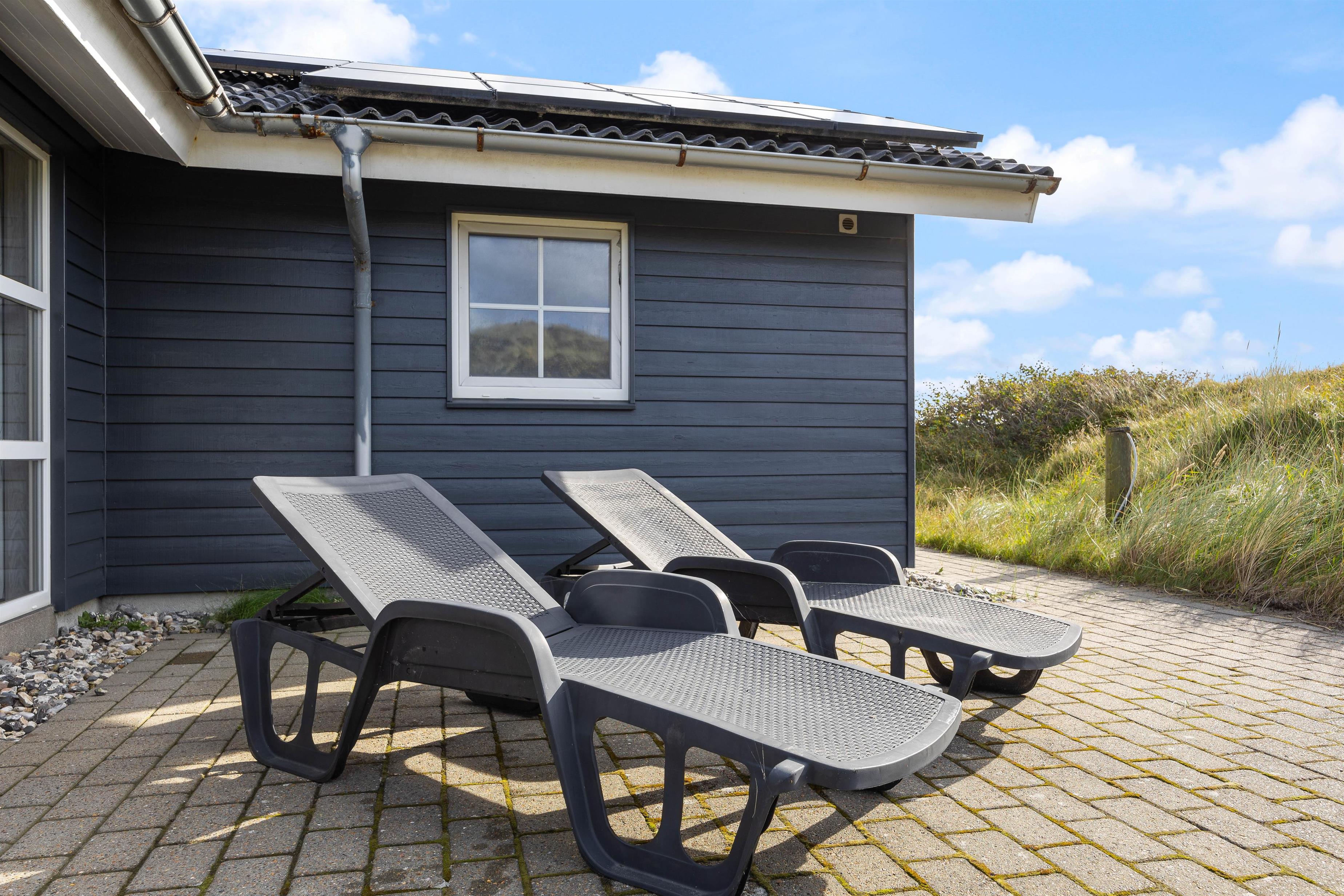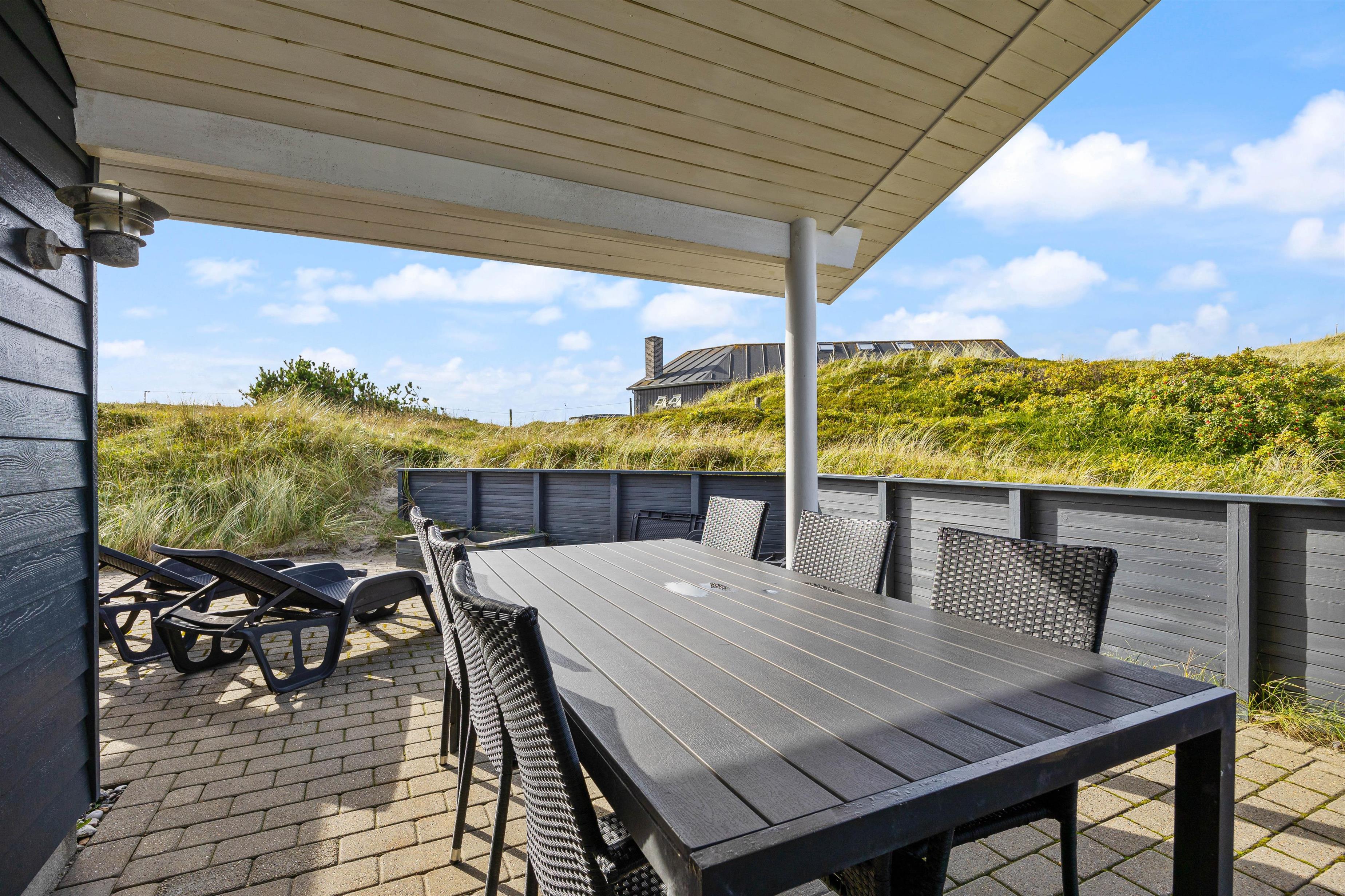 Udendørsfaciliteterne kan I benytte i al slags vejr. Terrassen har både et åbent, et afskærmet og en overdækket del, så I kan solbade i de komfortable liggestole eller trække jer tilbage i havemøblerne med en kop kaffe eller en kølig drink, imens I nyder opholdet på den 1200 m2 store klitgrund. Tænd op i gasgrillen til aften, og nyd et lækkert grillmåltid sammen imens skyggerne bliver lange. Med kun 200 meter til stranden kan I stadig nå en aftentur for at betragte solnedgangen i Vesterhavet.