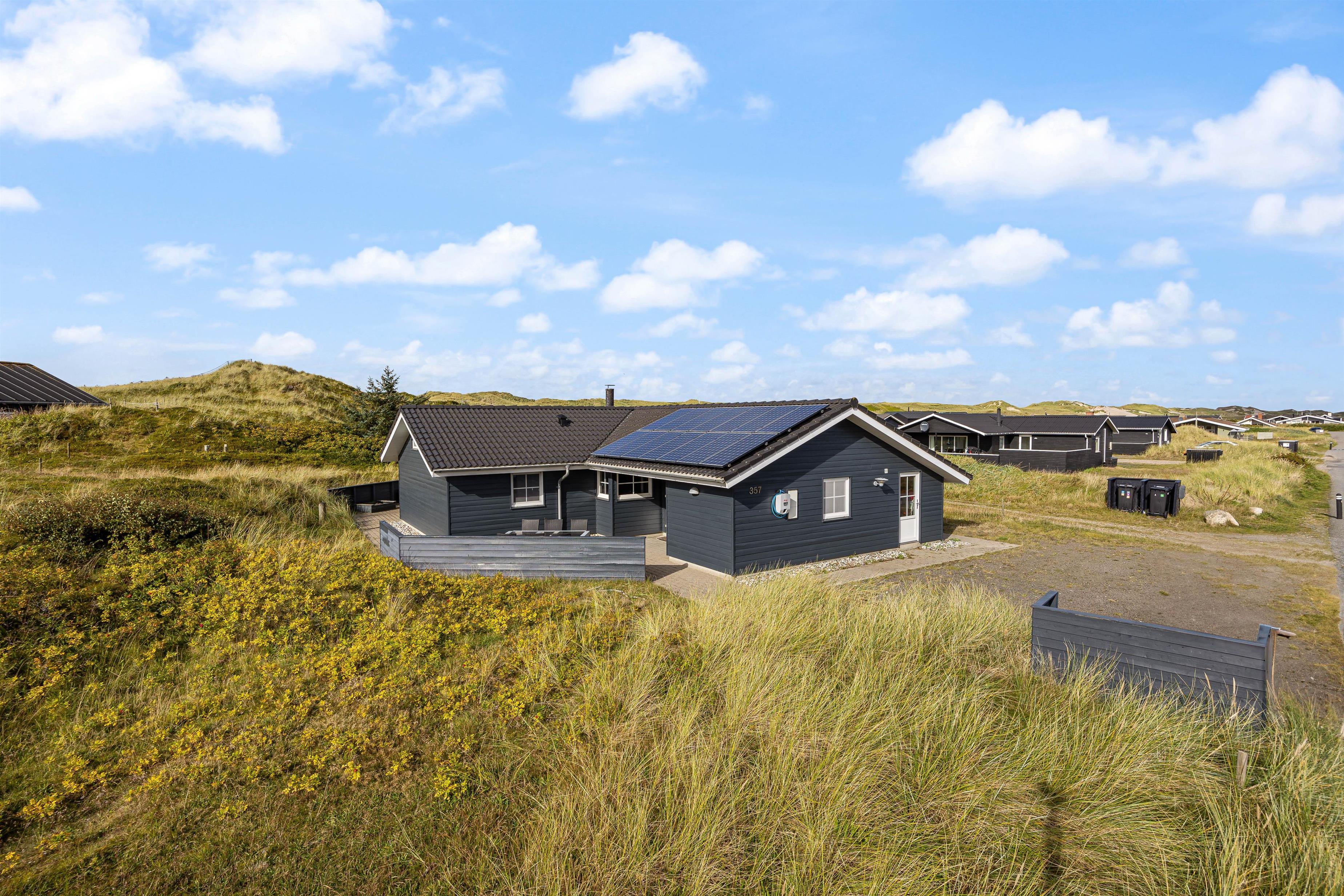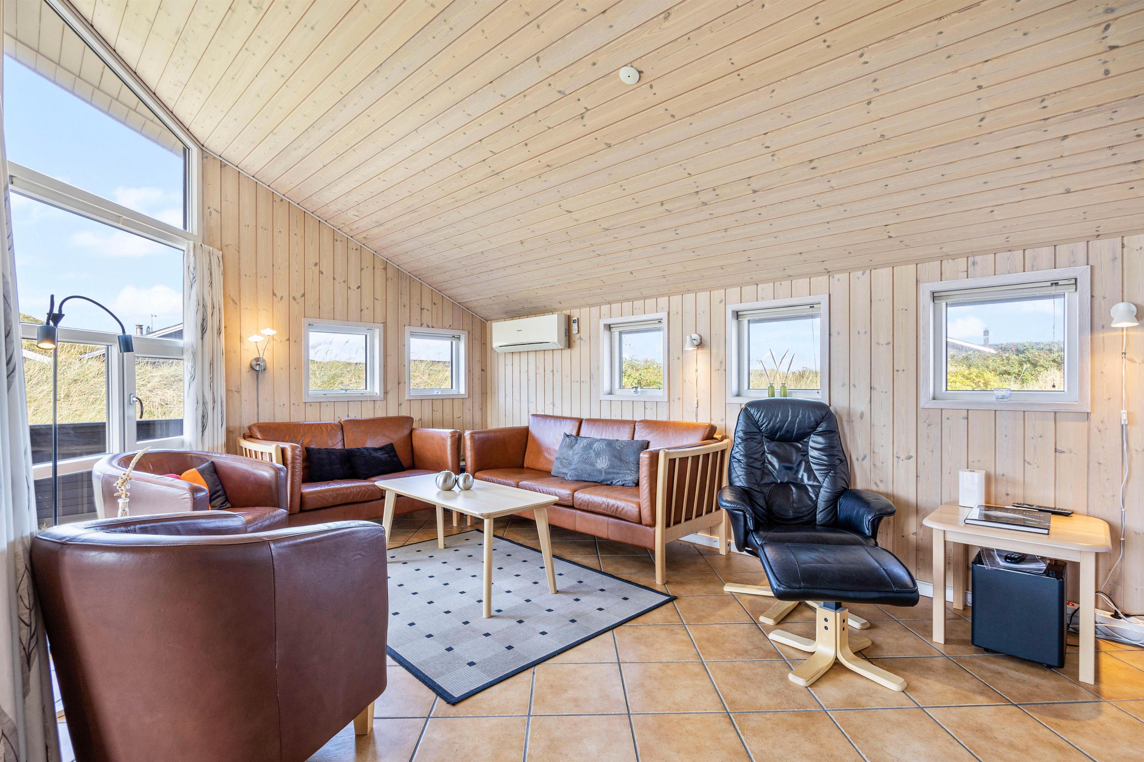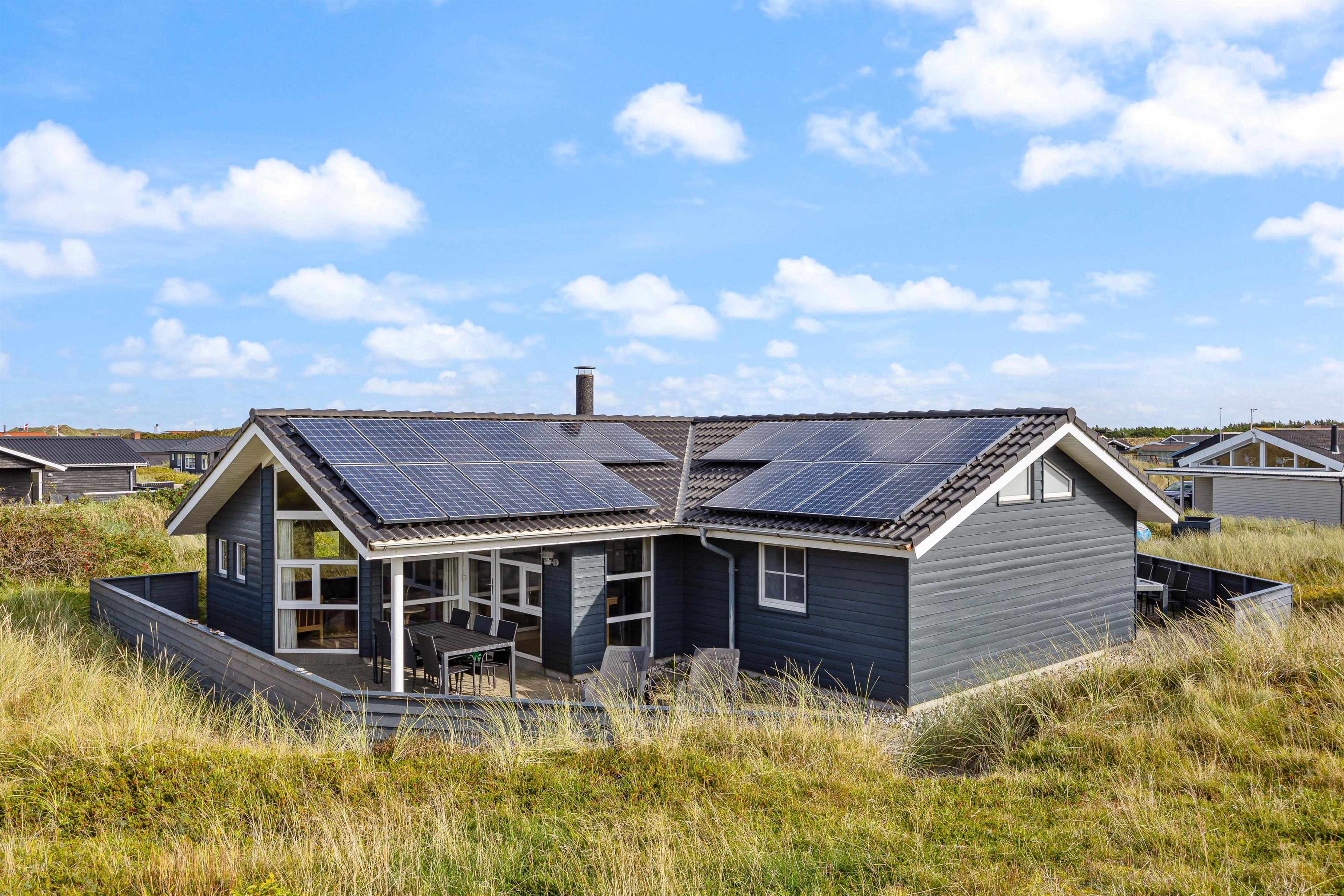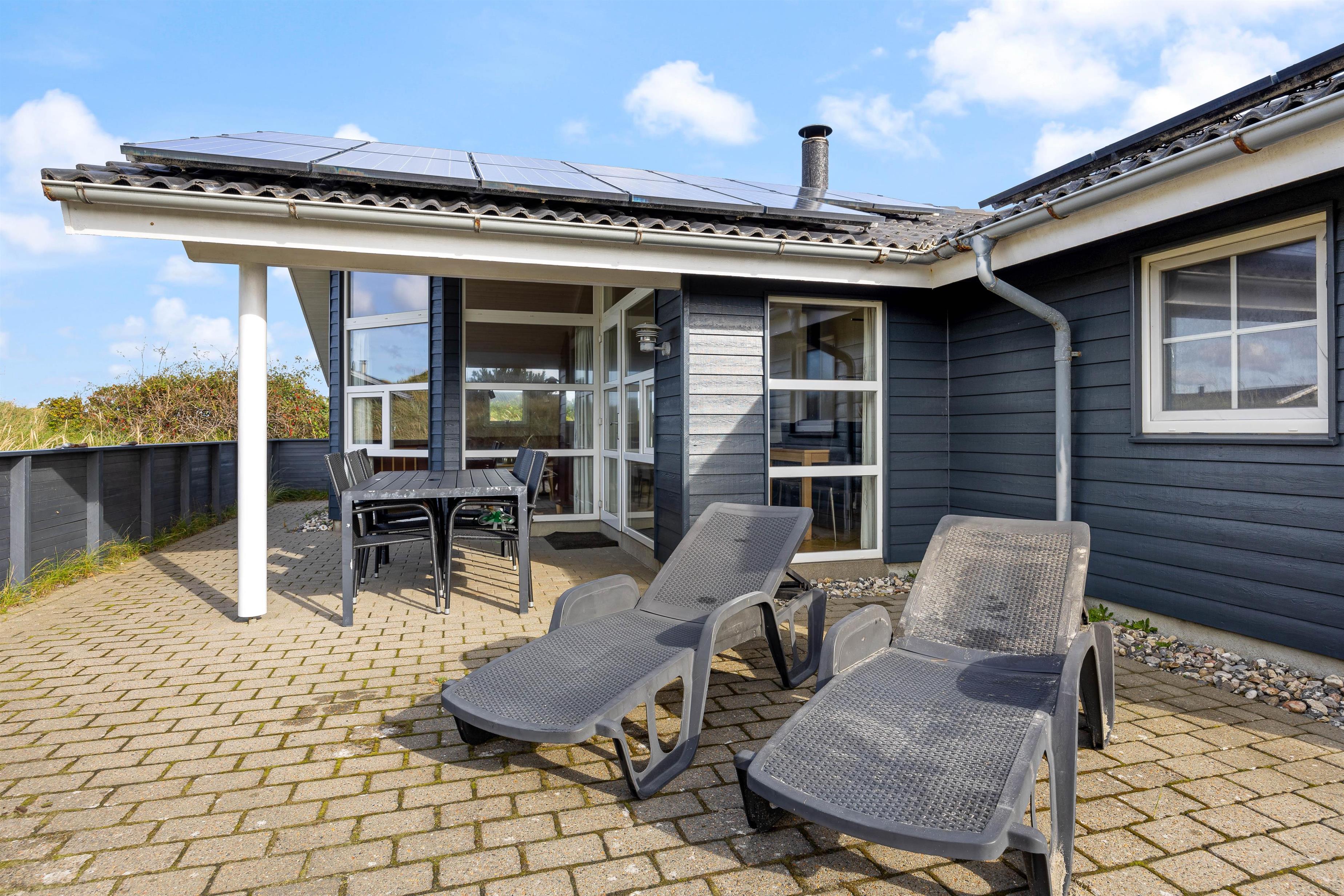 Udendørsfaciliteterne kan I benytte i al slags vejr. Terrassen har både et åbent, et afskærmet og en overdækket del, så I kan solbade i de komfortable liggestole eller trække jer tilbage i havemøblerne med en kop kaffe eller en kølig drink, imens I nyder opholdet på den 1200 m2 store klitgrund. Tænd op i gasgrillen til aften, og nyd et lækkert grillmåltid sammen imens skyggerne bliver lange. Med kun 200 meter til stranden kan I stadig nå en aftentur for at betragte solnedgangen i Vesterhavet.