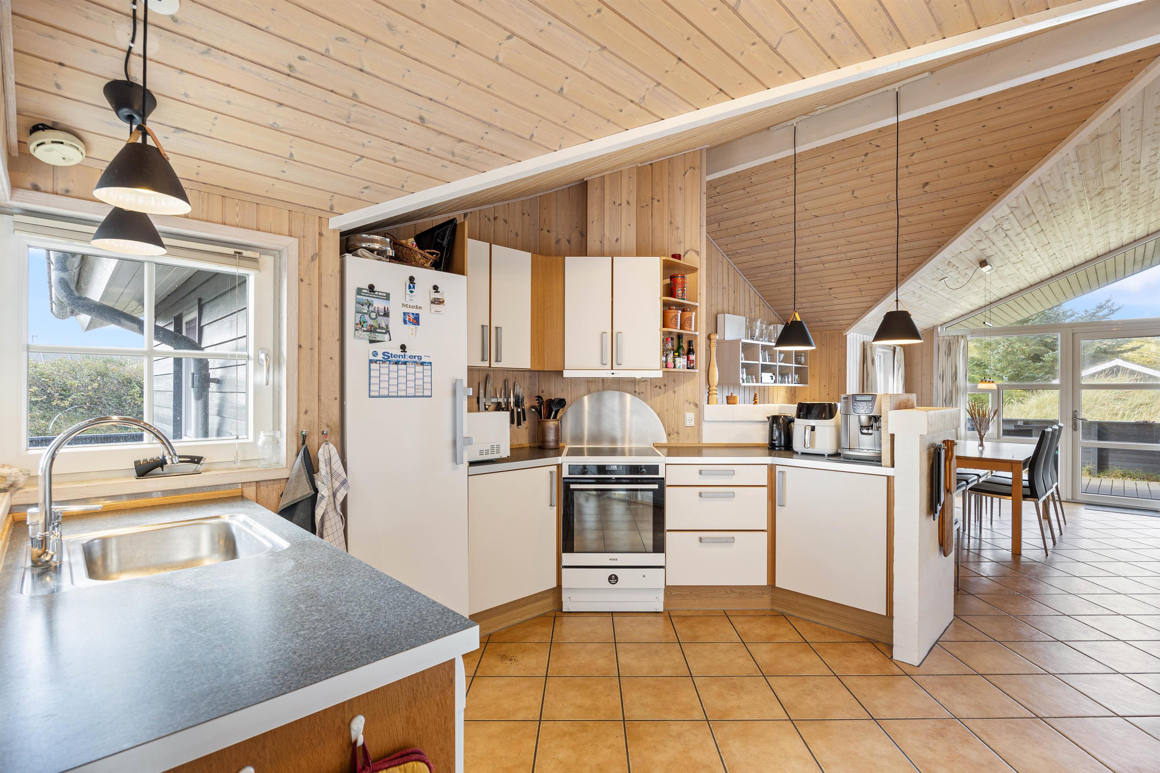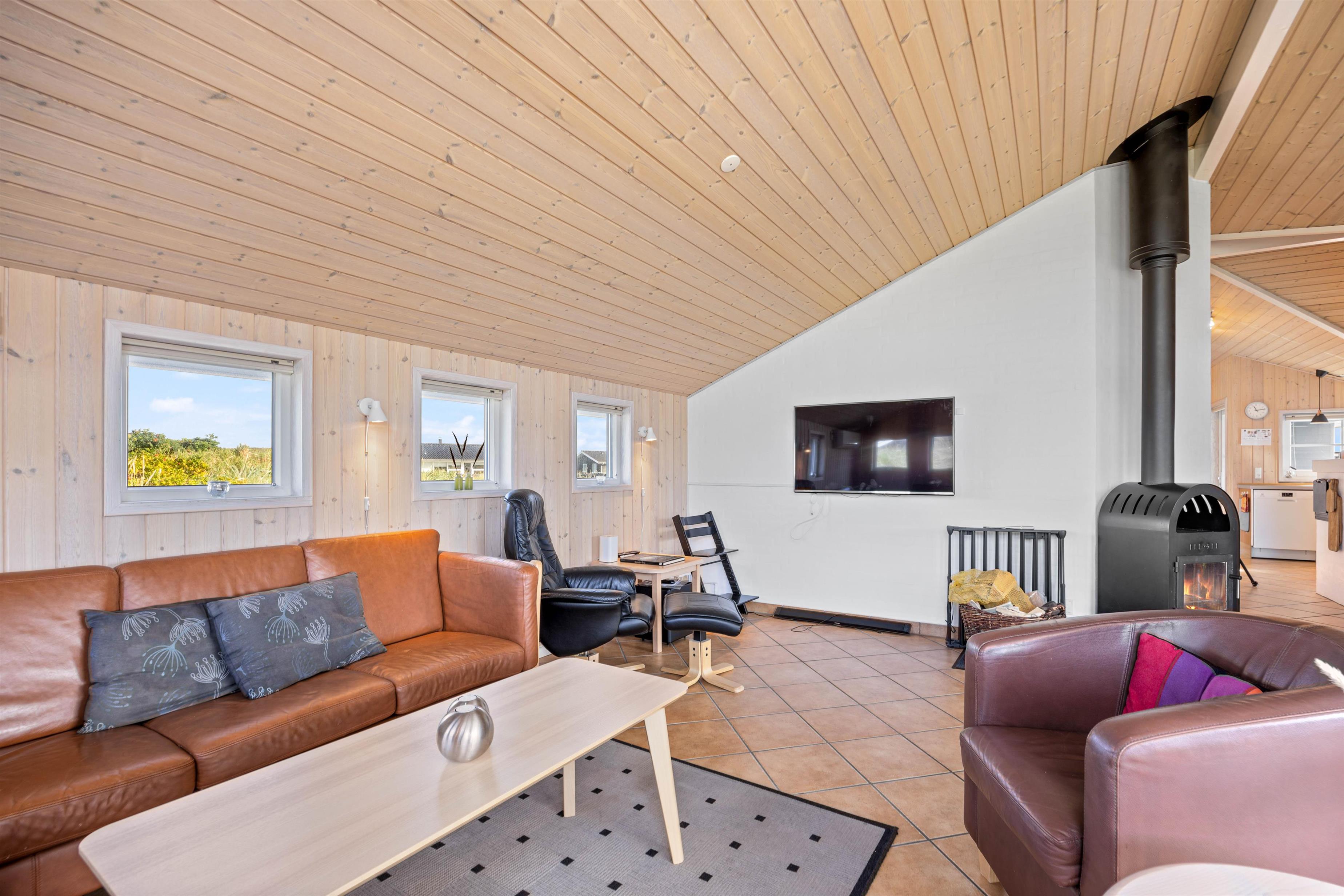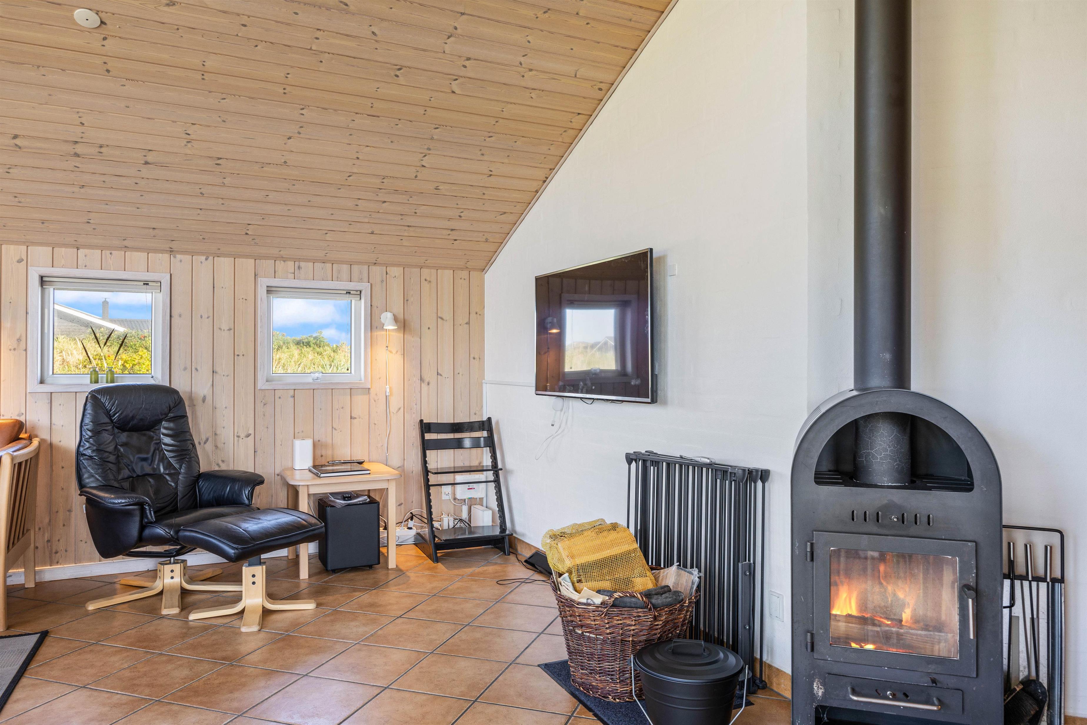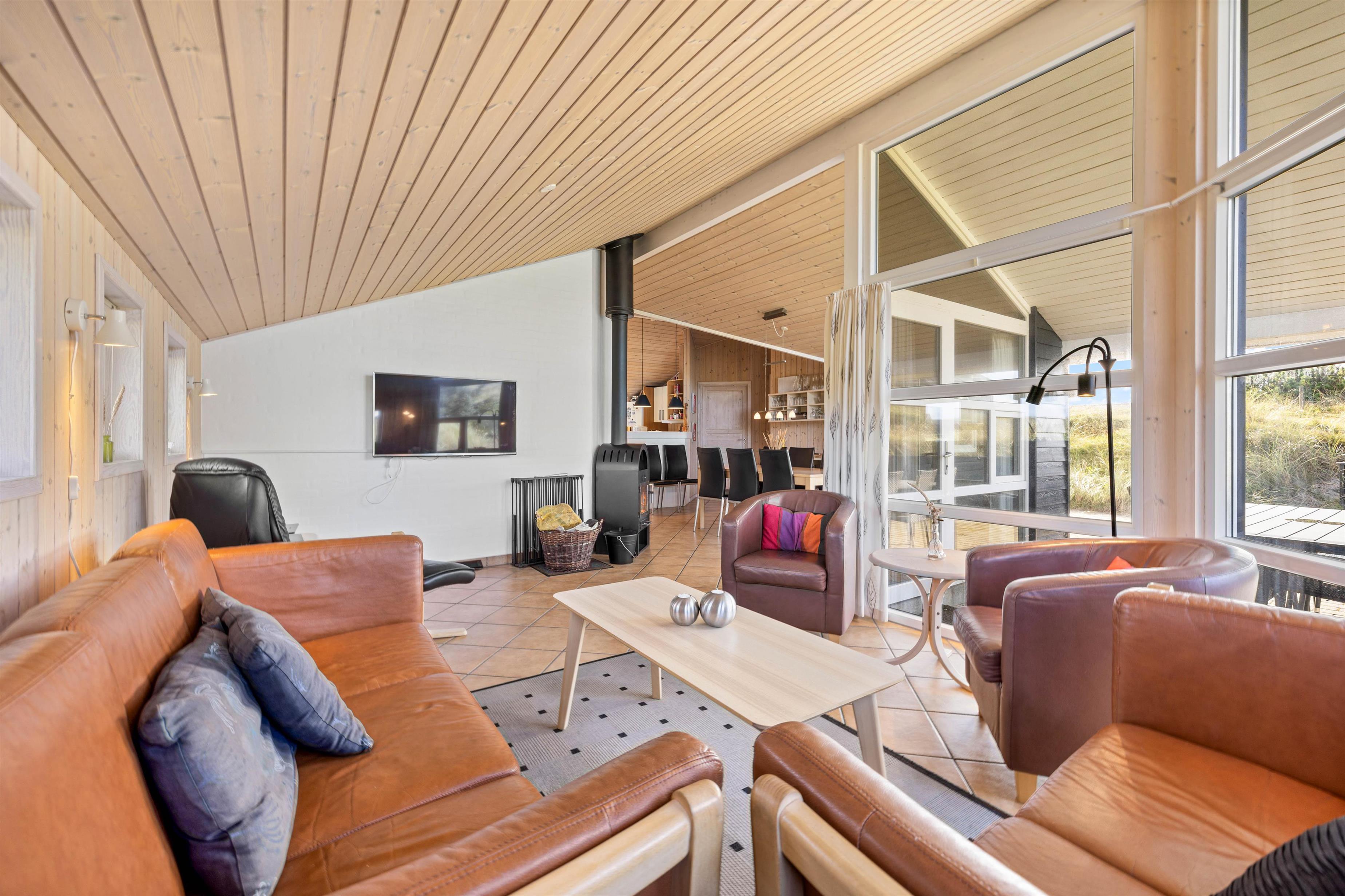 Udendørsfaciliteterne kan I benytte i al slags vejr. Terrassen har både et åbent, et afskærmet og en overdækket del, så I kan solbade i de komfortable liggestole eller trække jer tilbage i havemøblerne med en kop kaffe eller en kølig drink, imens I nyder opholdet på den 1200 m2 store klitgrund. Tænd op i gasgrillen til aften, og nyd et lækkert grillmåltid sammen imens skyggerne bliver lange. Med kun 200 meter til stranden kan I stadig nå en aftentur for at betragte solnedgangen i Vesterhavet.
