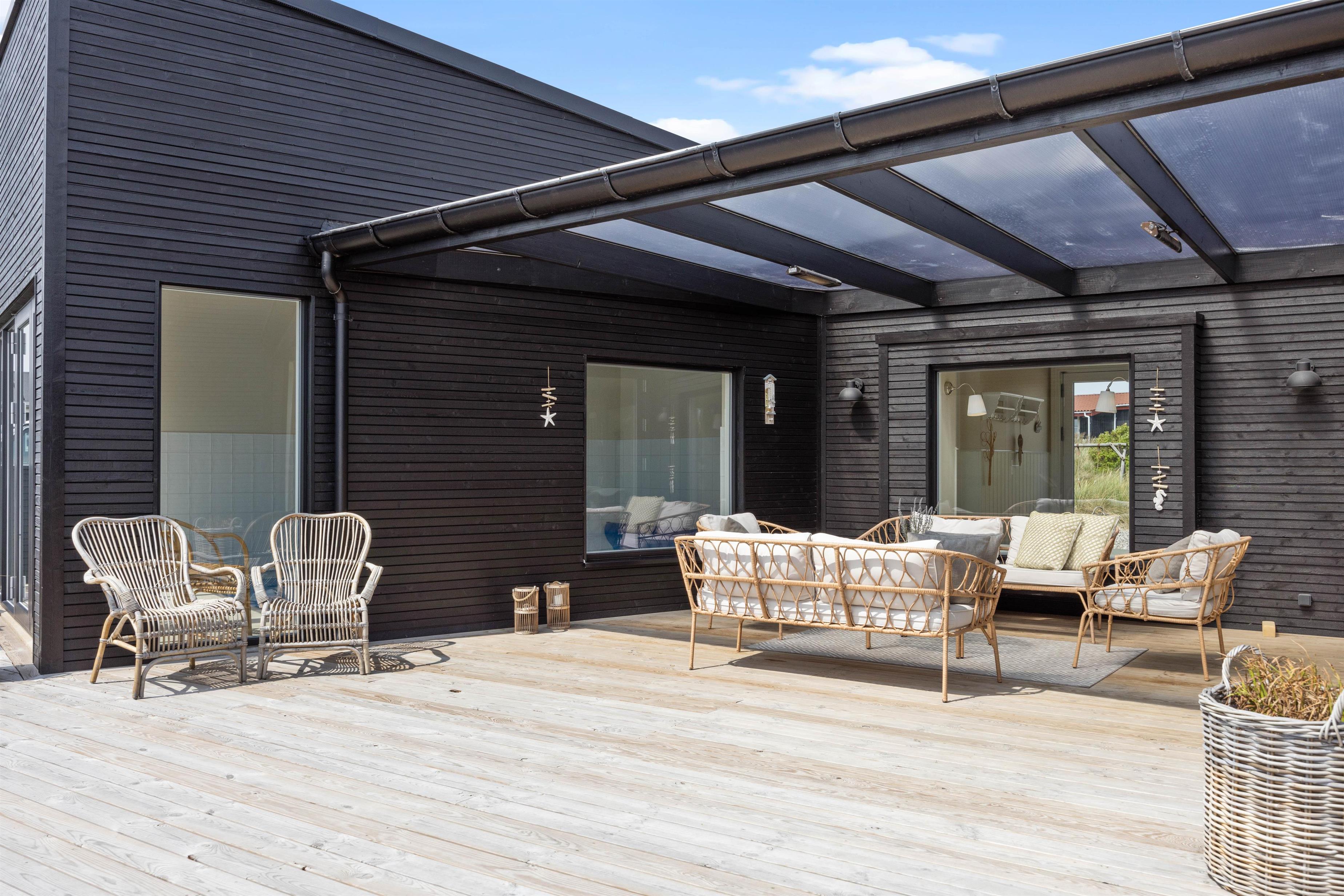 Sommerhus har en dejlig lukket og overdækket terrasse med behagelige havemøbler og parasol, hvor der er rig mulighed for afslapning i en liggestol. Eller hvad med et smut ind i udesaunaen efterfulgt af et lækkert brusebad i udebruseren? Udebruseren kan benyttes fra april til november.