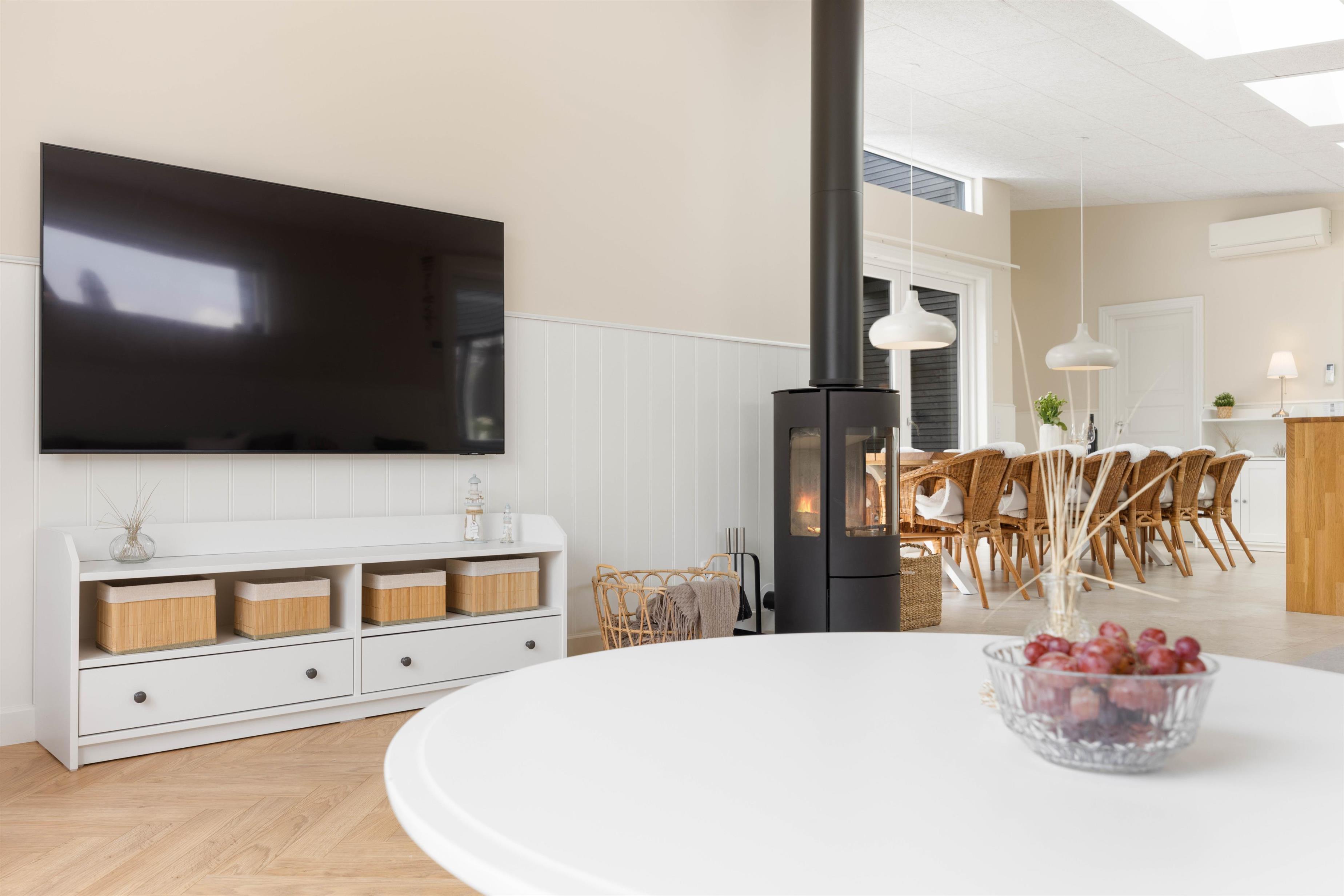 I den lyse opholdsafdeling kan I nyde hinandens selskab og spille lidt bordtennis - eller hvad med at arrangere en feriedyst for alle? Med den hyggelige brændeovn er der lagt op til rigtig feriehygge – tænd op i brændeovnen efter en dejlig vandretur i den skønne natur eller smid jer i sofaen med en god krimi og et glas vin, mens børnene bader i swimmingpoolen. Endvidere byder sommerhuset på en energibesparende varmepumpe.