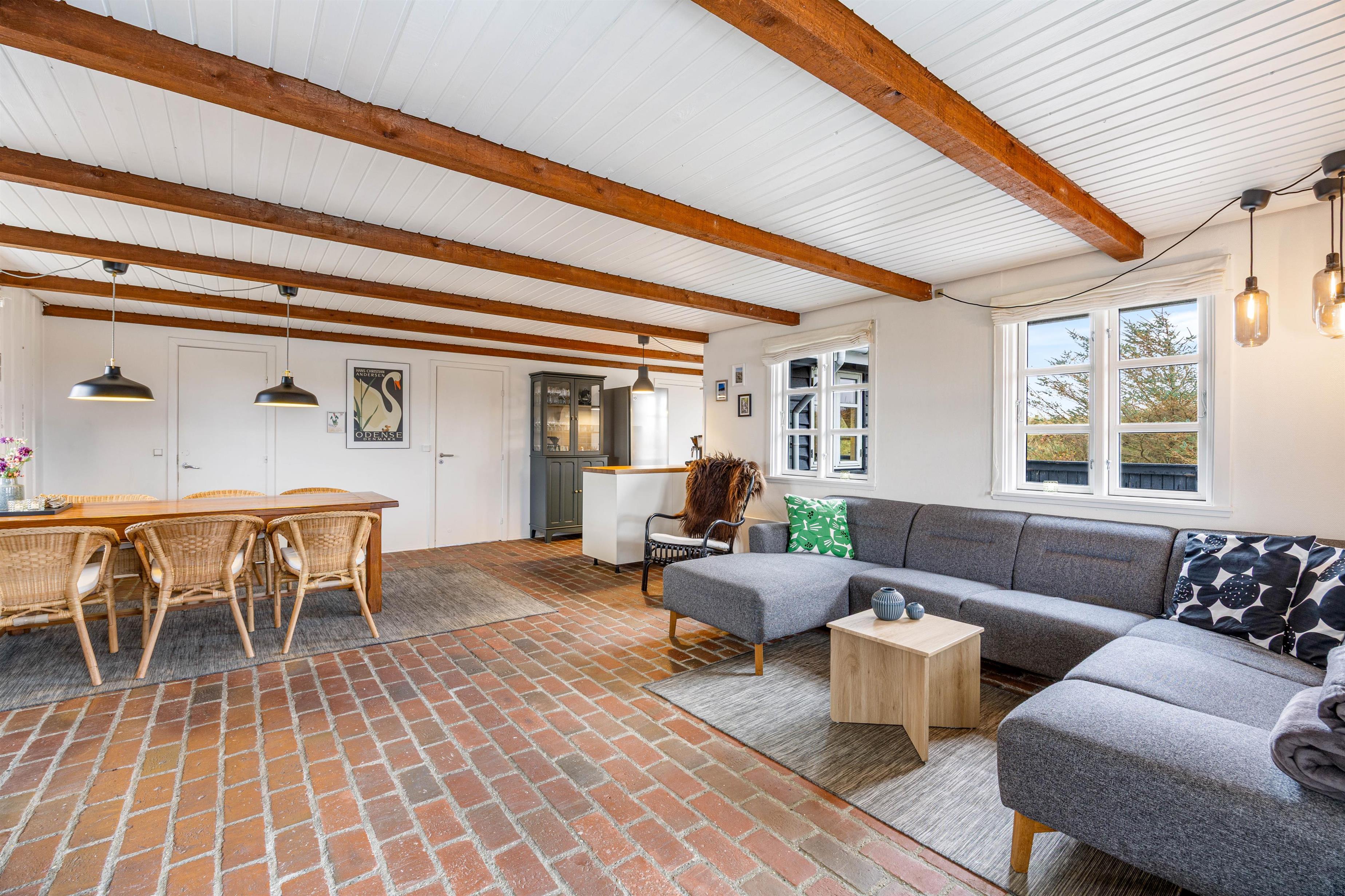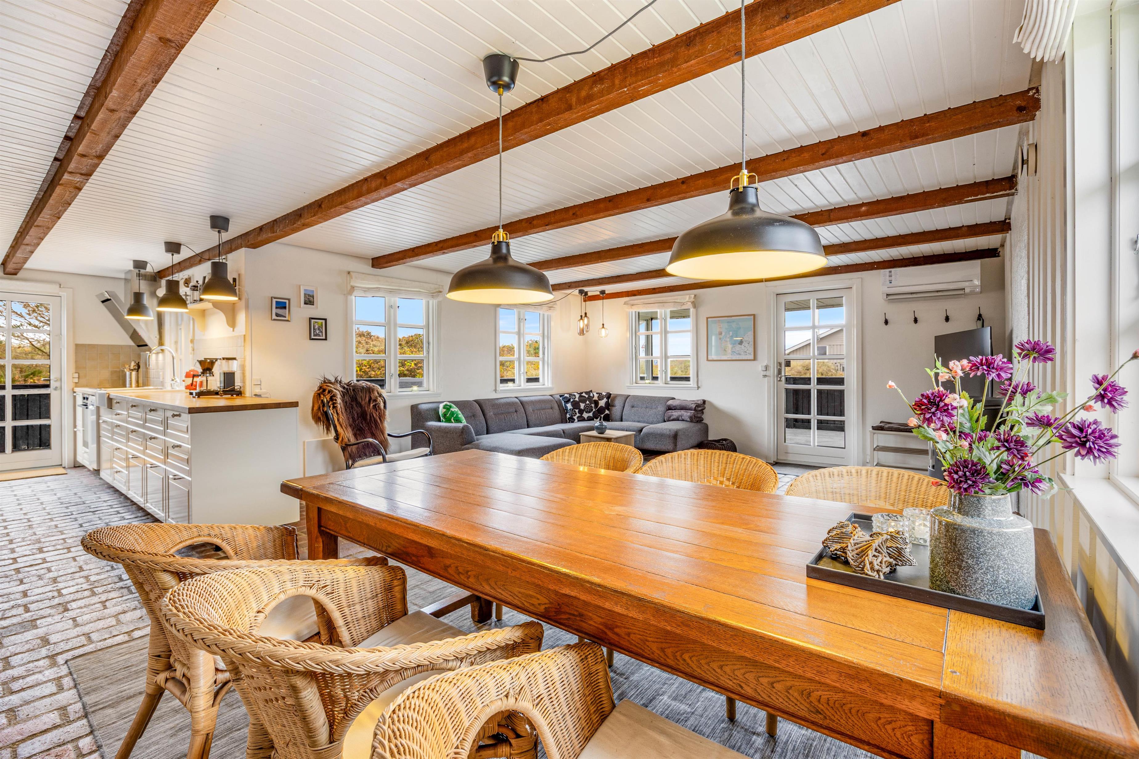 Feriehuset fremstår overalt lyst og hyggeligt i en charmerende landlig stil, overalt med flotte sten- eller trægulve. Her er indretningen foretaget med kærlighed og bærer præg af den klassiske sommerhusstil. De mørke loftsbjælker tilfører ekstra charme, og de mange små pyntedetaljer gør indretningen personlig og hyggelig.