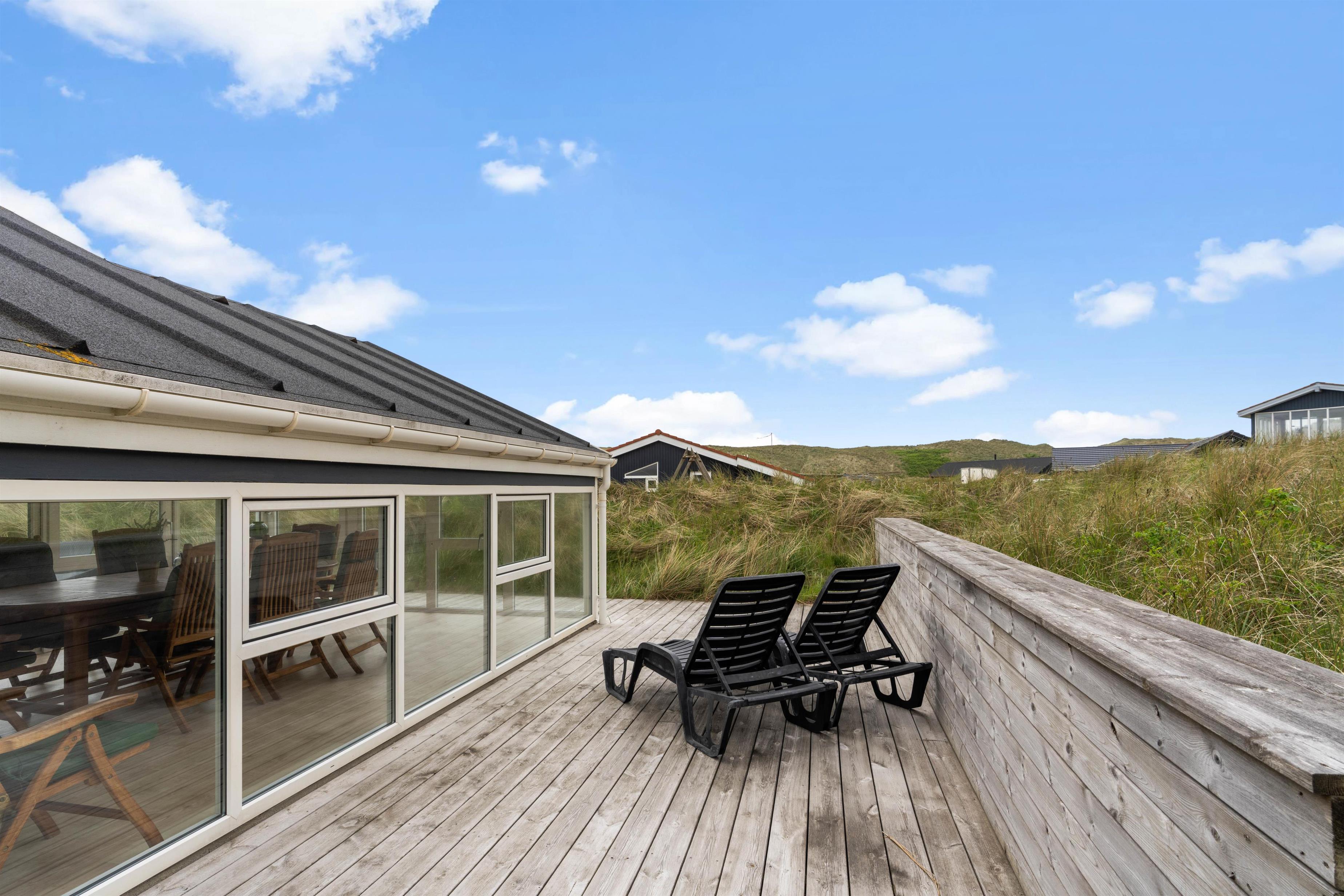 Den rummelige terrasse går hele vejen rundt om feriehuset. En del af terrassen er overdækket og hele terrassen er afskærmet. Her kan du virkelig få fuldt udbytte at den friske luft, for ligemeget hvilket hjørne det blæser fra, kan du altid finde et sted, hvor du kan slappe af på liggestolen eller nyde en dejlig middag fra grillen. Til de små er der sandkasse i forbindelse med terrassen.
