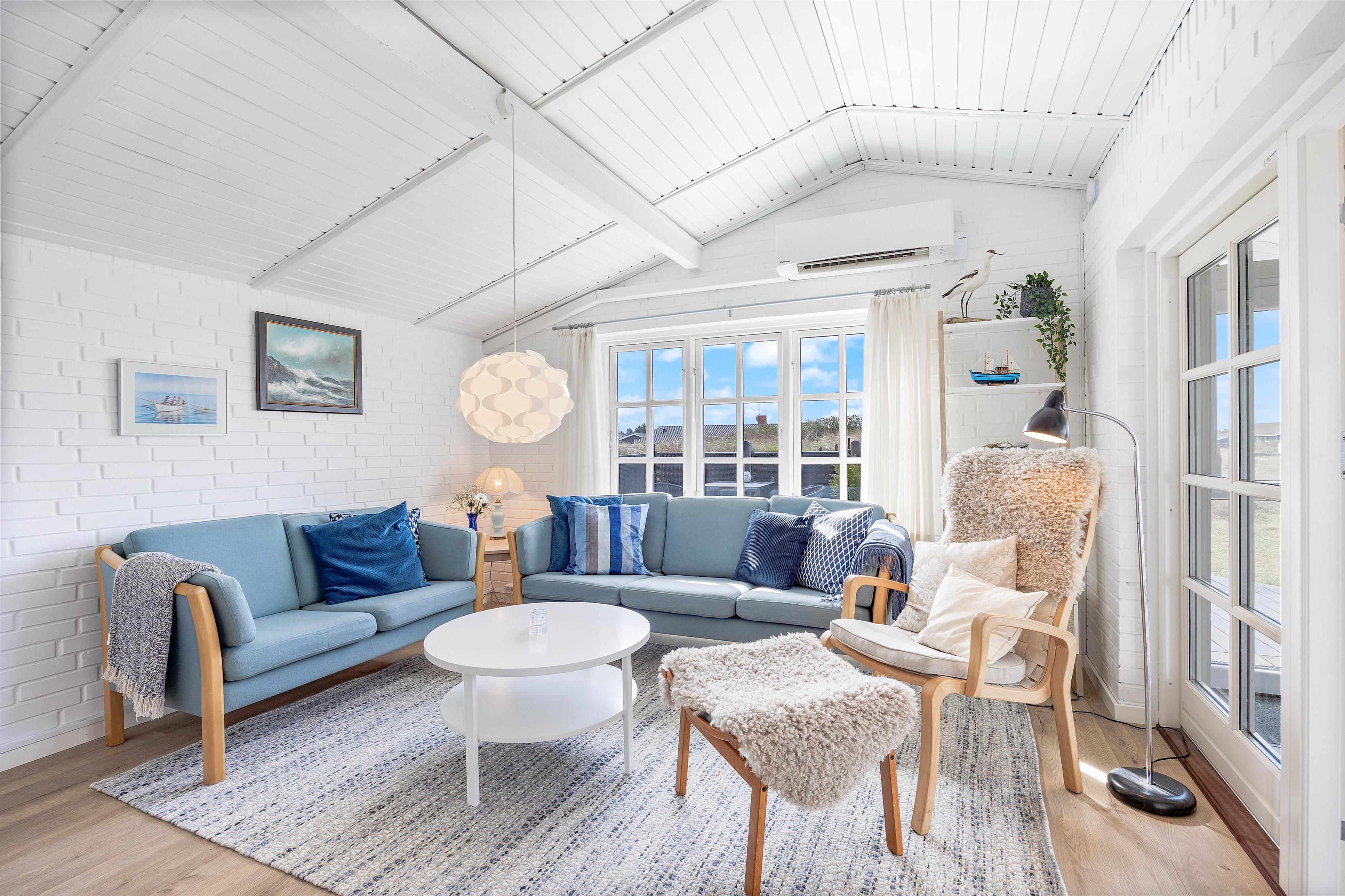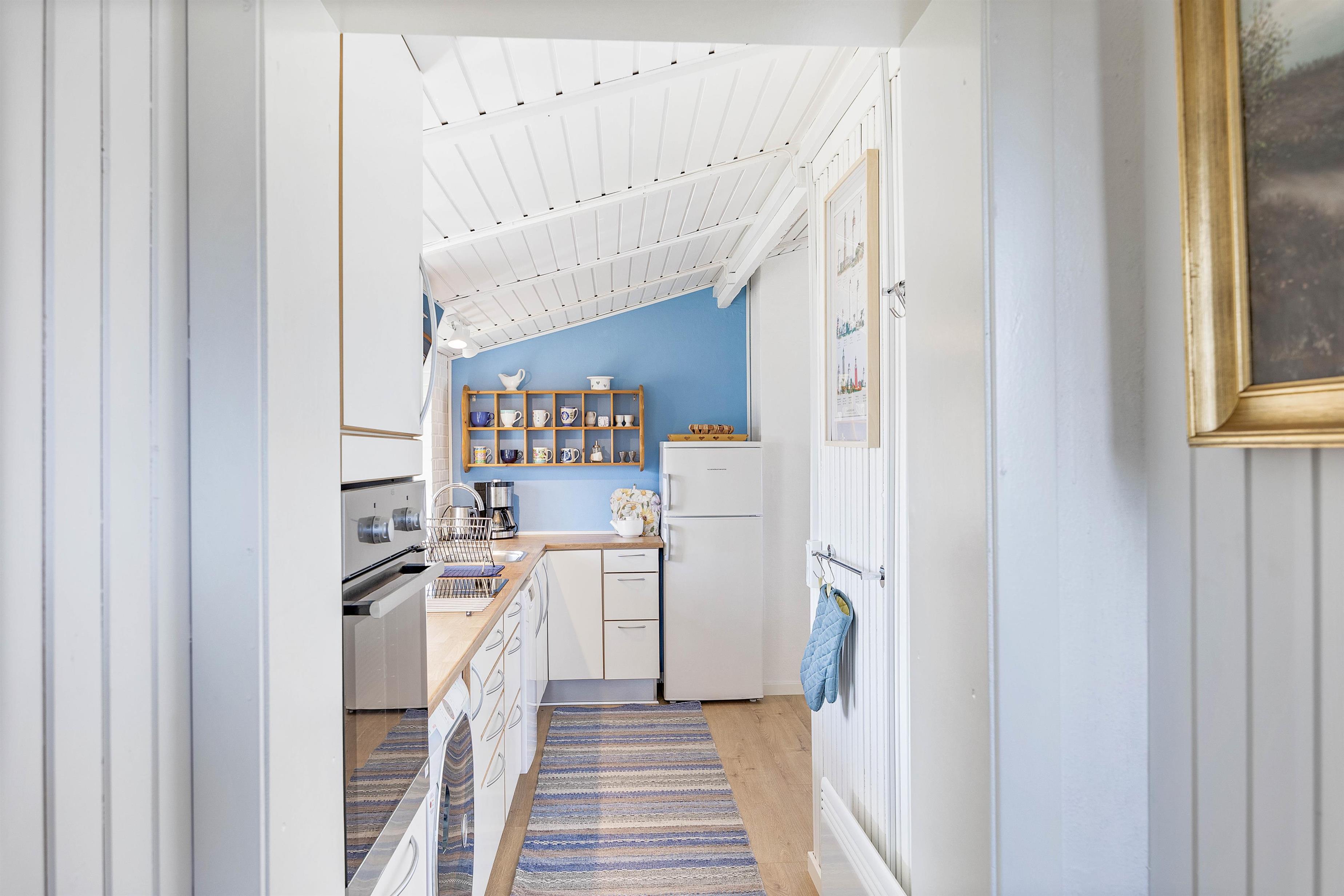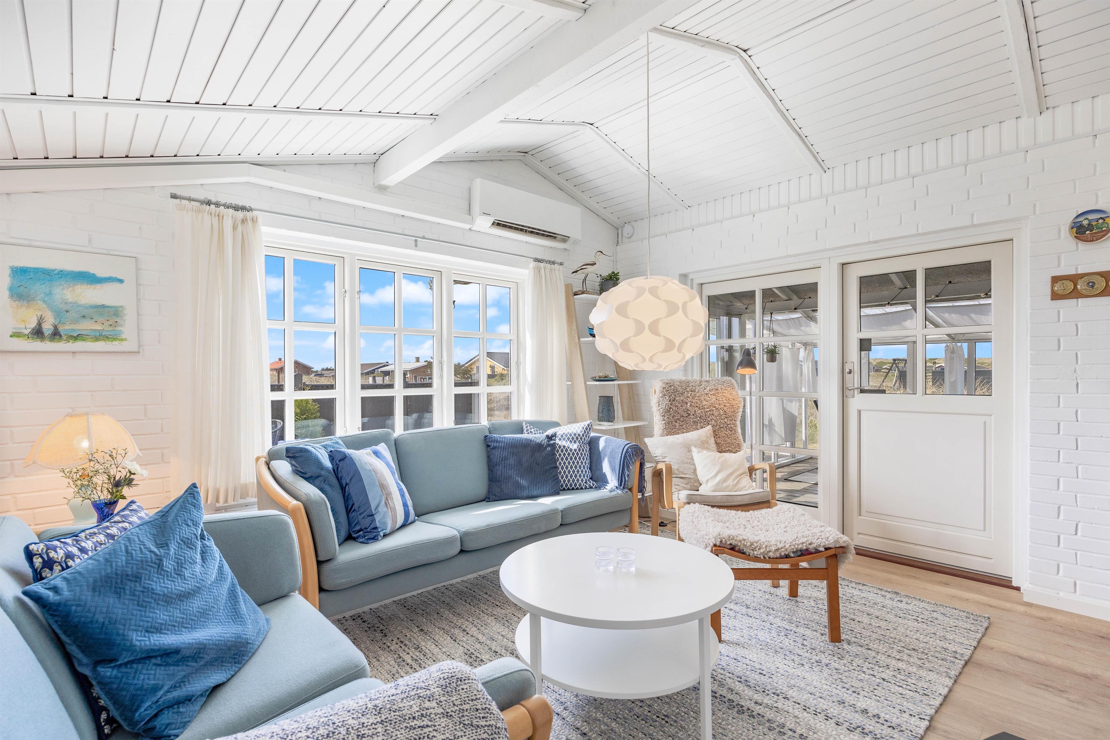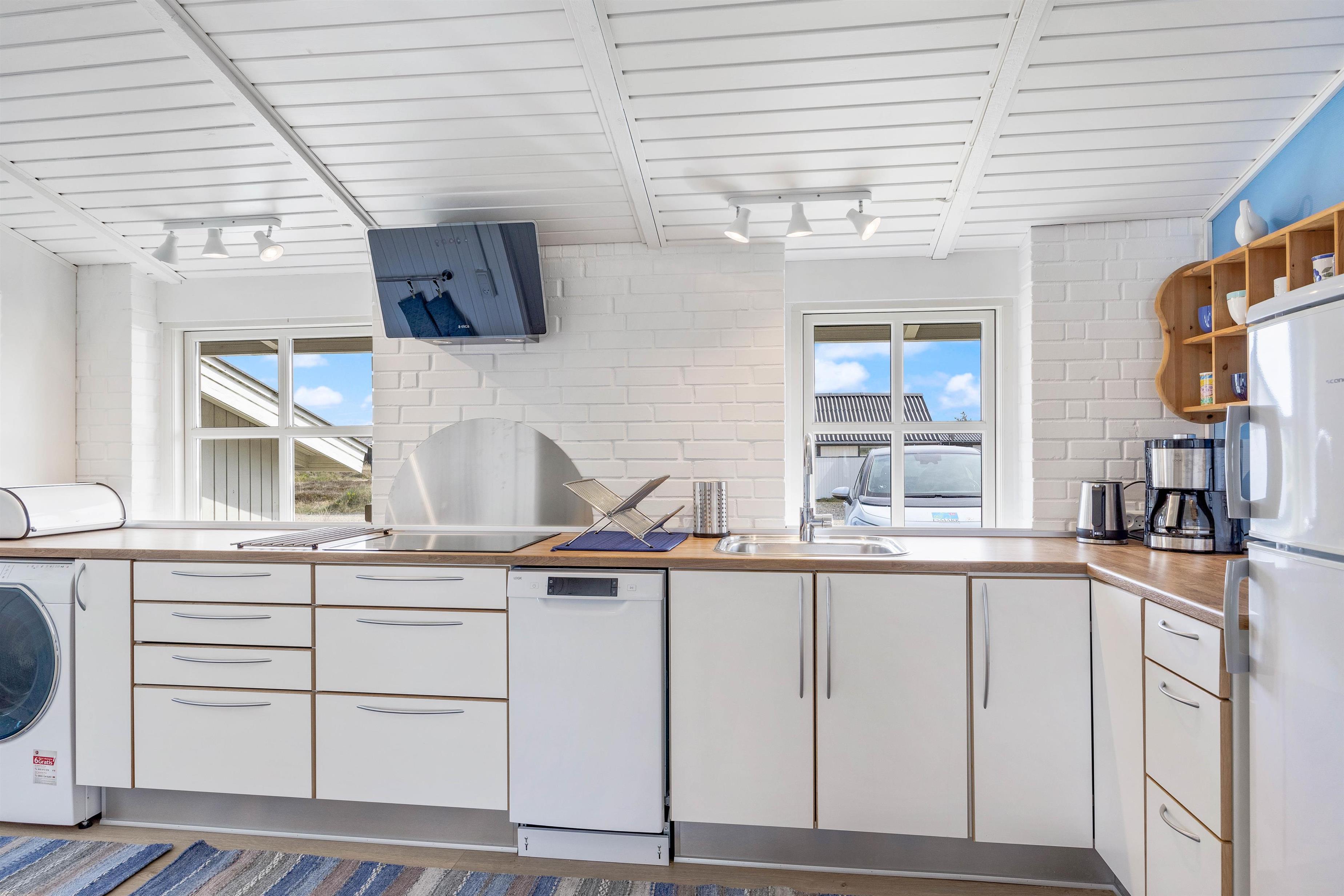 I den lyse opholdsstue kan I slappe af sammen foran brændeovnen eller se en film. Det brede vinduesparti giver et fint lysindfald, hvilket skaber en behagelig atmosfære. I det veludstyrede køkken kan du lave mad af hjertens lyst. Spisebordet giver plads til en hyggelig aften med lækker mad og eventuelt et brætspil. Udover brændeovnen hjælper den energibesparende varmepumpe også til med opvarmning.