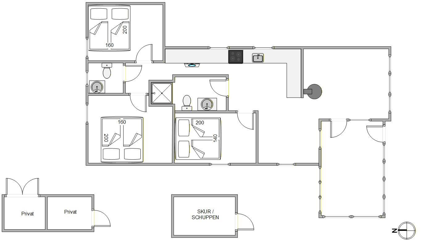 Der er badeværelse med bruseniche samt vaskemaskine og tørretumbler i sommerhuset. Til de små børn er der tremmeseng og høj stol til rådighed. I de tre hyggelige soveværelser med komfortable dobbeltsenge kan du slippe hverdagens stress, og starte nogle afslappede feriedage.