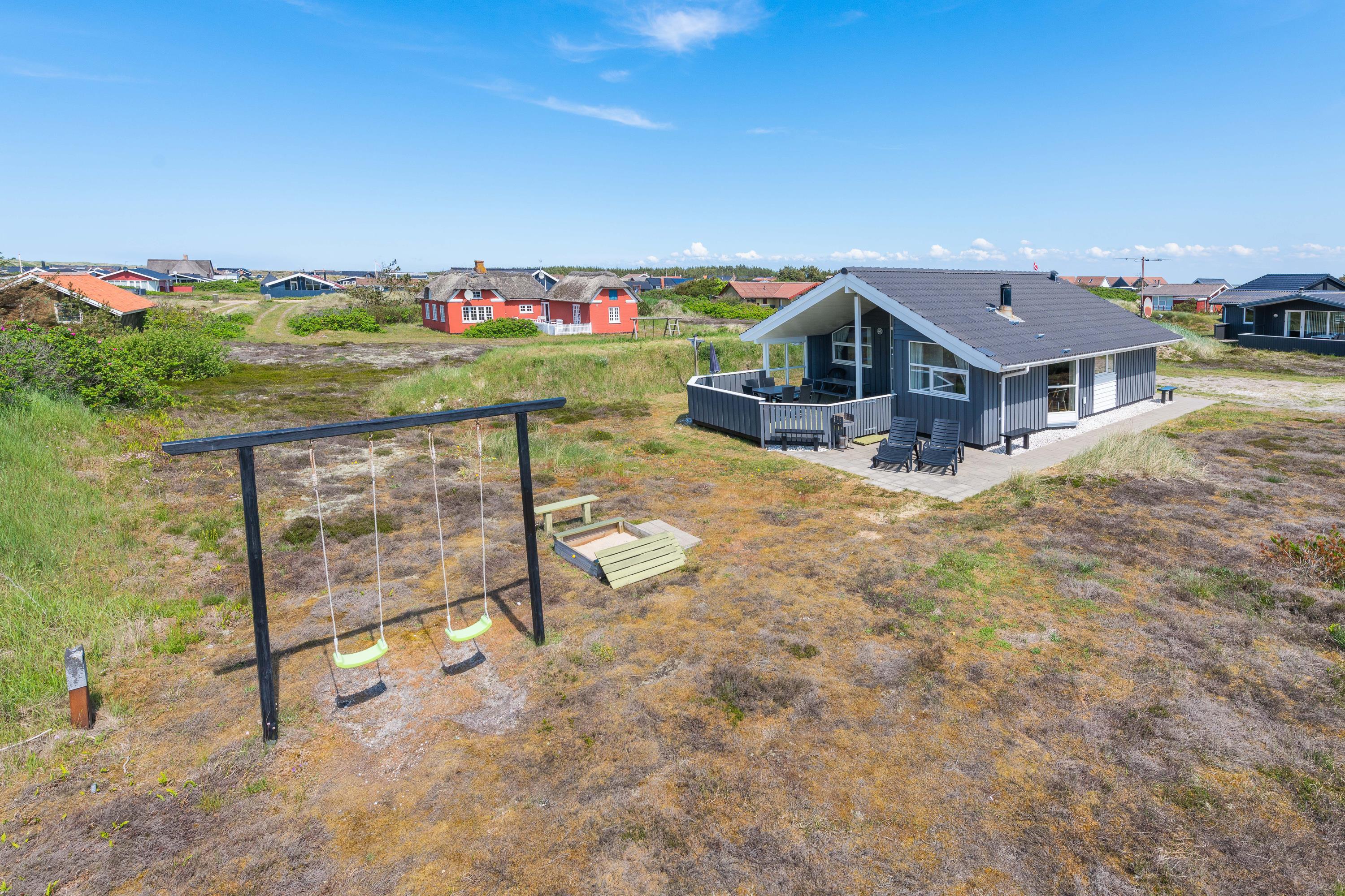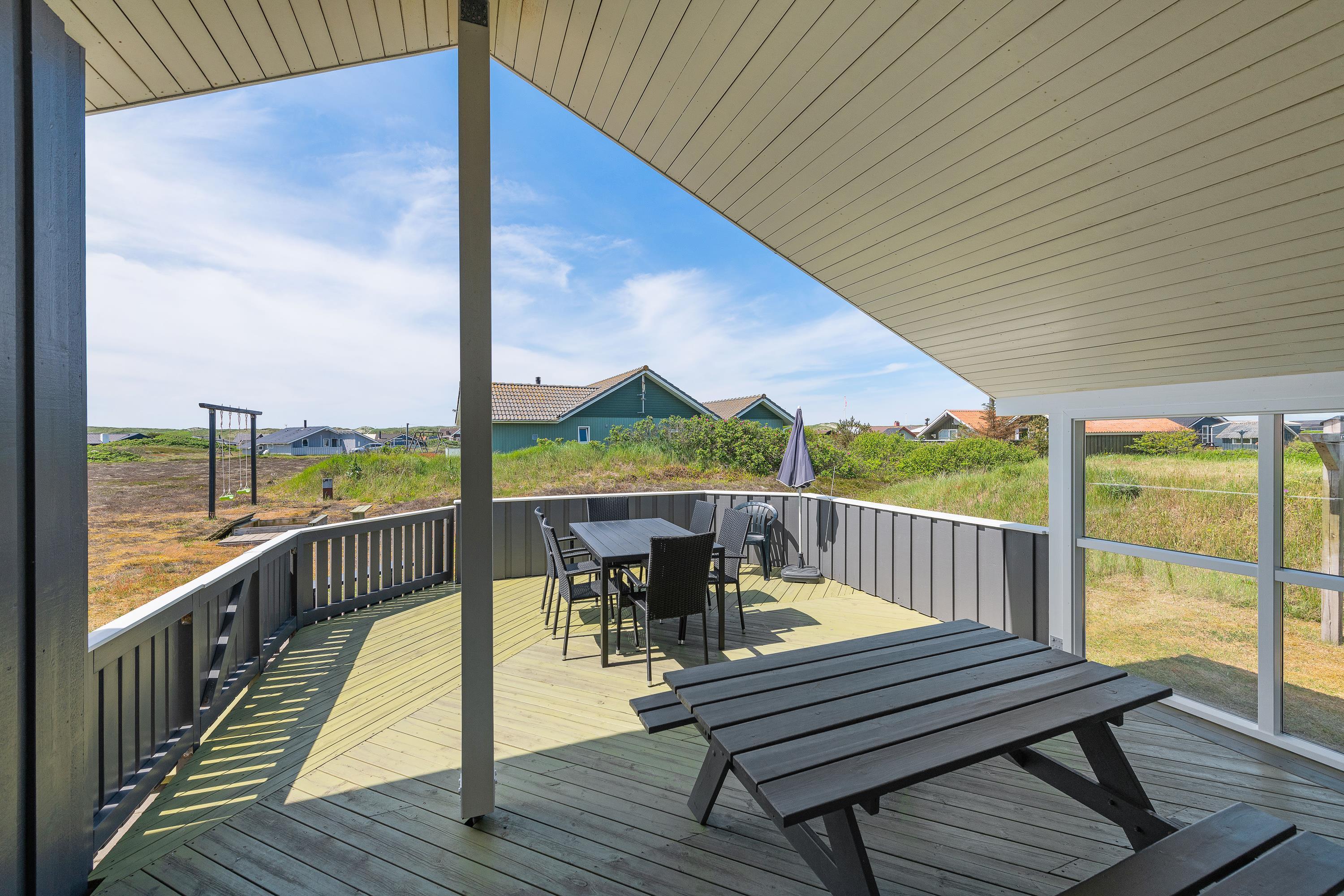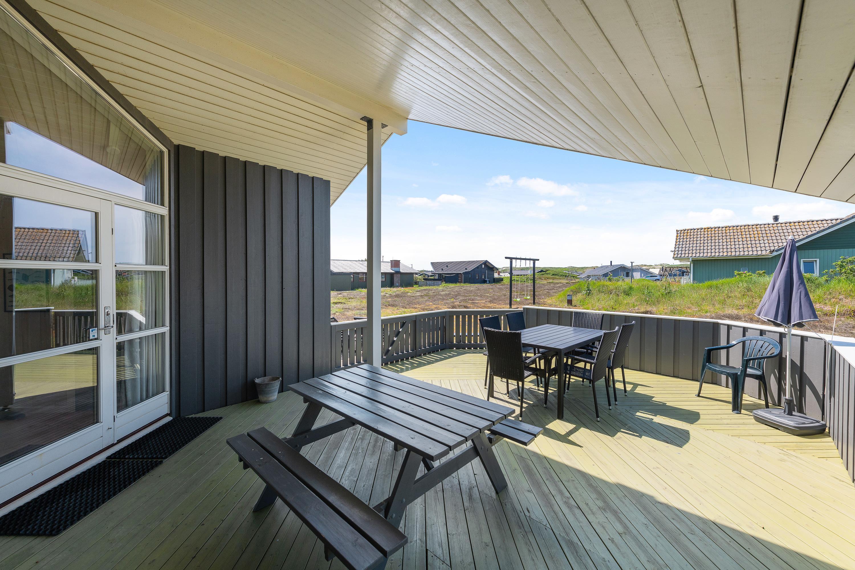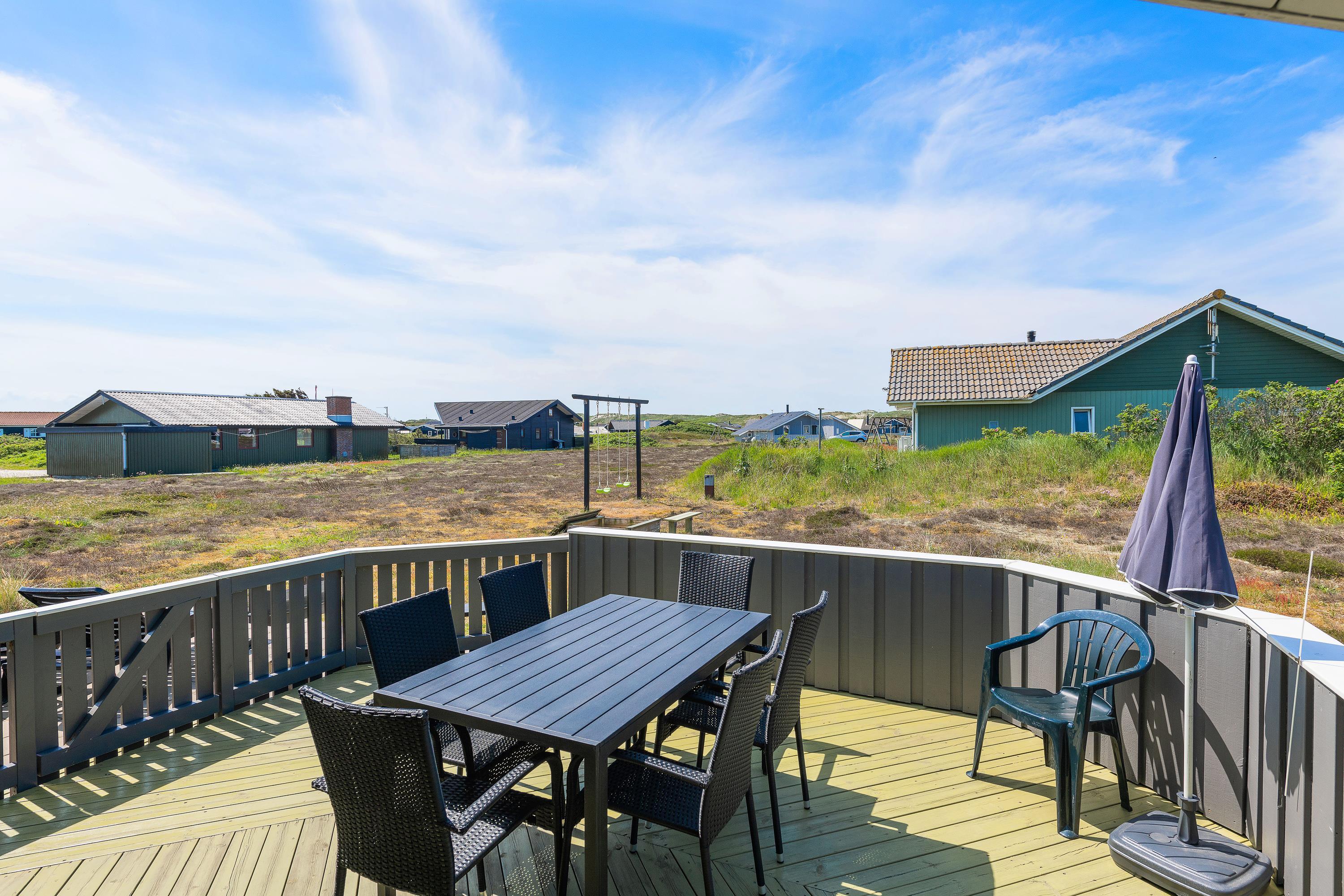 På en lun morgen kan kaffen nydes på den afskærmede terrasse mod øst og op på dagen kan livet leves på den dejlige afskærmede og delvist overdækkede terrasse mod vest. Mod vest er terrassen også helt lukket. Terrassen er udstyret med havemøbler, liggestole og grill. Der er også tænkt på de mindste med gynger og sandkasse.