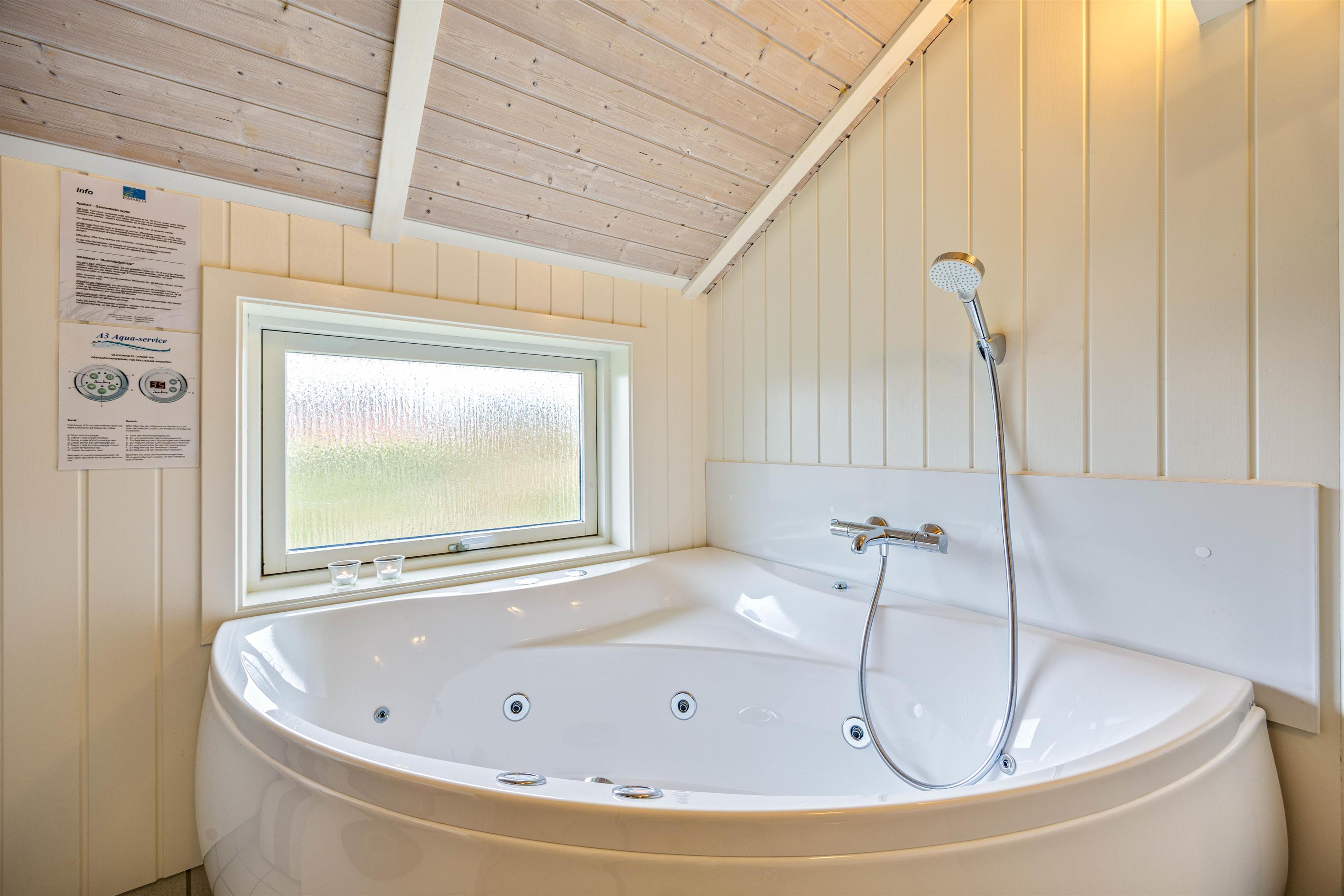 Der er gjort meget for, at I skal føle jer godt tilpas i sommerhuset, og på det store badeværelse med gulvvarme gemmer der sig en ekstra overraskelse; nemlig saunaen og spaen, hvor I kan komme helt ned i gear og langt væk fra hverdagen. Badeværelset er renoveret i 2025 med nye fliser og badeværelsesmøbler.