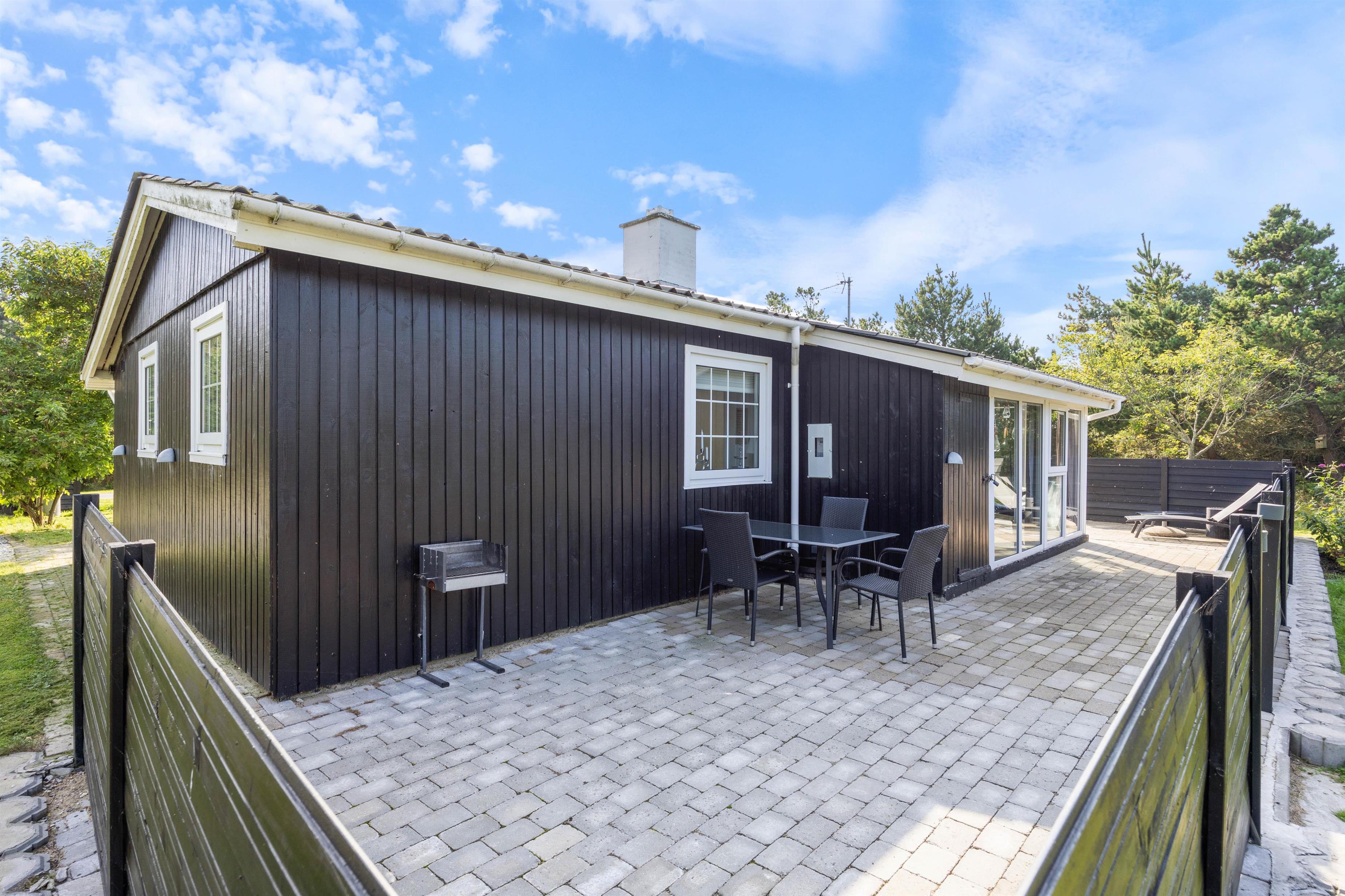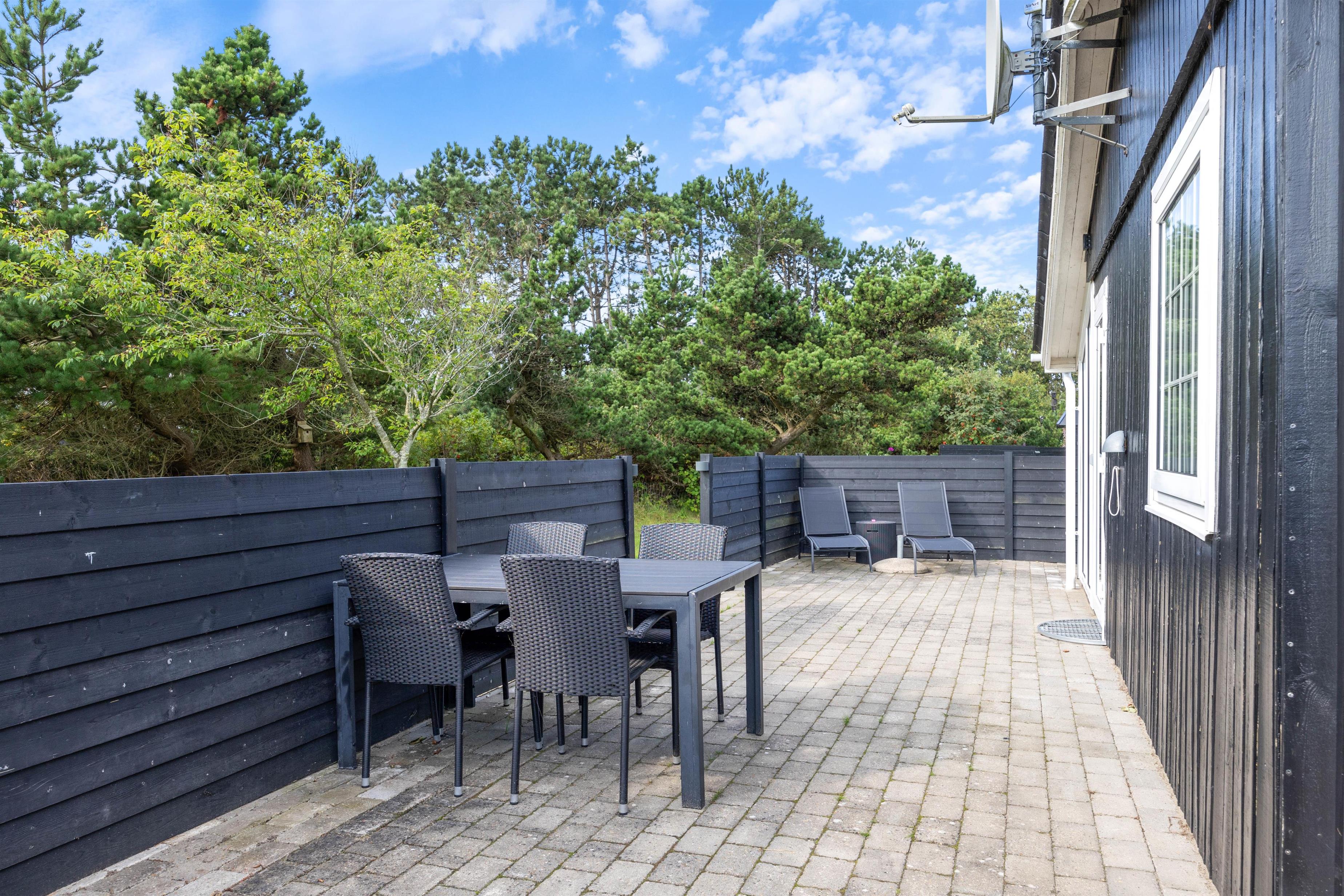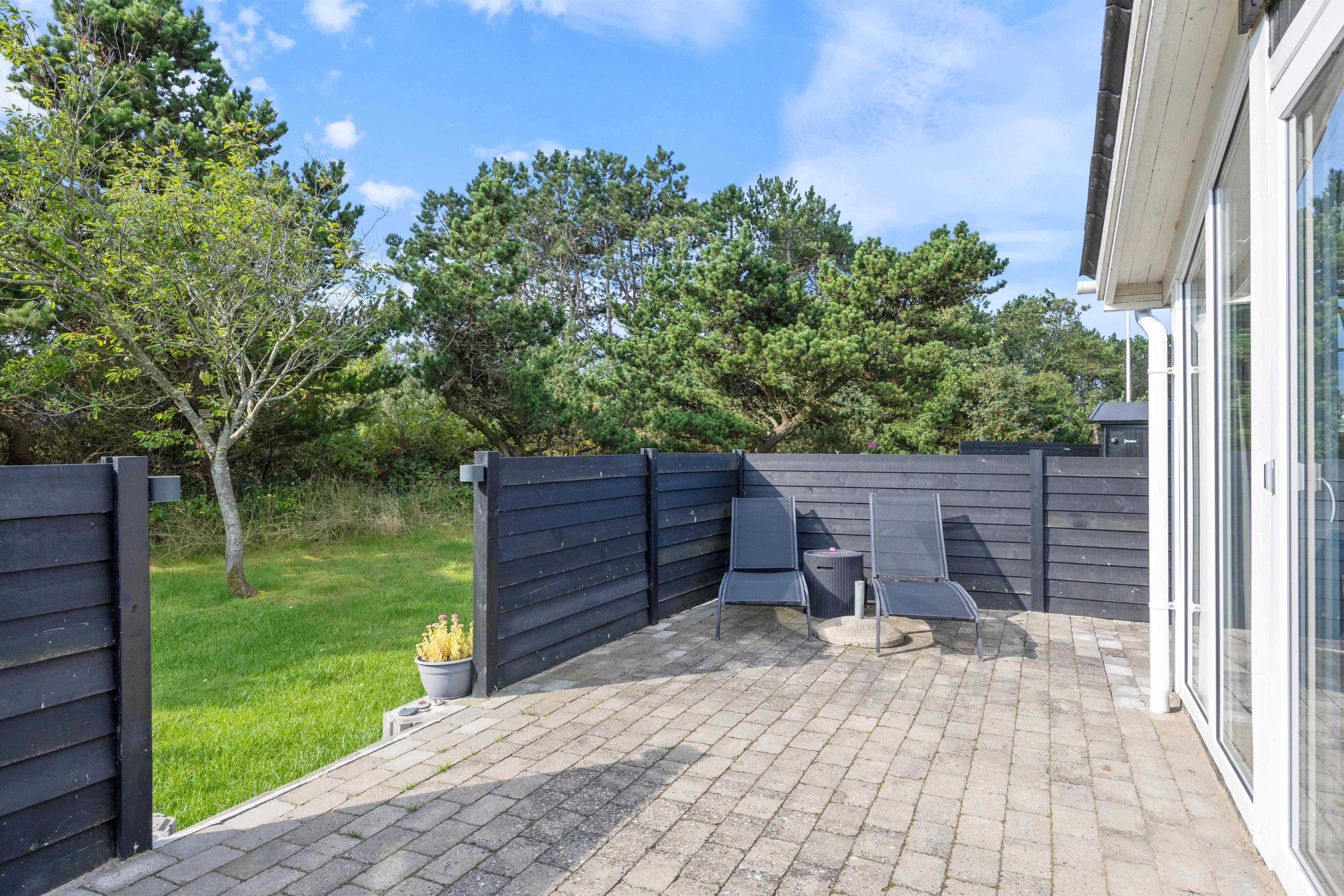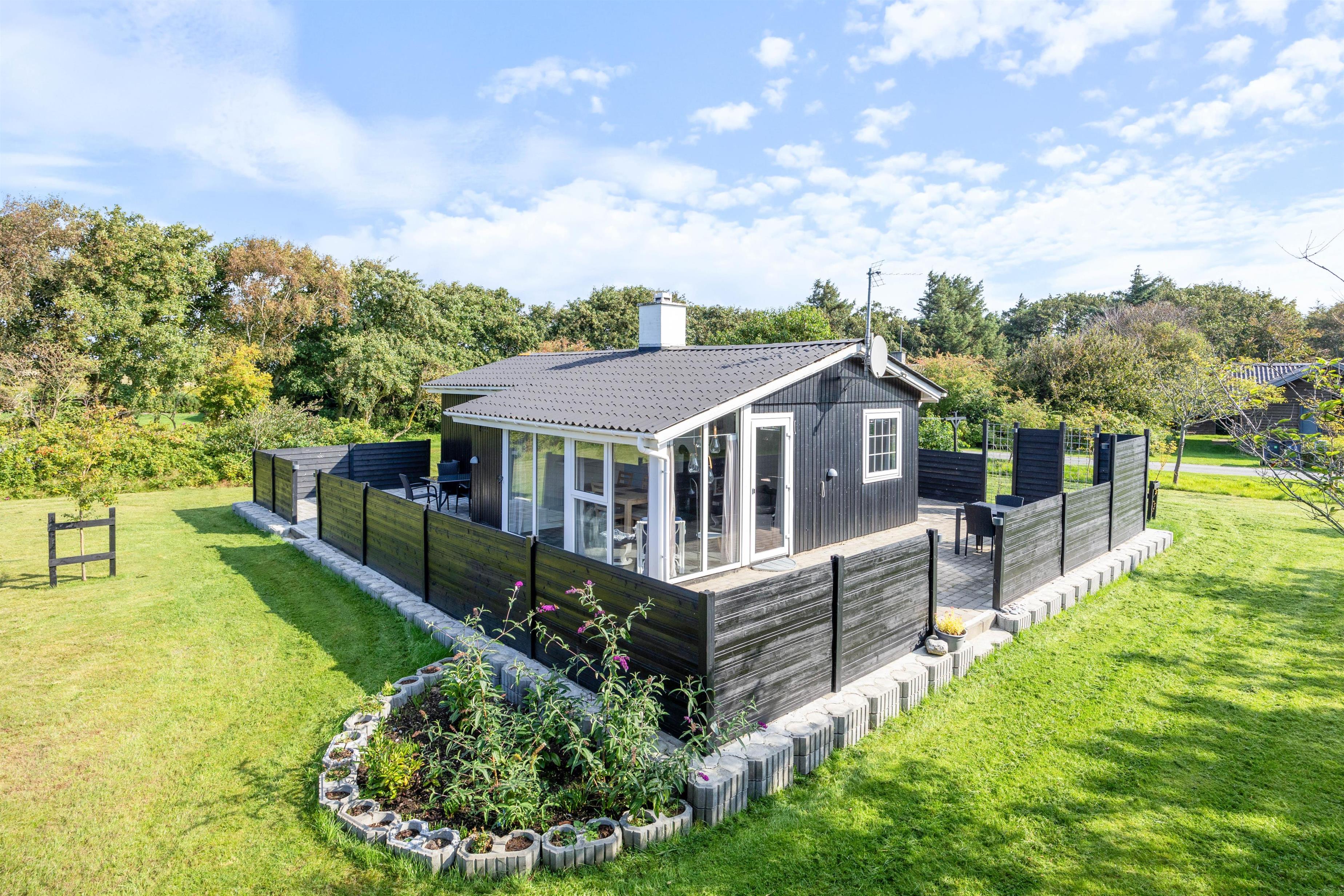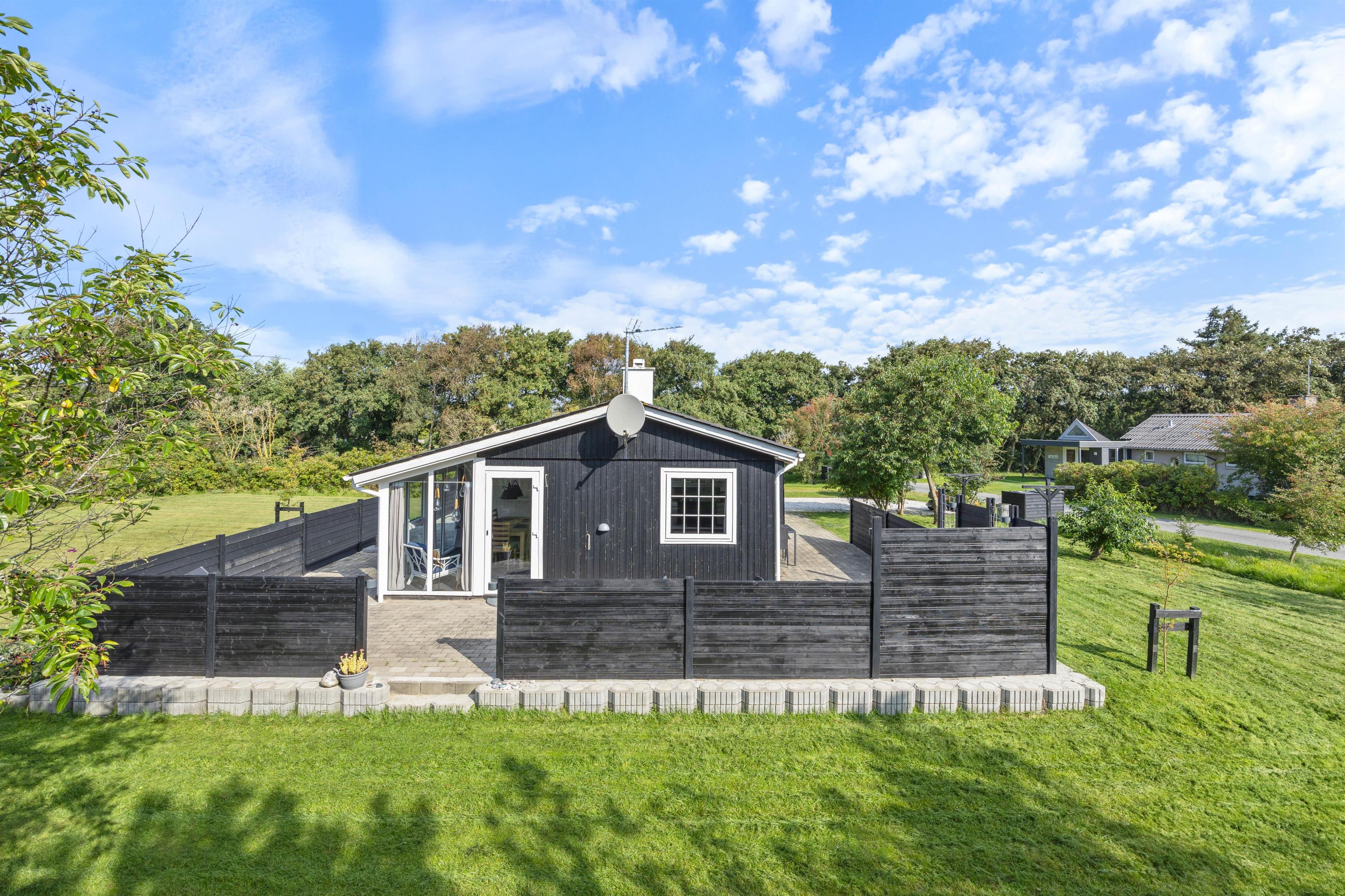 Sommerhuset ligger på en 1611 m² stor plænegrund, hvor der er god plads til sjov og leg for både børn og hunde. Måske du vil udfordre resten af ferieflokken til et sjovt spil vikingespil? Når I har brugt en masse energi på aktiviteter, kan I slappe af og solbade i havemøblerne eller på liggestolene.
