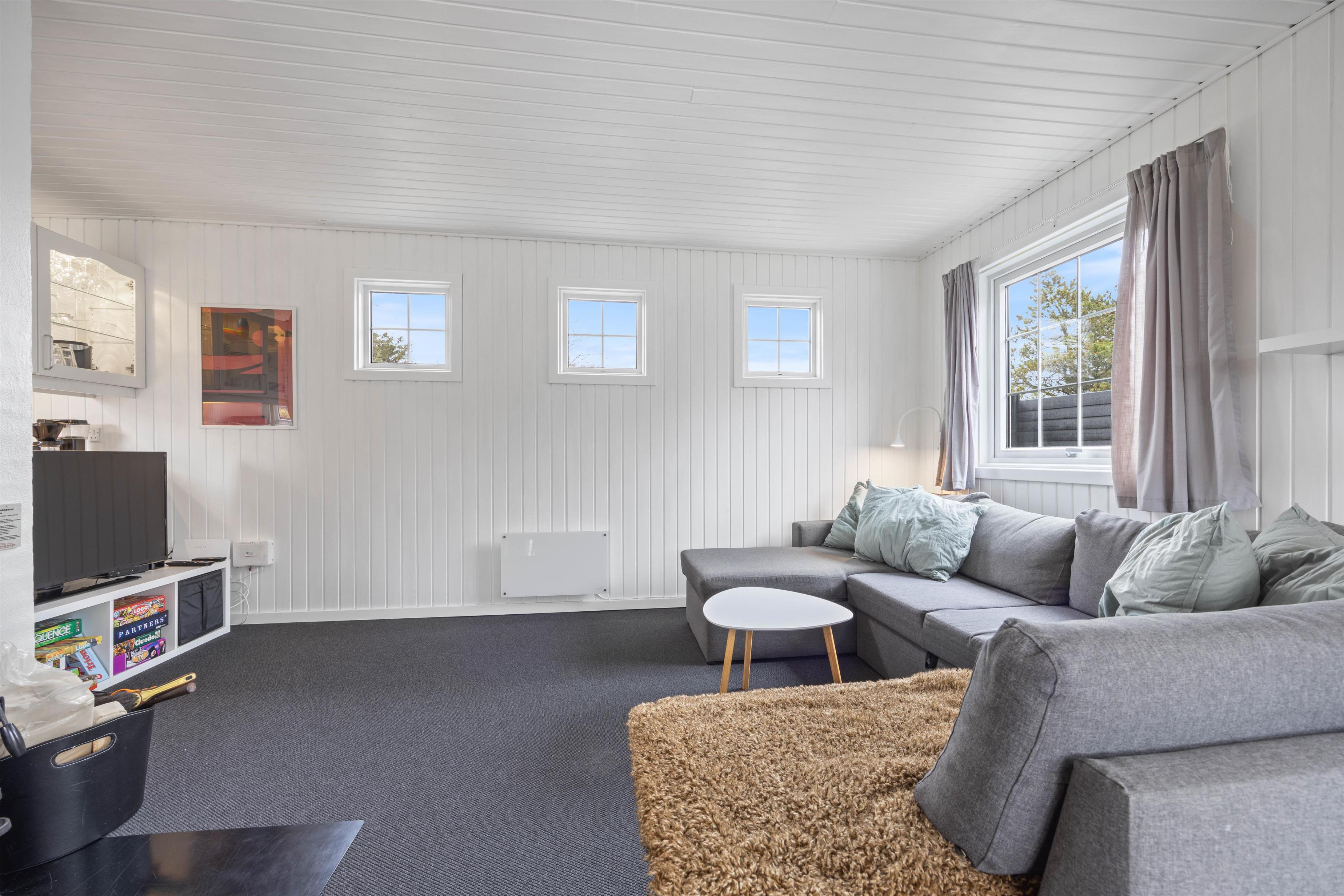 Hjerterummet i sommerhuset er stuen, der ligger i forlængelse af spiseplads og det tilstødende køkken. I stuen kan I slappe af sammen foran brændeovnen, mens de gode feriemåltider kan tilberedes i det veludstyrede køkken. Efter at have nydt en god middag ved spisebordet kan I finde brætspillet frem og hygge jer, mens opvaskemaskinen klarer opvasken for jer.