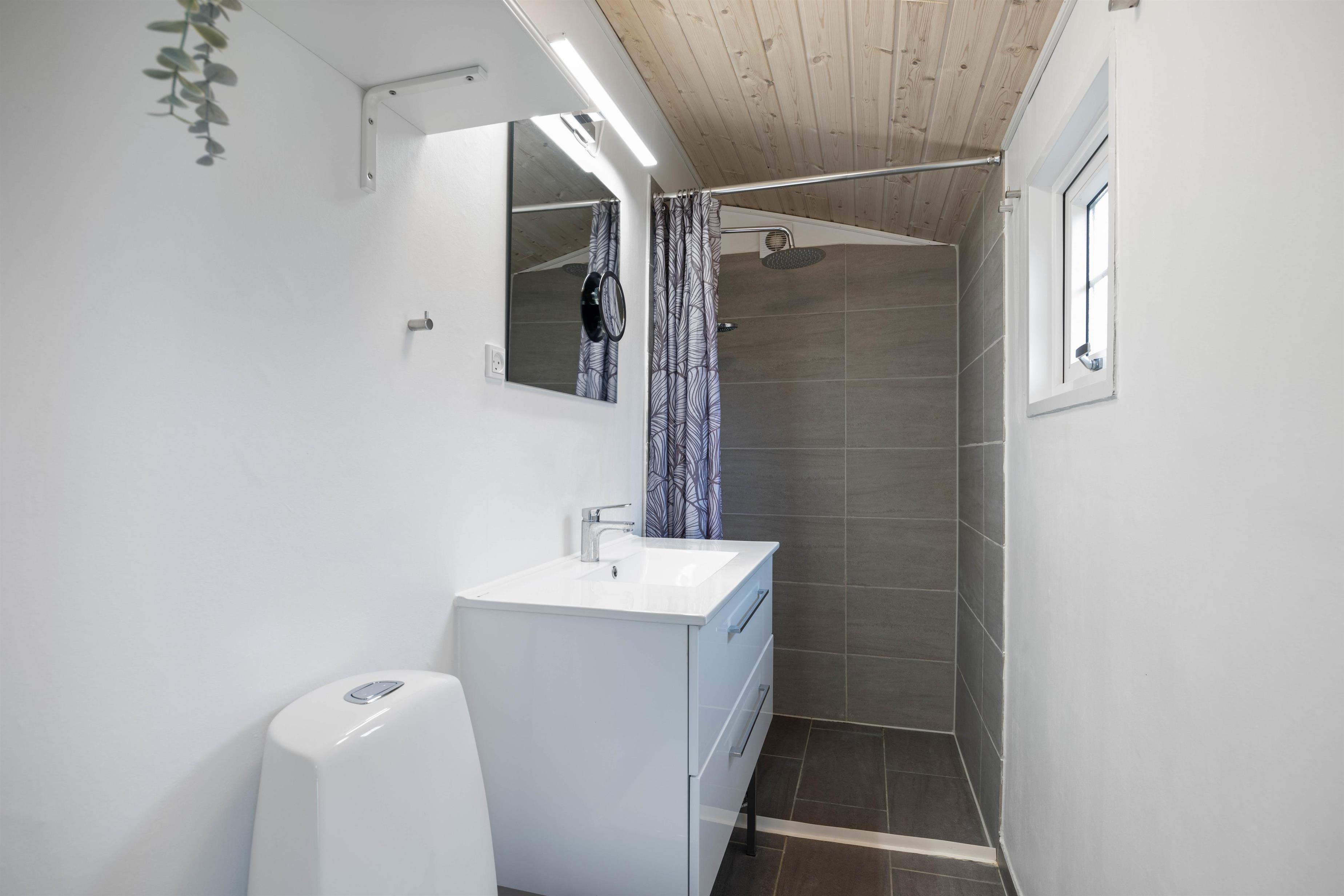 Sommerhusets badeværelse er indbydende og moderne indrettet, og der er desuden gulvvarme, så I ikke kommer til at fryse tæerne. Som et ekstra plus er der både vaskemaskine og tørretumbler i sommerhuset, og I kan derfor vaske lidt tøj eller håndklæder undervejs, hvis det skulle være nødvendigt.