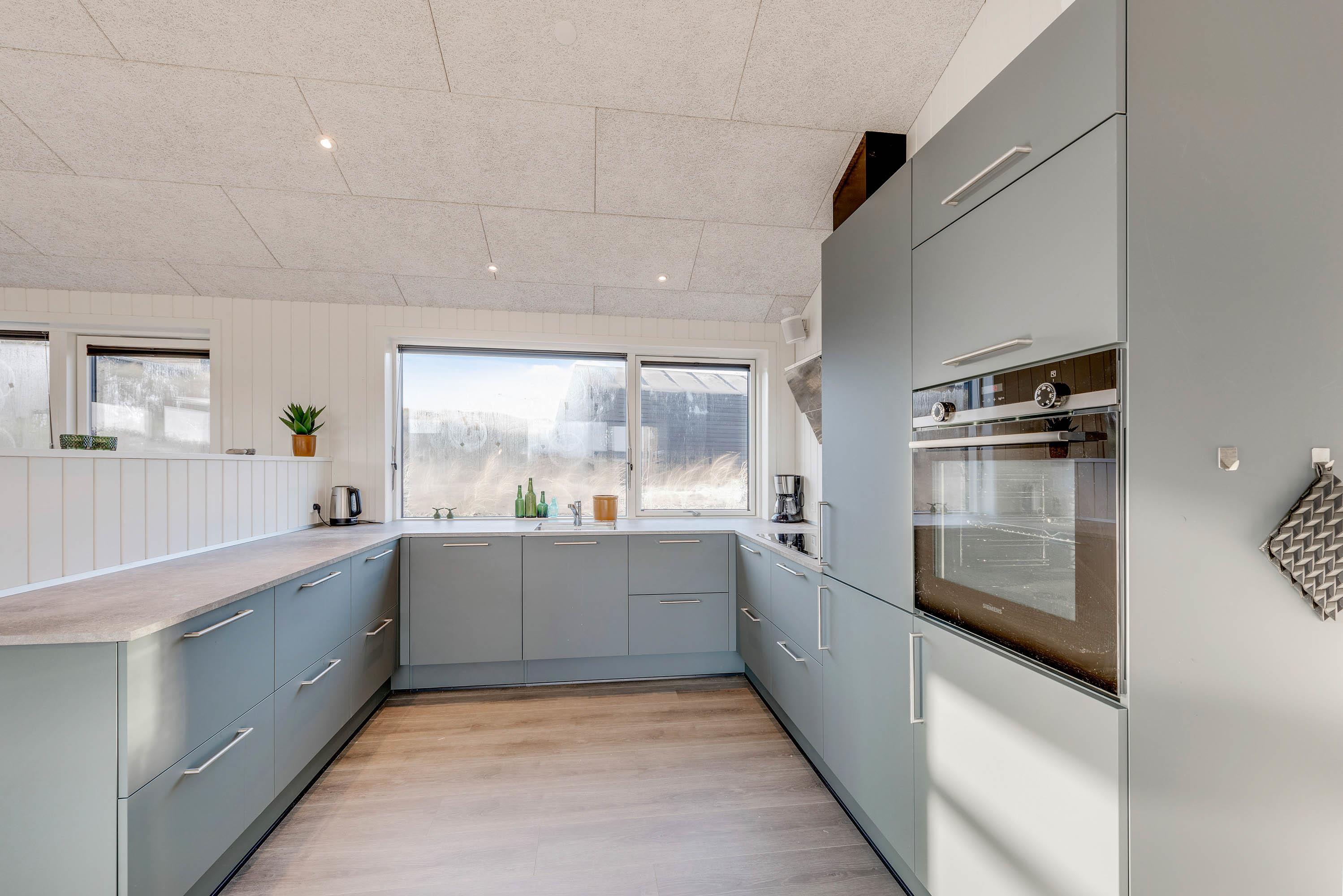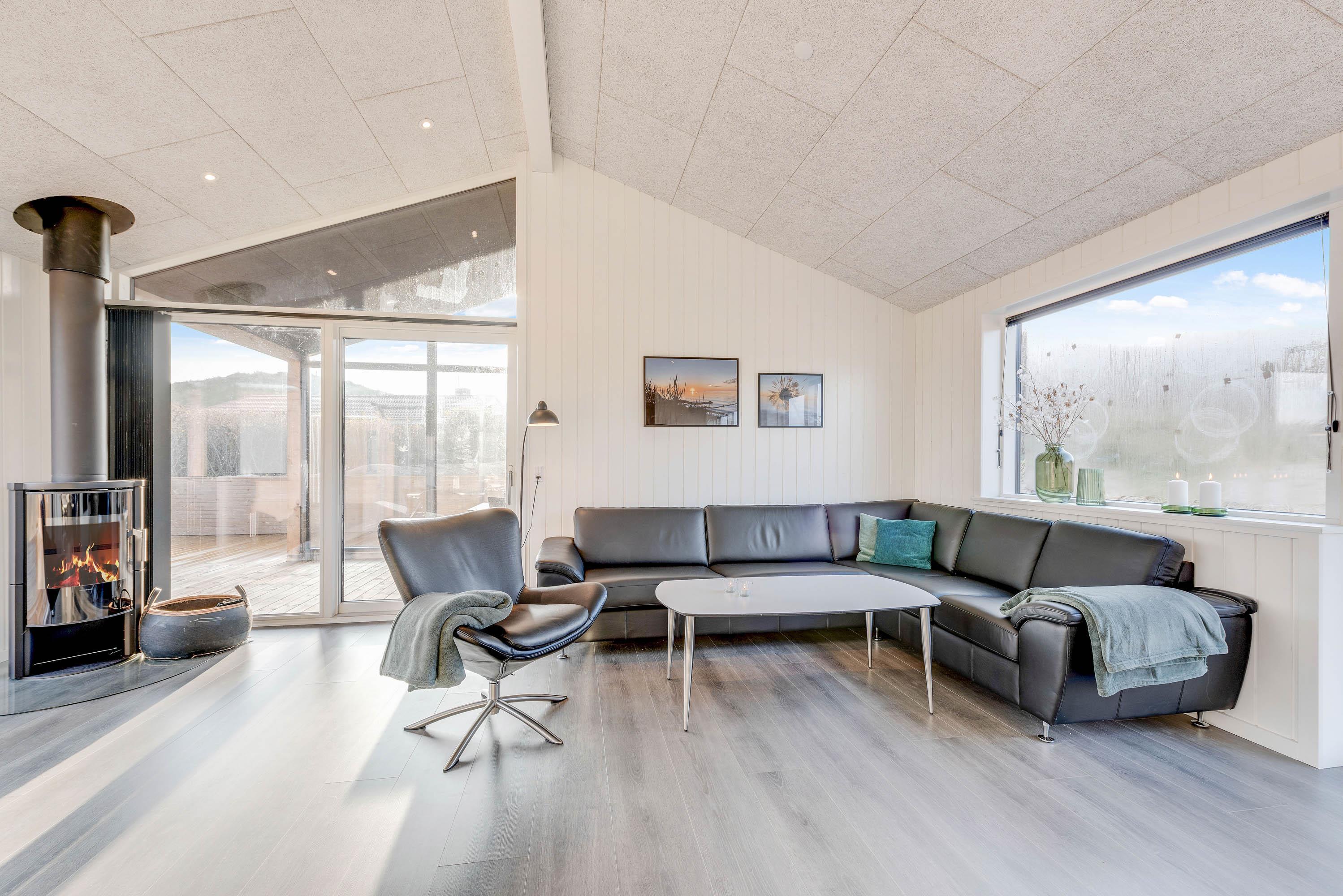 Det store opholdsrum vil danne rammerne om mange skønne feriestunder, hvor I sammen kan nyde ferien og det gode selskab. Her er store vinduespartier, som inviterer Bjerregårds smukke klitlandskab indenfor.