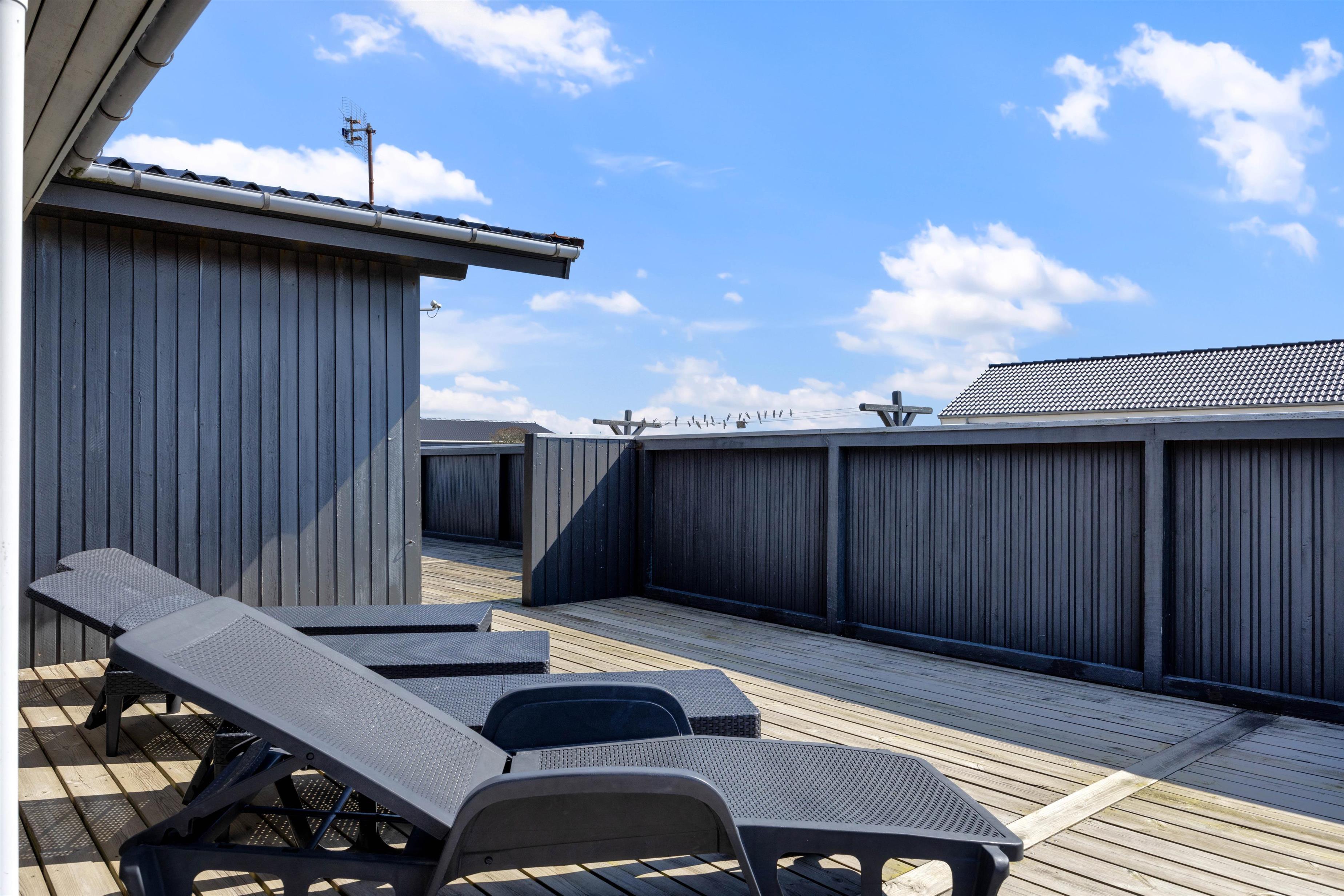 Udendørs kan I nyde den afskærmede og helt lukkede terrasse året rundt. Her kan I altid finde en rolig plet til en god bog og en kop te, eller I kan nyde solen på komfortable liggestole. Til børnene er der sandkasse og gynger.