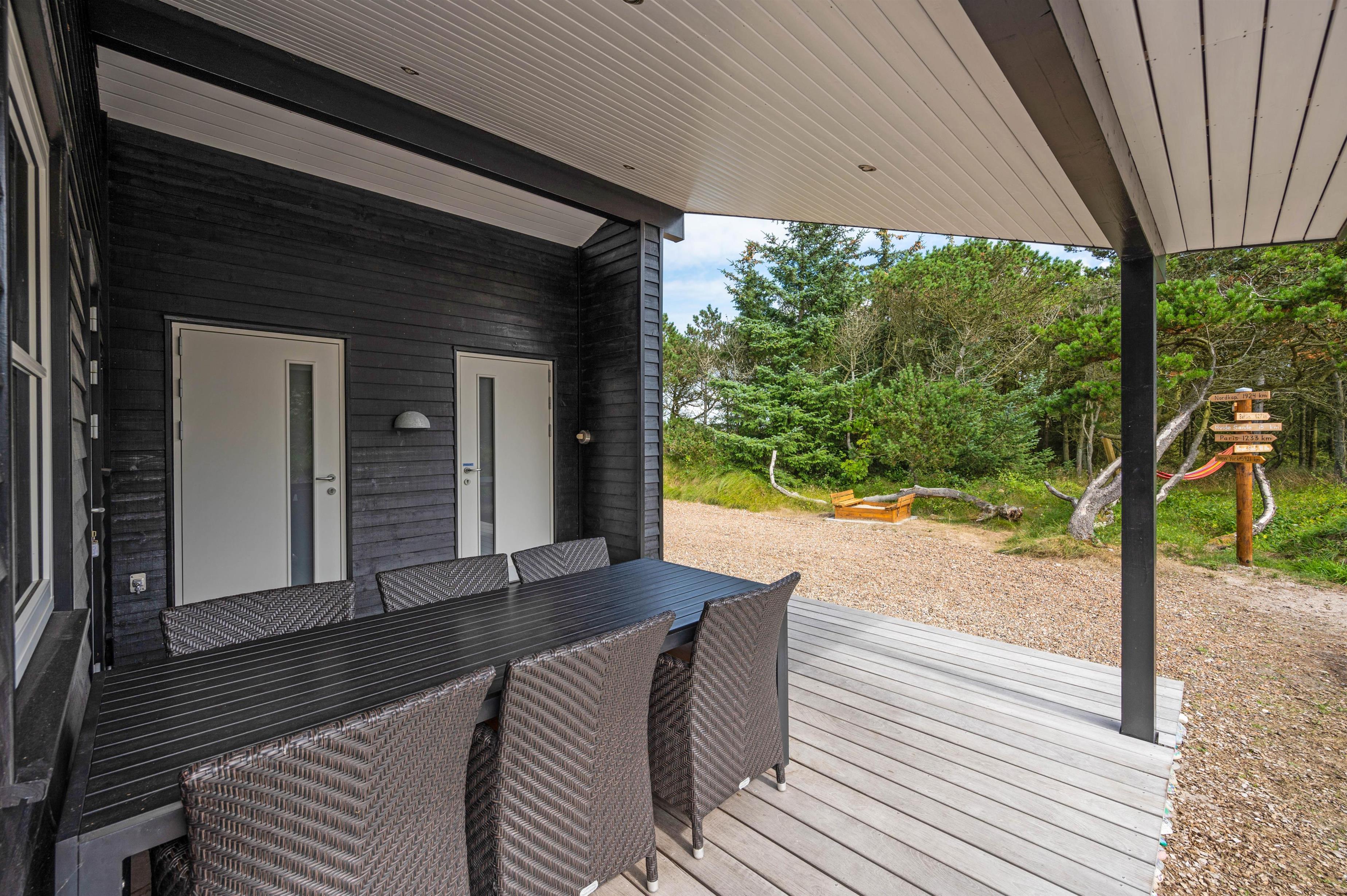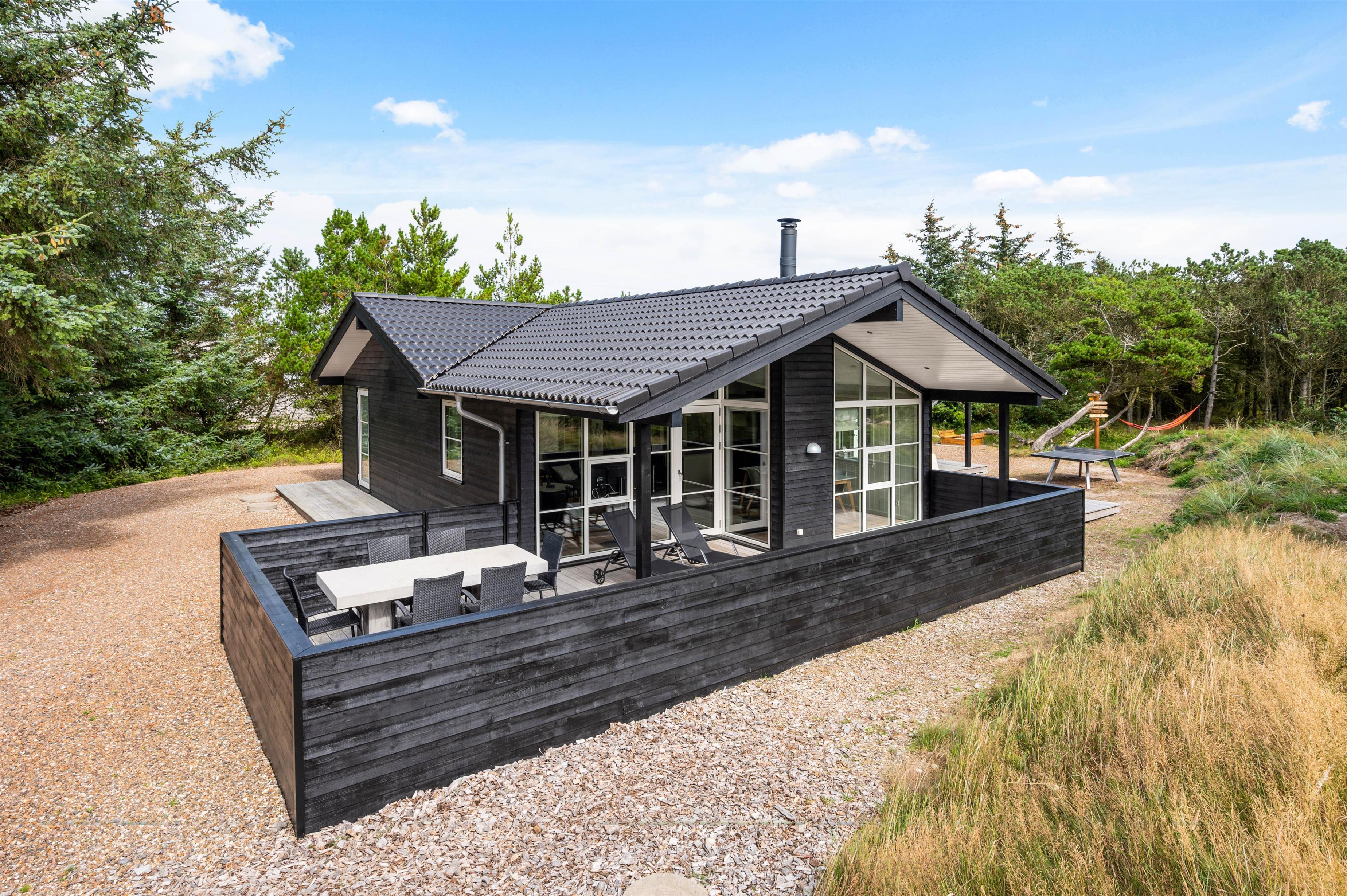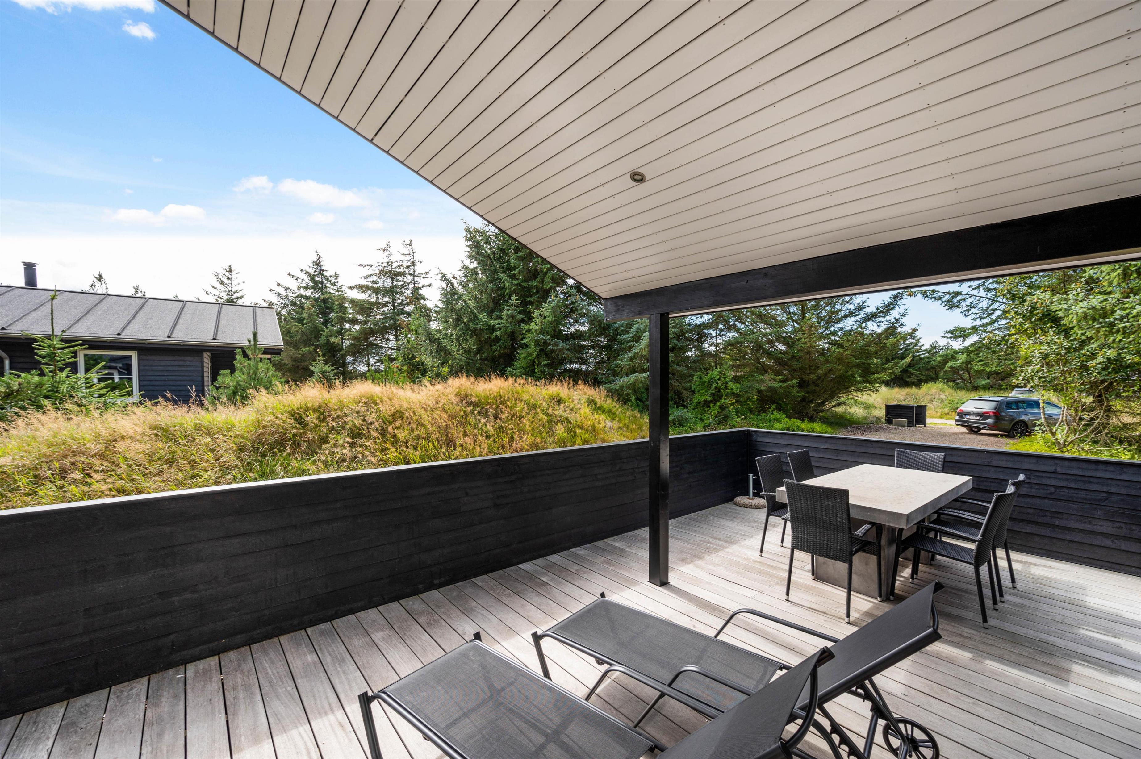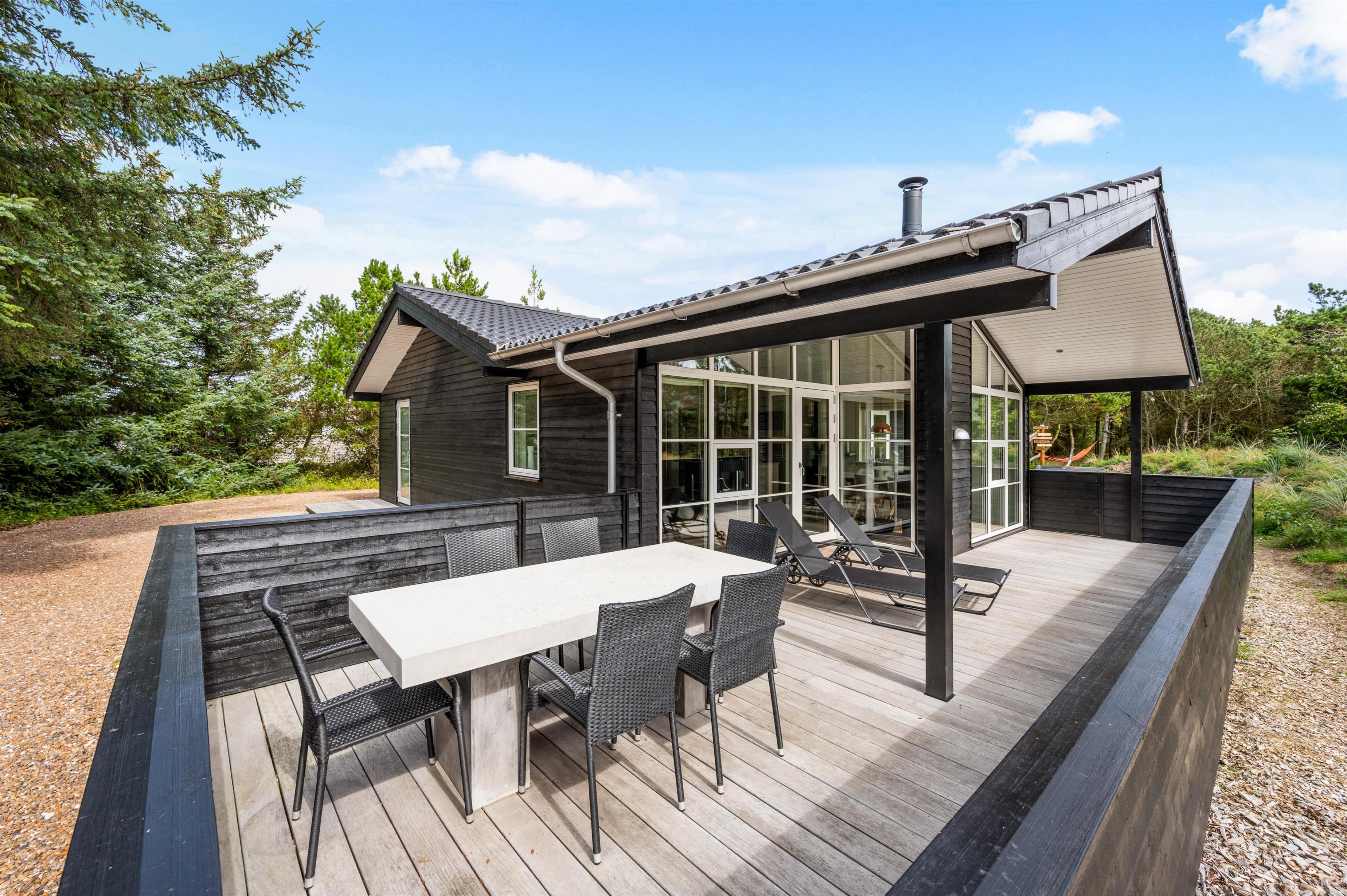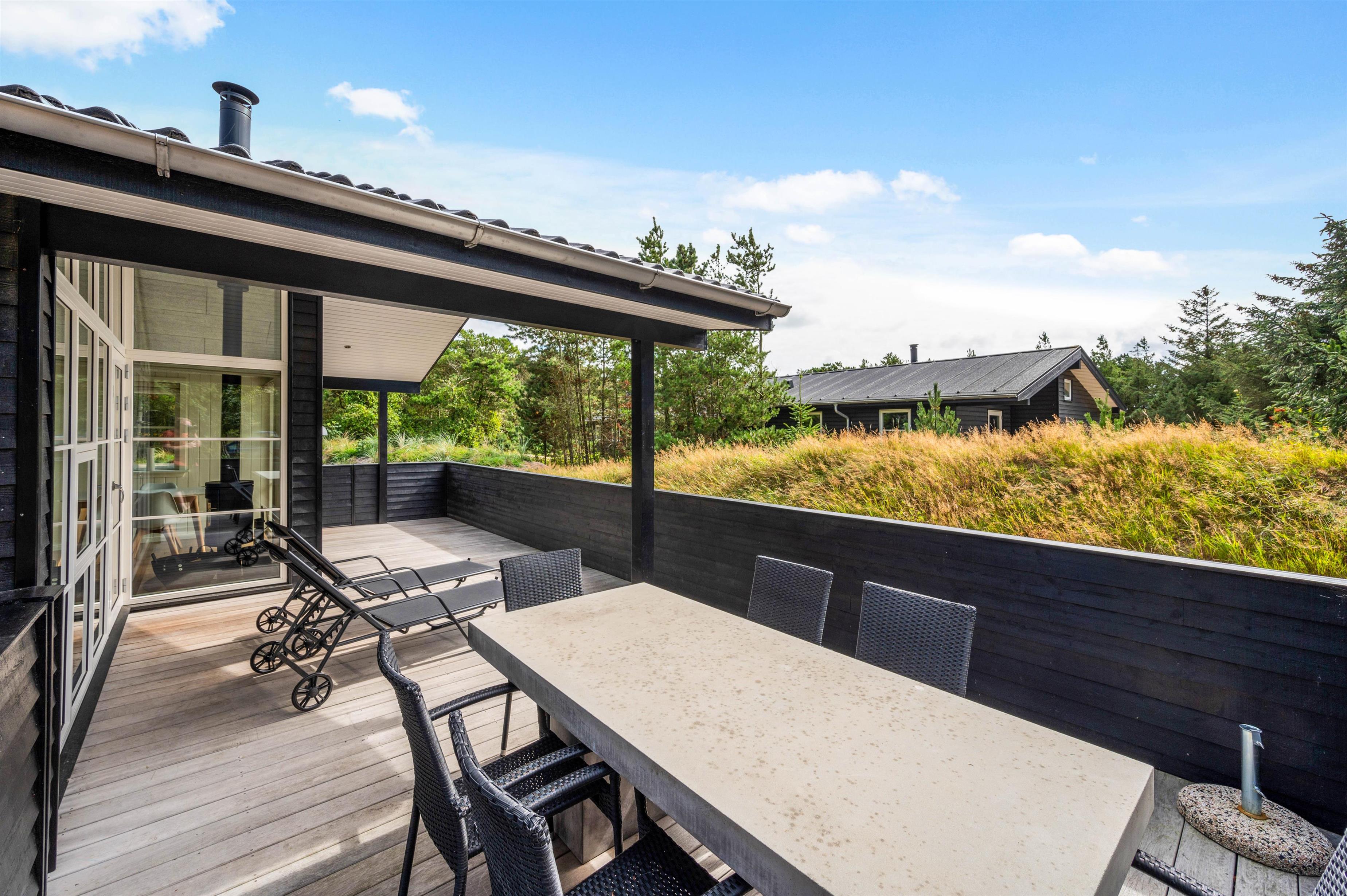 Feriehuset har en dejlig beliggenhed, hvor du mod øst har træer og buskads, der giver både læ og privatliv, så du uforstyrret kan sidde ude på terrasserne.