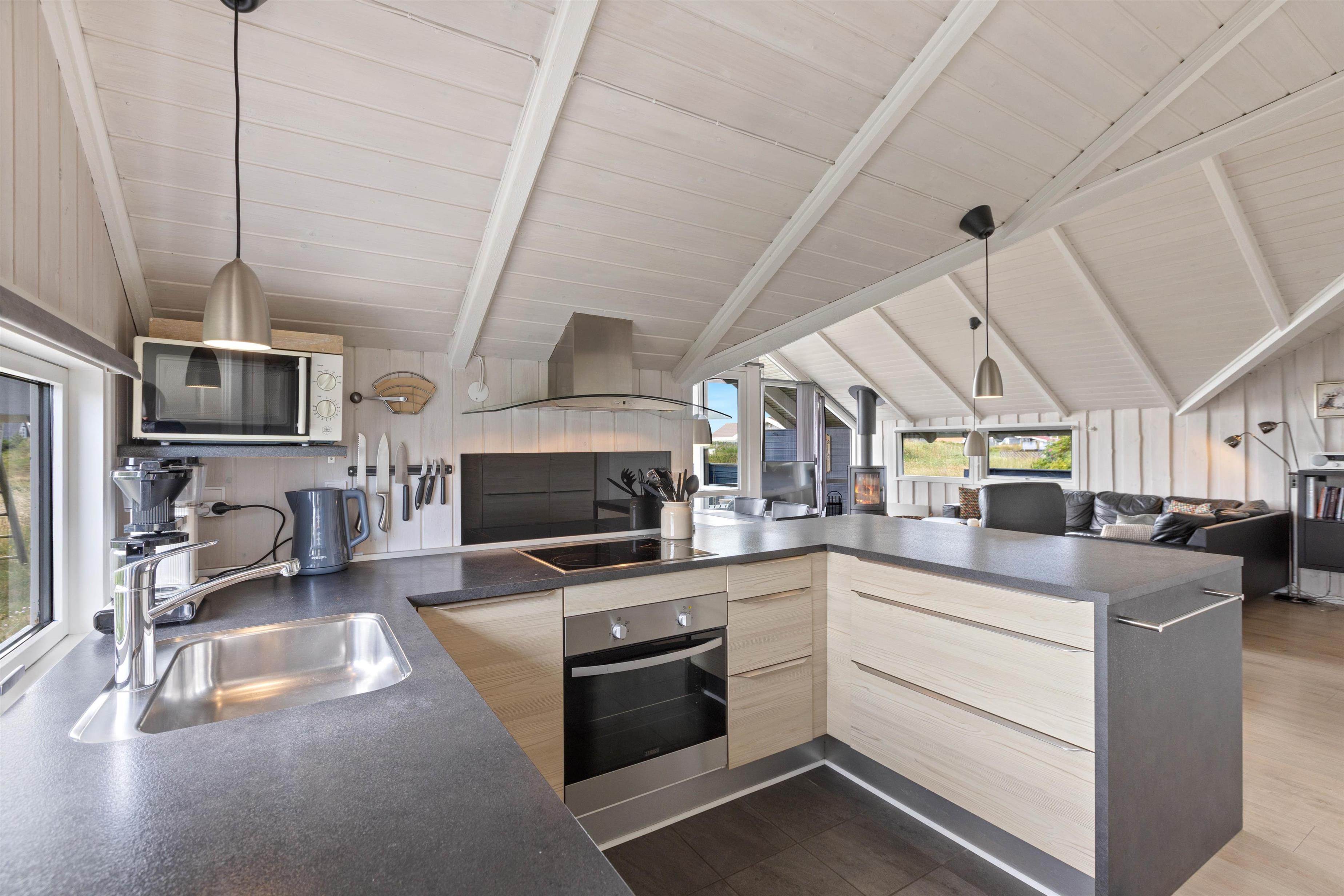 Sommerhuset er 85 m2 og har 3 gode soveværelser, 2 med dobbeltsenge og et med 2 enkeltsenge. I huset råder du over et stort badeværelse med indgang til sauna, bruser og gulvvarme, samt et gæstetoilet. Køkkenet er udstyret med køleskab med lille fryser, opvaskemaskine og mikroovn. Køkkenet er i åben forbindelse med stuen, hvor der overalt er åbent til kip og masser af dejligt lysindfald gennem det store vindues parti mod syd. Stuen er udstyret med bl.a. fladskærm og brændeovn. Her er også gratis trådløst internet.