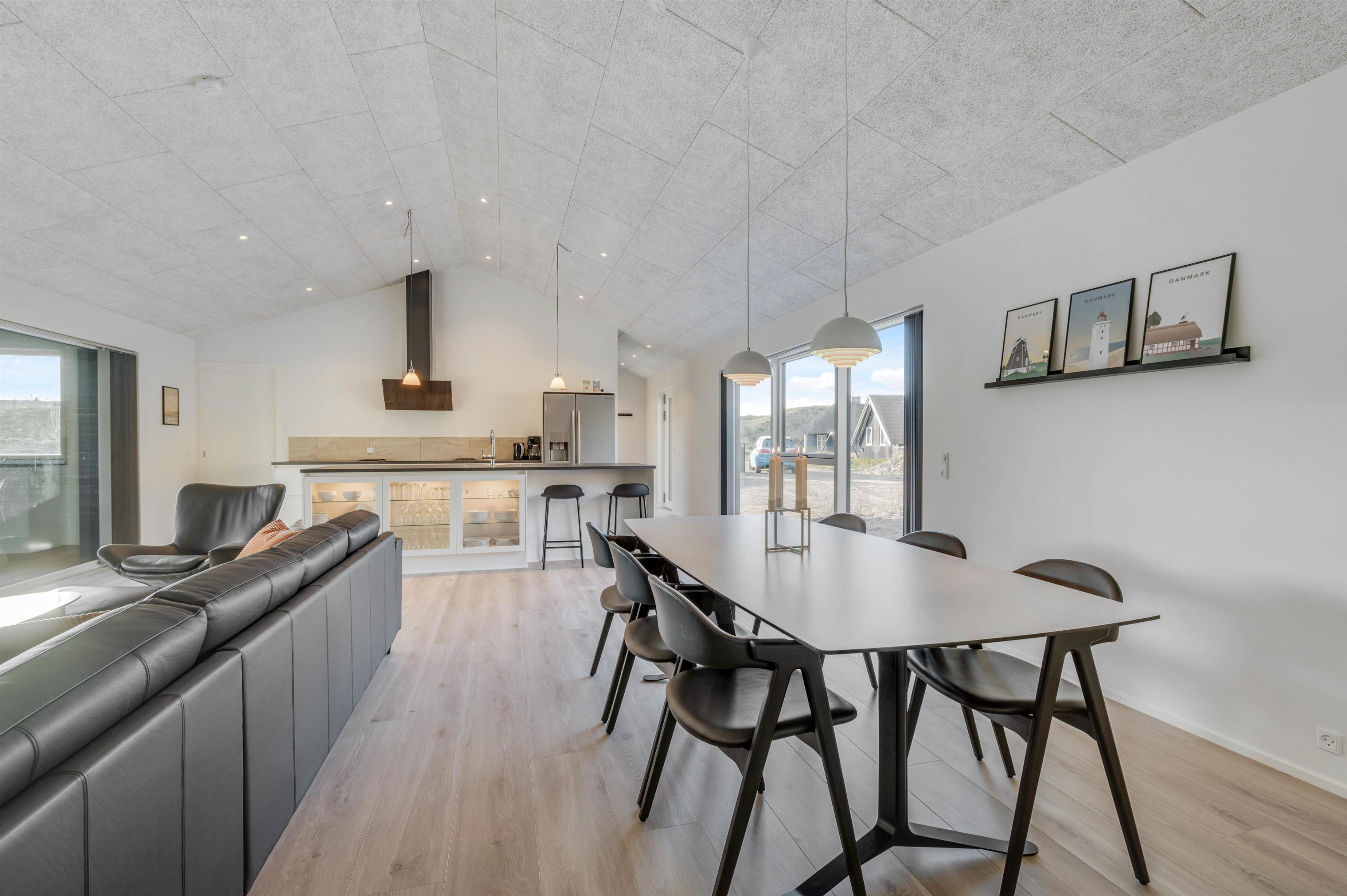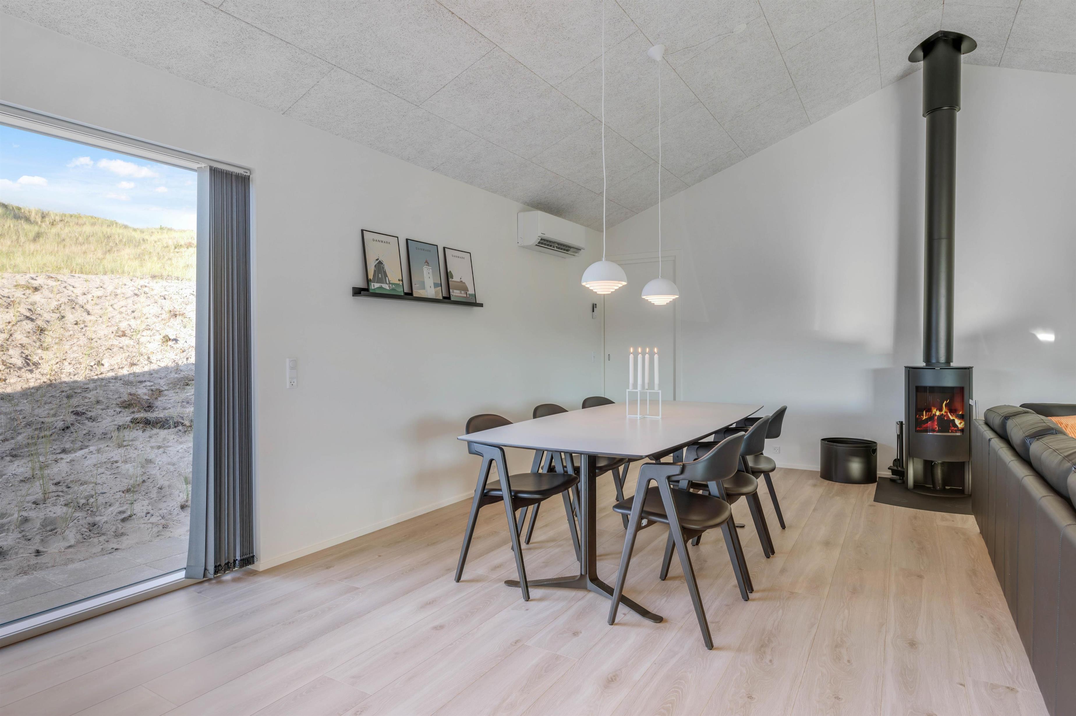 Sommerhuset er opført i 2021 og fremstår særdeles lyst og indbydende. Her venter jer en gennemført, moderne og hyggelig indretning, som danner rammerne for en fantastisk ferie på Vestkysten. Blandt andet er køkkenet indrettet med et amerikanerkøleskab. De store vinduer i feriehuset skaber et rigtig godt lysindfald og giver en fantastisk udsigt til den omkringliggende natur.