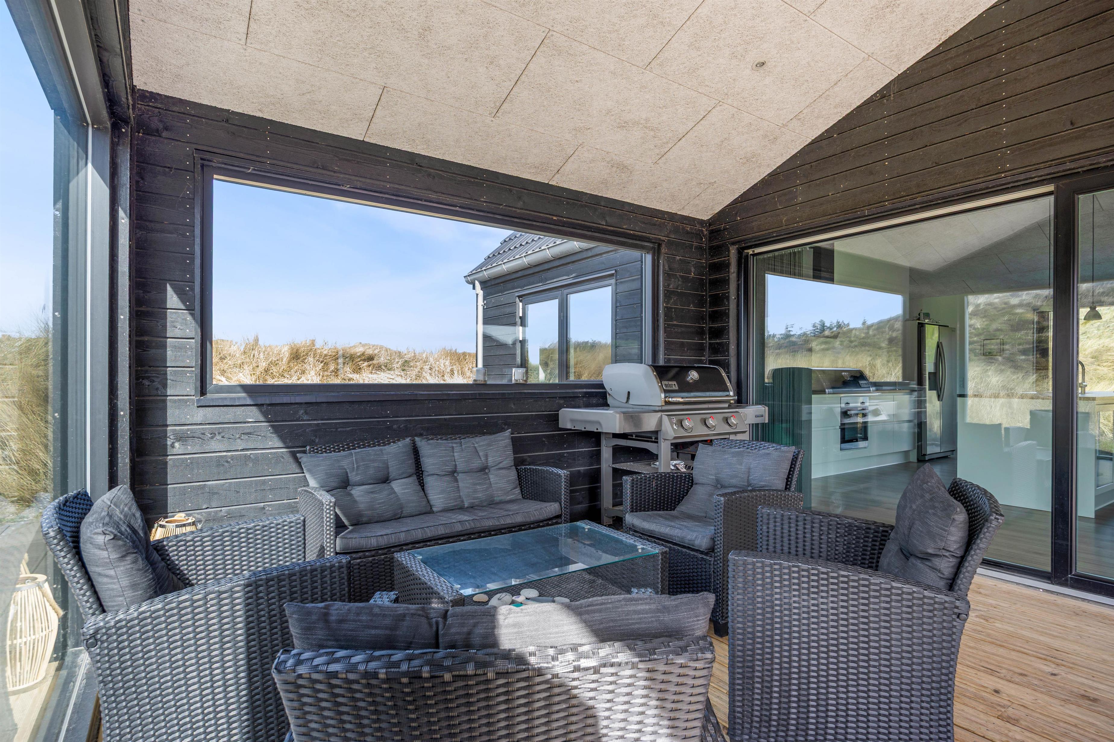 Fra opholdsrummet har I direkte udgang til den store, sydvendte terrasse. Den er lukket og delvist overdækket, så I kan sidde i ly på en regnvejrsdag eller nyde middagssolen på en lun sommerdag. Feriedagene kan nydes i de gode havemøbler og liggestole og gasgrill som I finder på den lækre terrasse, hvor I også kan lave et lækkert grillmåltid.