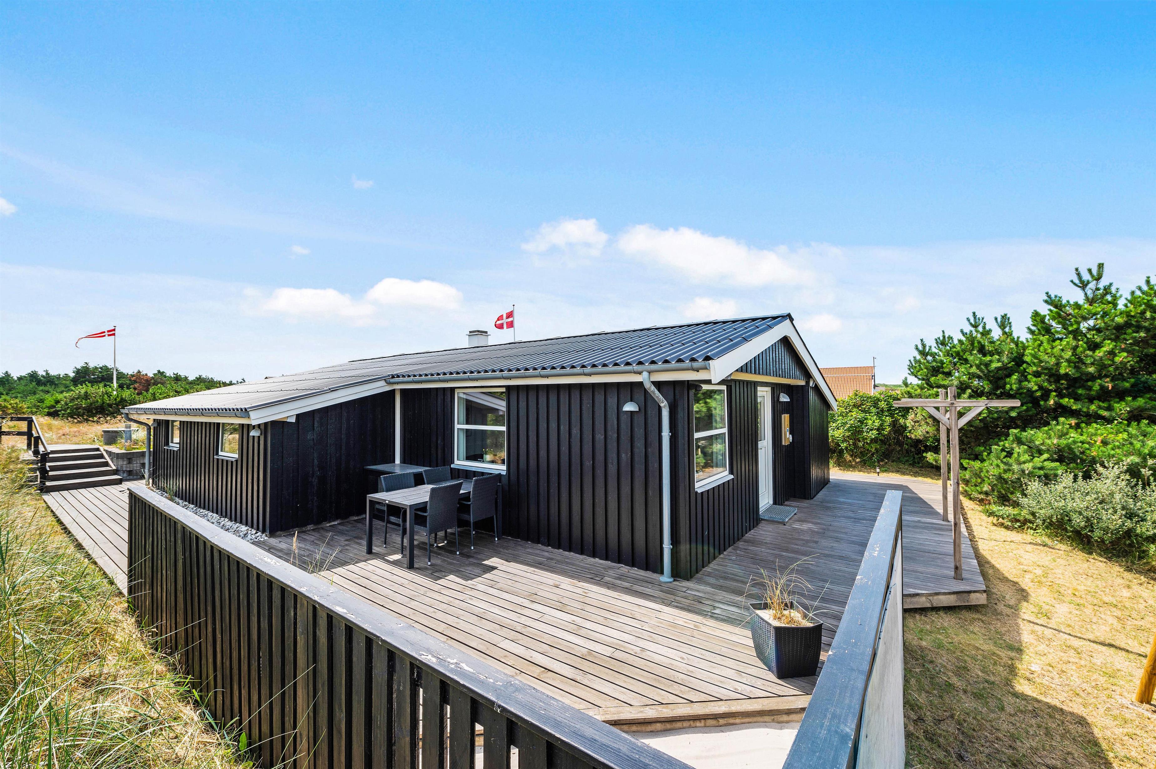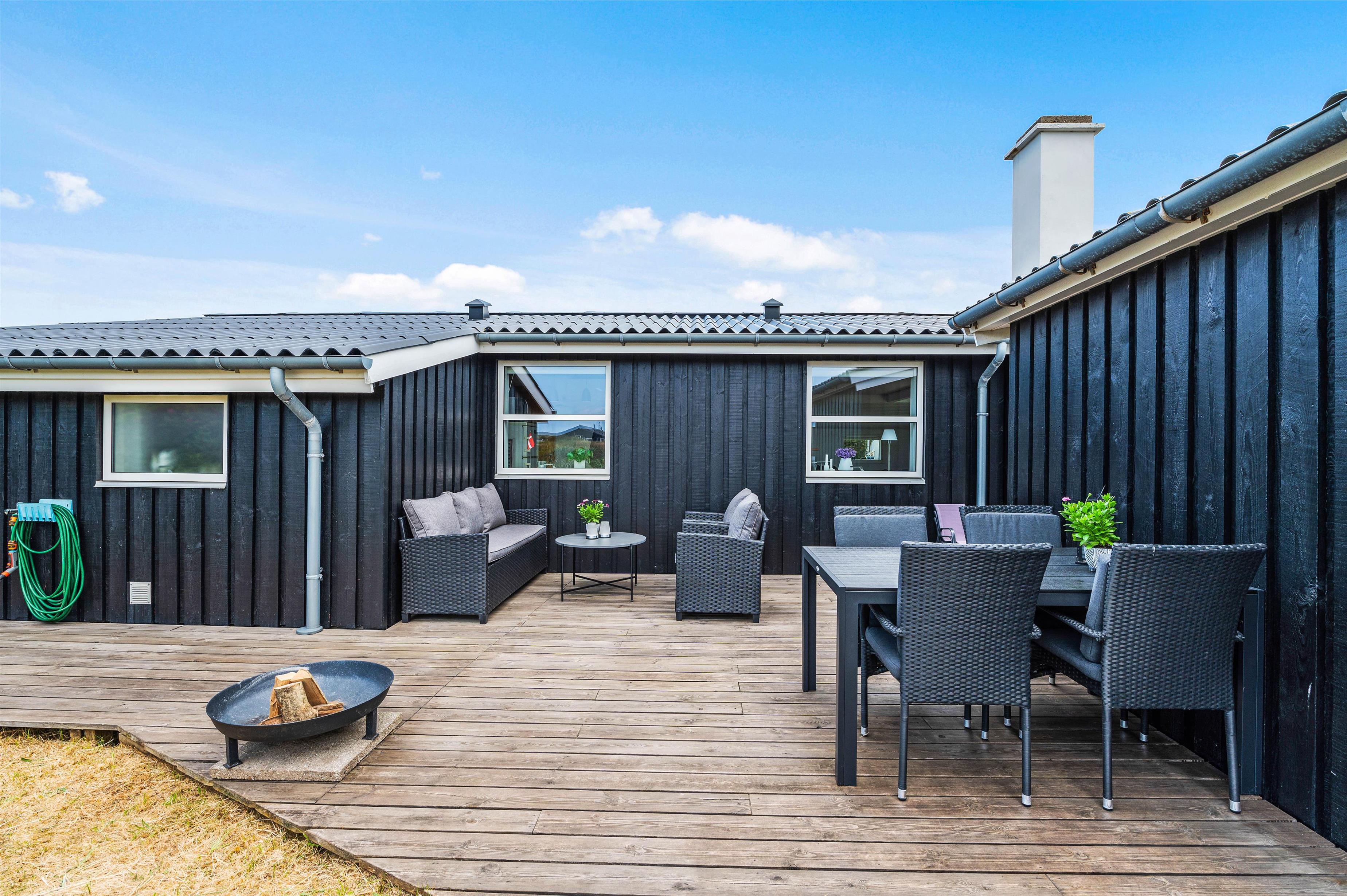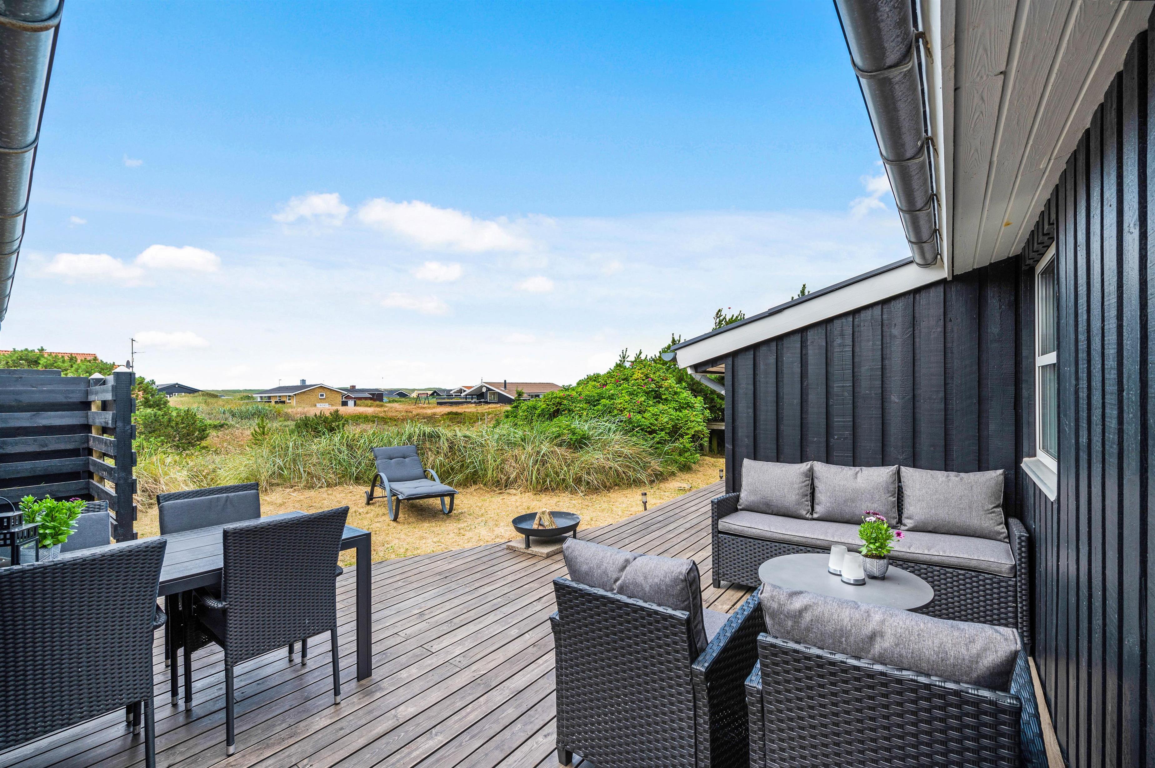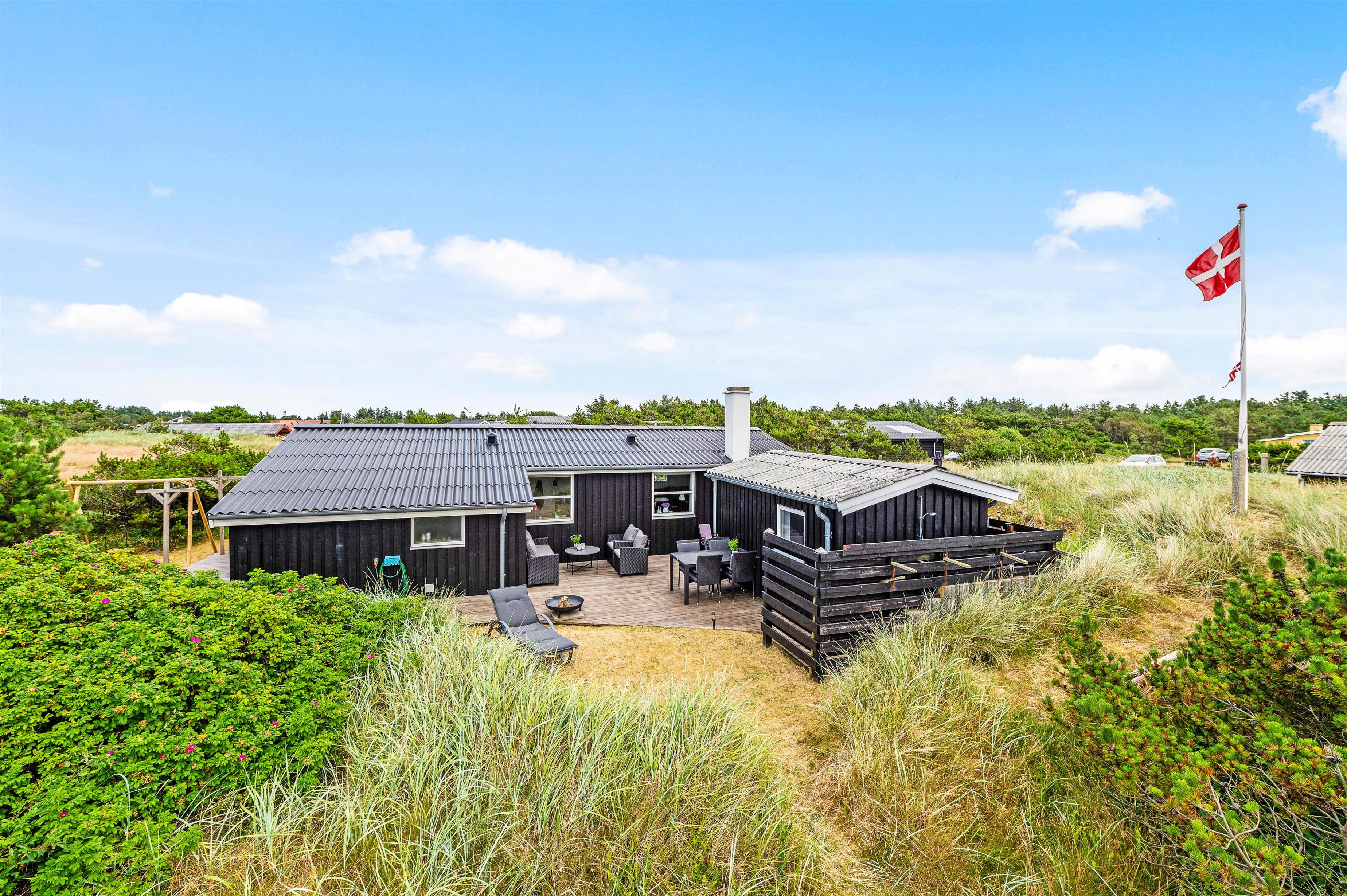 Feriehuset ligger på en dejlig nedsænket naturgrund, så de små klitter omkring sommerhuset giver god læ og sørger for, at I uforstyrret kan sidde ude på terrassen. Hele vejen rundt om feriehuset er der anlagt en god terrasse, så uanset hvor vinden kommer fra, vil I altid kunne finde et godt sted med læ og sidde ude.